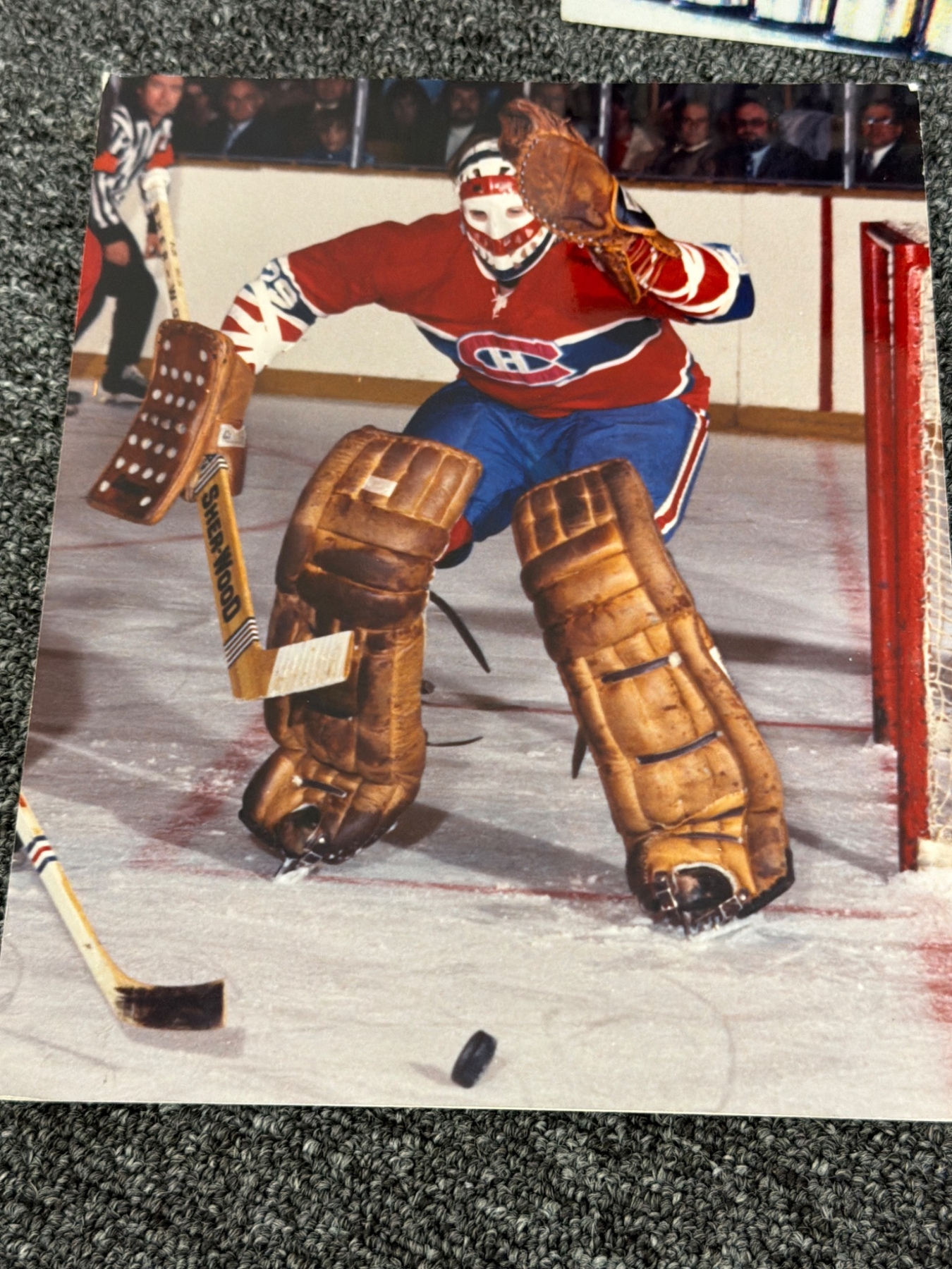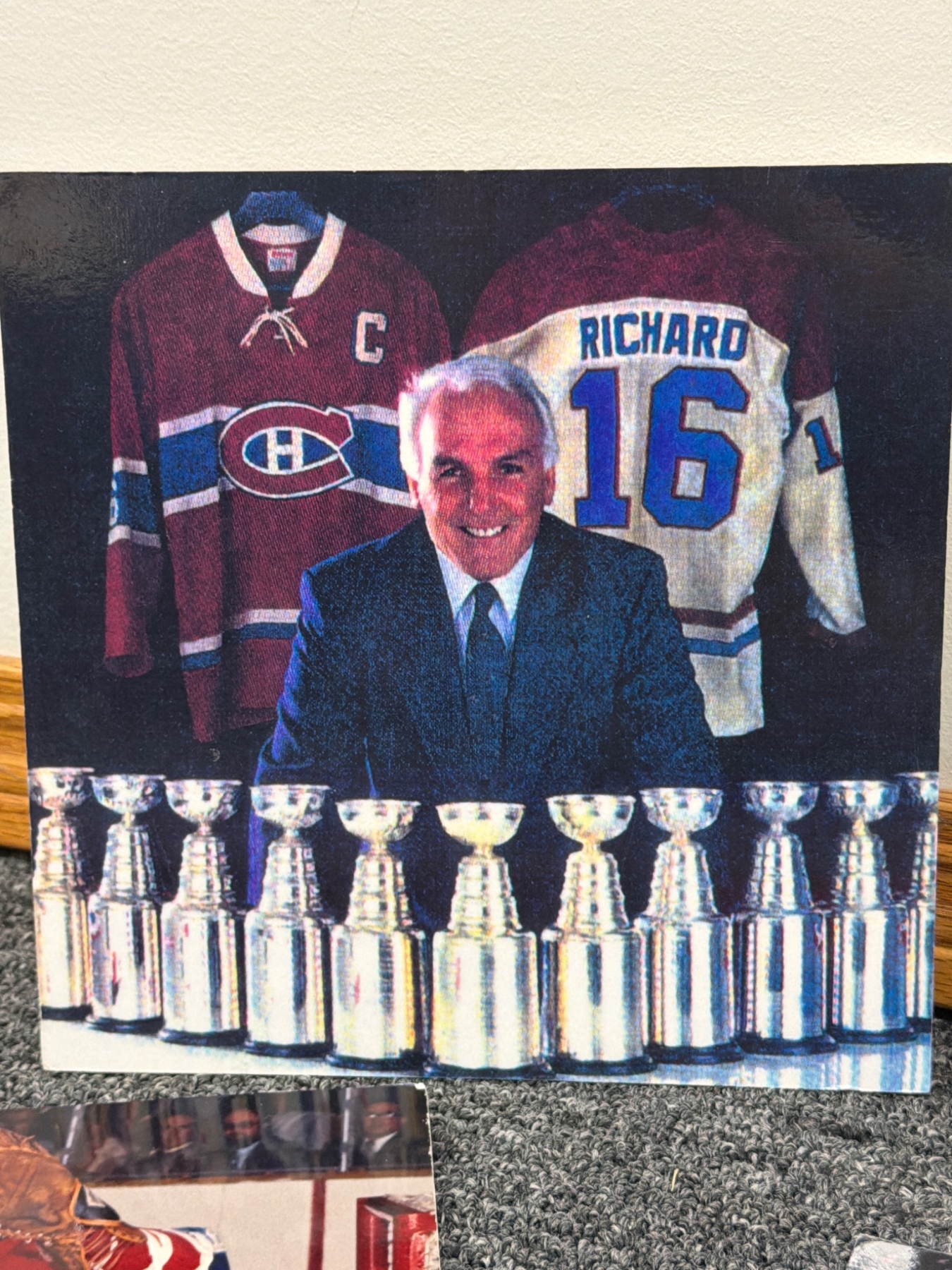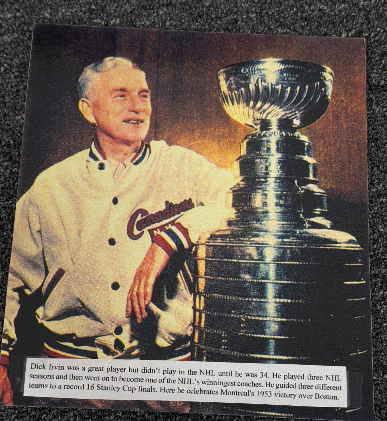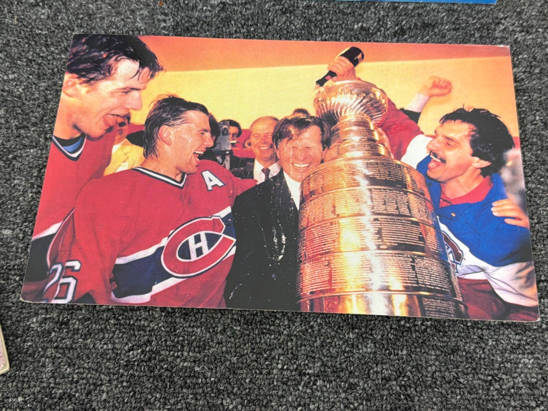 A unique set of six photographs showcasing the rich history of the Montreal Canadiens with the Stanley Cup. Included are team portraits, moments of victory, and iconic players. Highlights include legendary figures like Dick Irvin and representations of championship wins. Ideal for hockey fans or collectors of NHL memorabilia.
