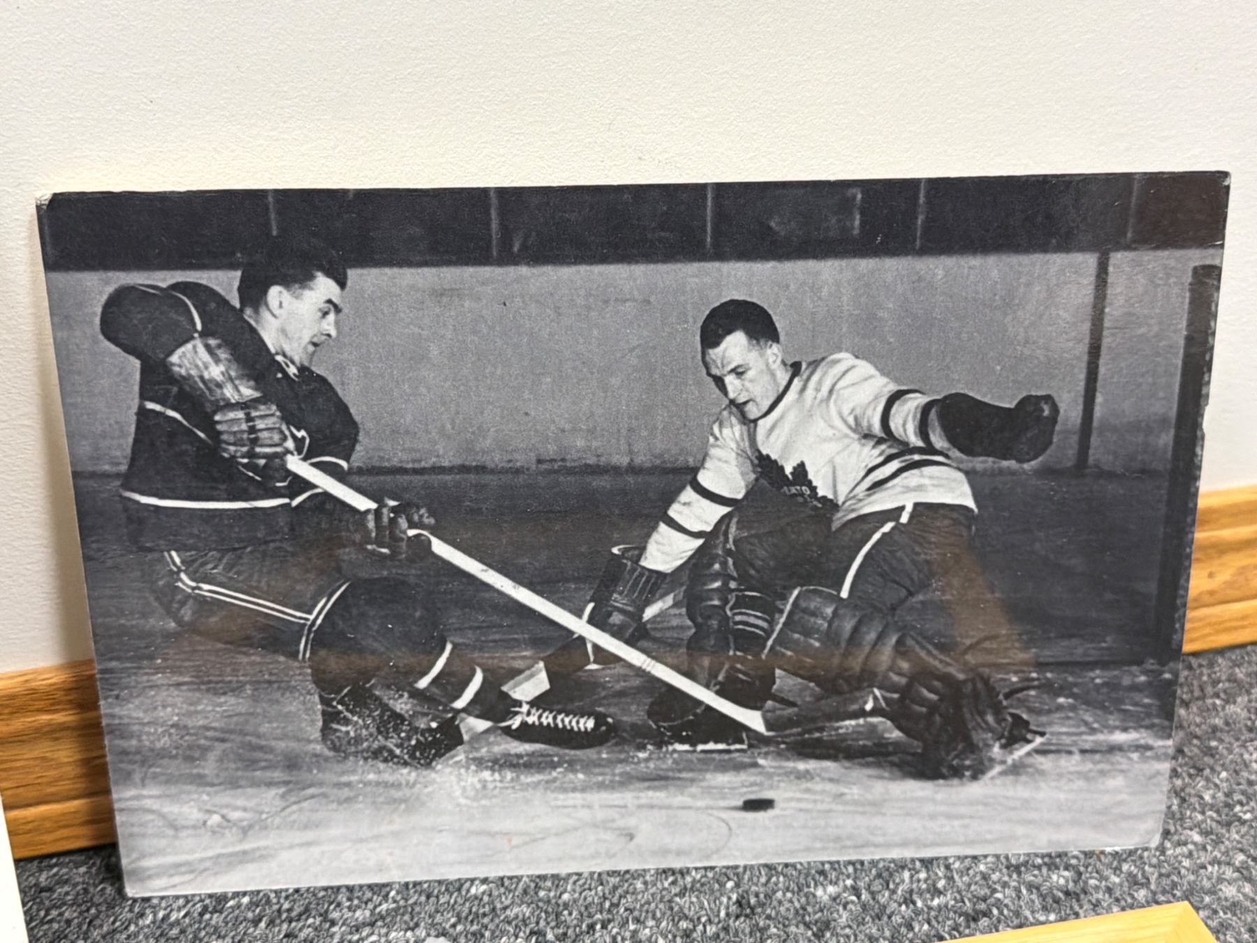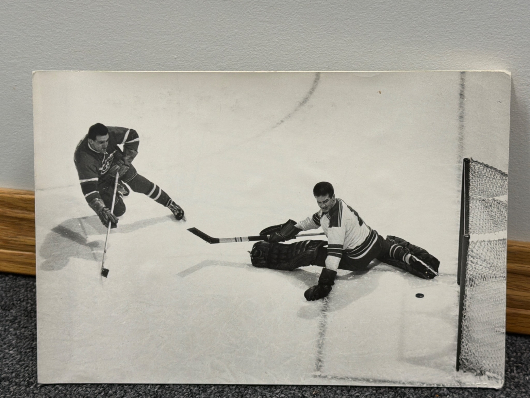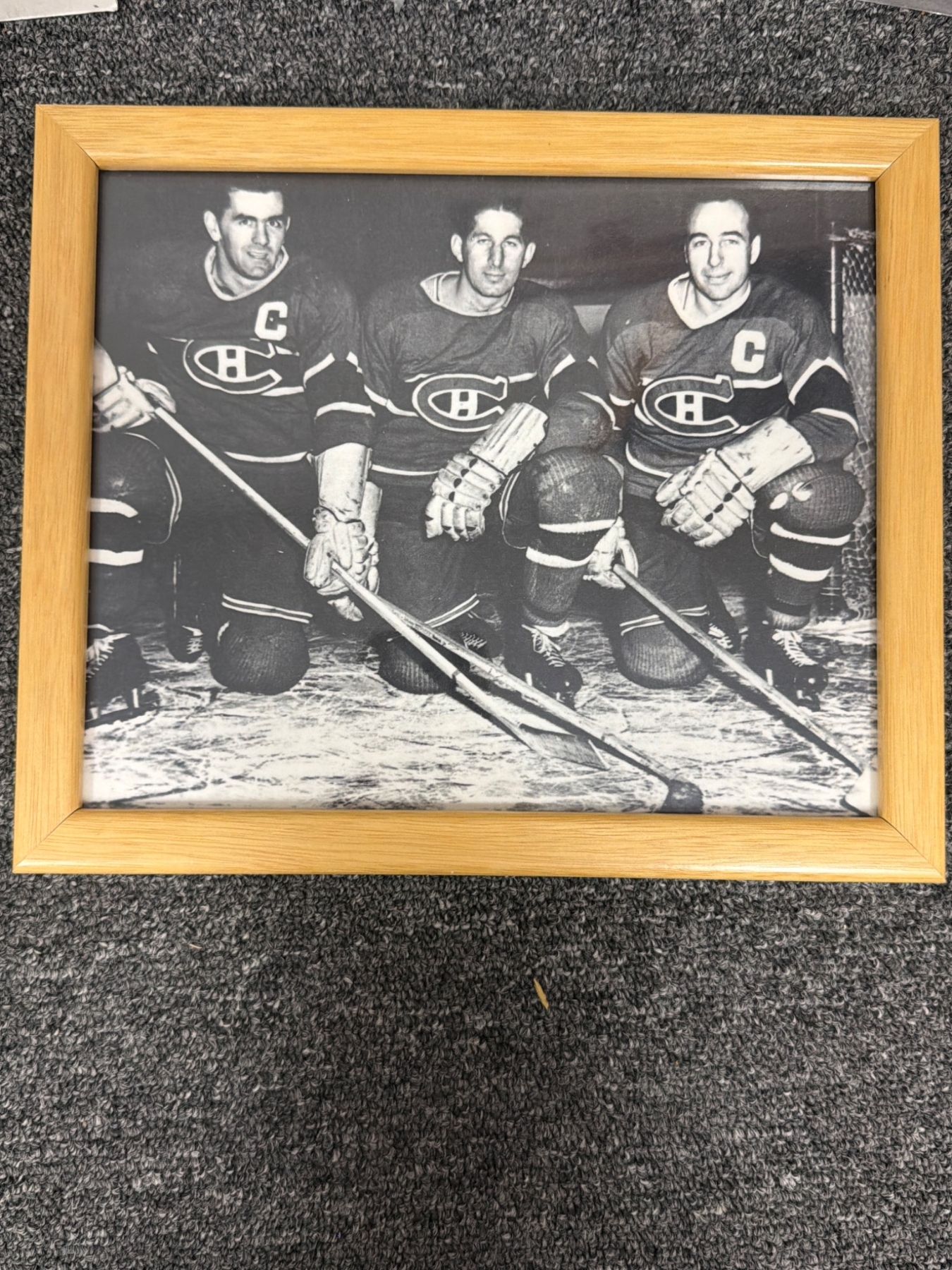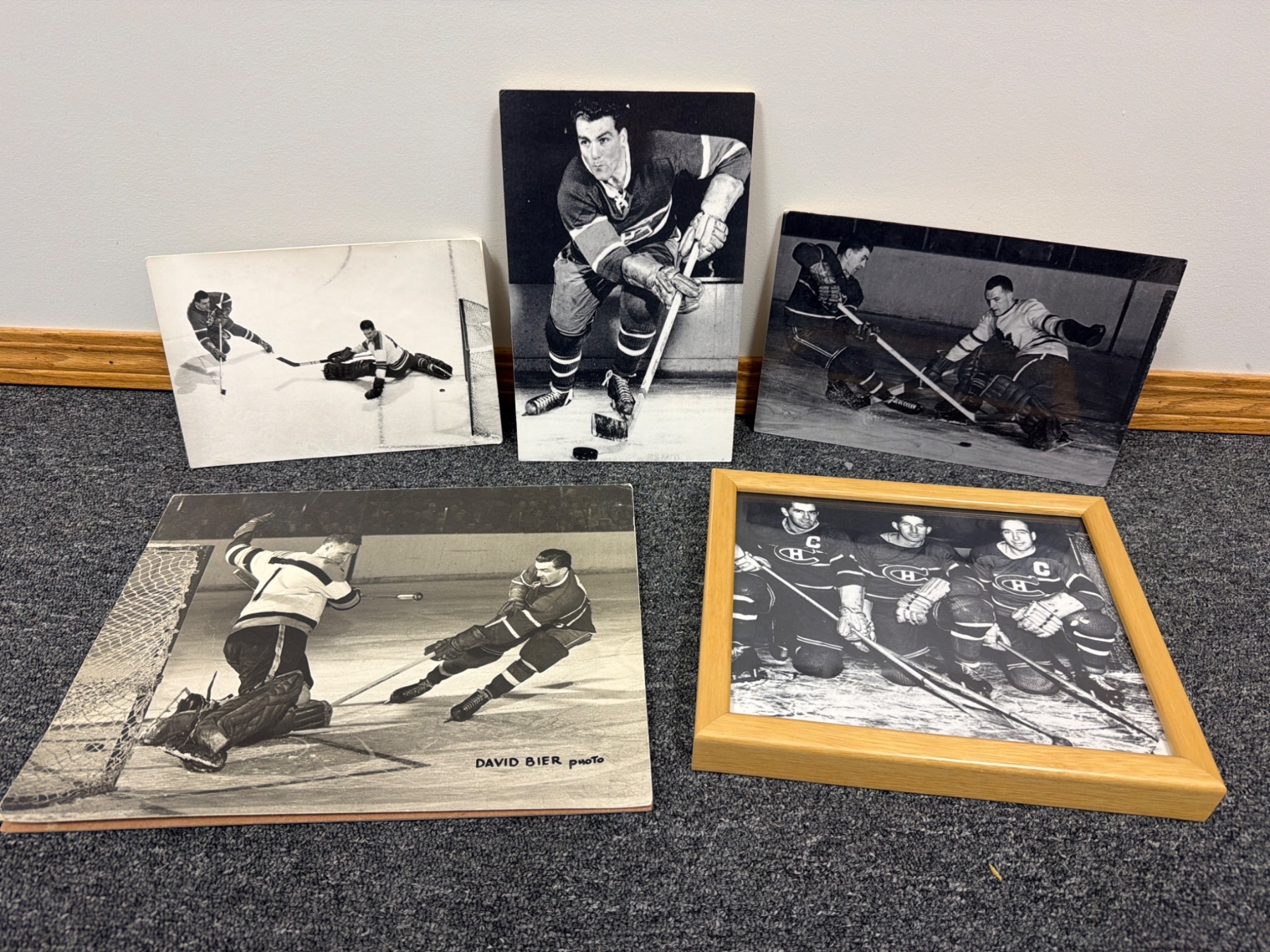 Six black-and-white photographs featuring Maurice "Rocket" Richard and the Montreal Canadiens, showcasing iconic in-game and posed moments. Includes some framed pieces and handwritten inscriptions on the reverse, adding unique historical context. Perfect for admirers of NHL history or collectors of Montreal Canadiens memorabilia.
