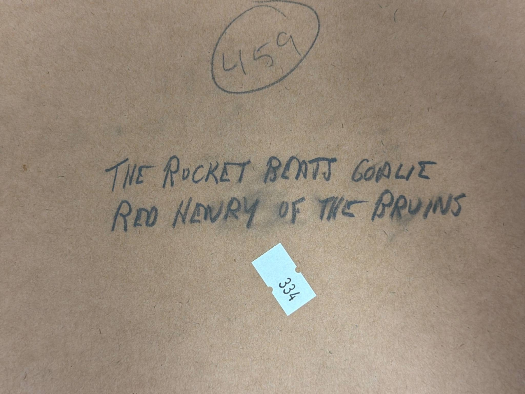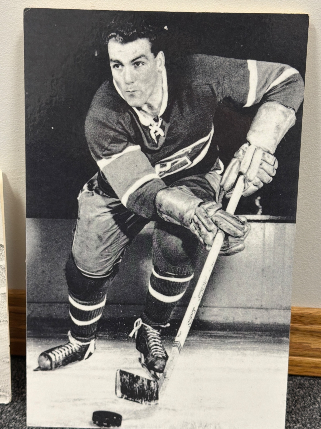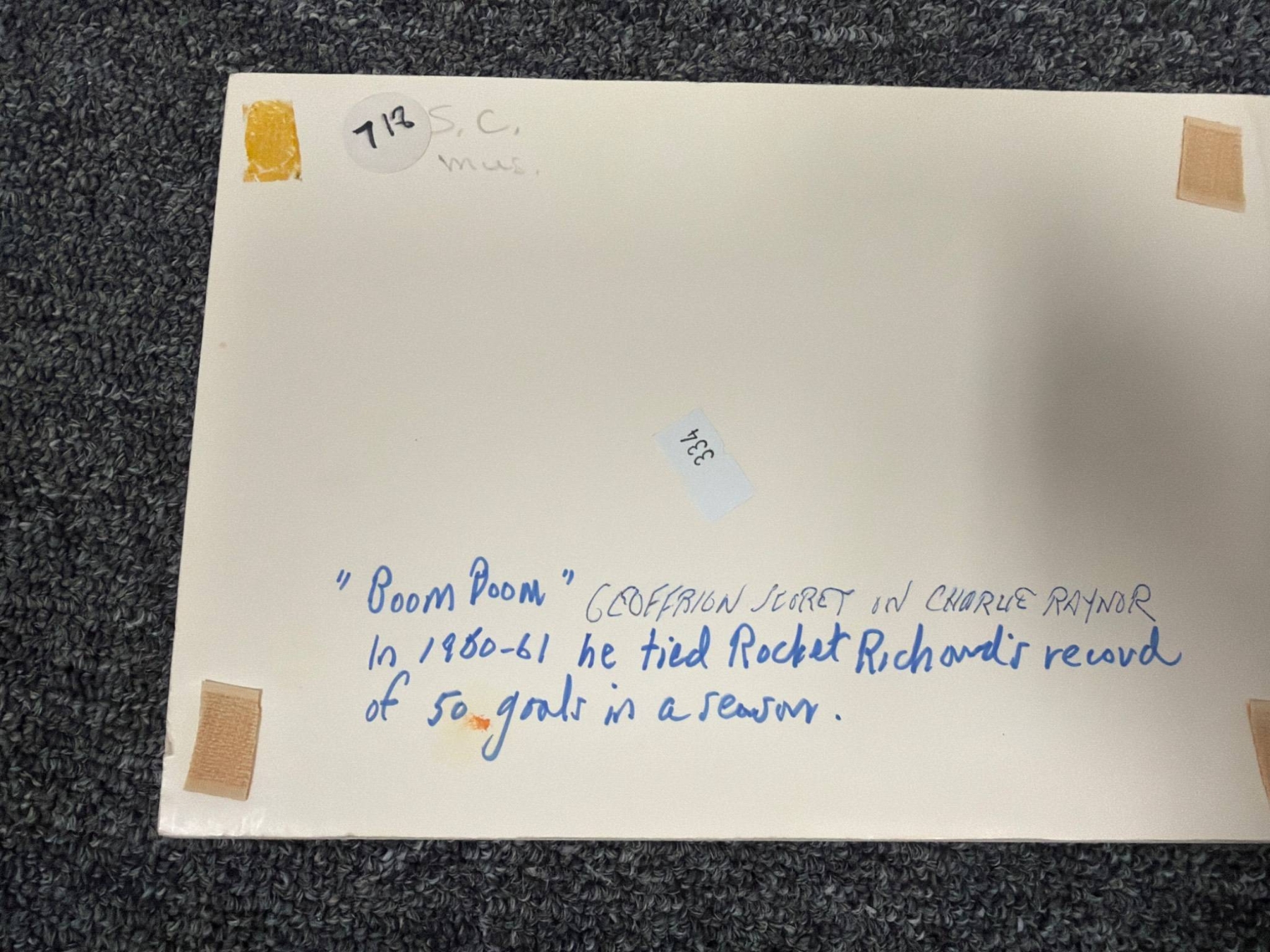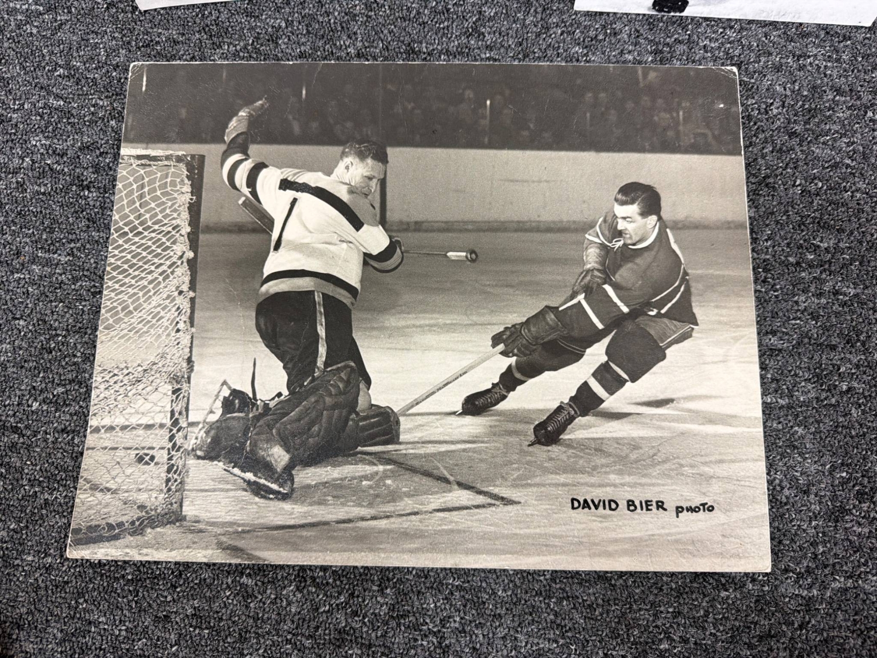 Six black-and-white photographs featuring Maurice "Rocket" Richard and the Montreal Canadiens, showcasing iconic in-game and posed moments. Includes some framed pieces and handwritten inscriptions on the reverse, adding unique historical context. Perfect for admirers of NHL history or collectors of Montreal Canadiens memorabilia.