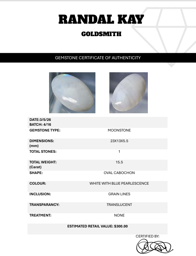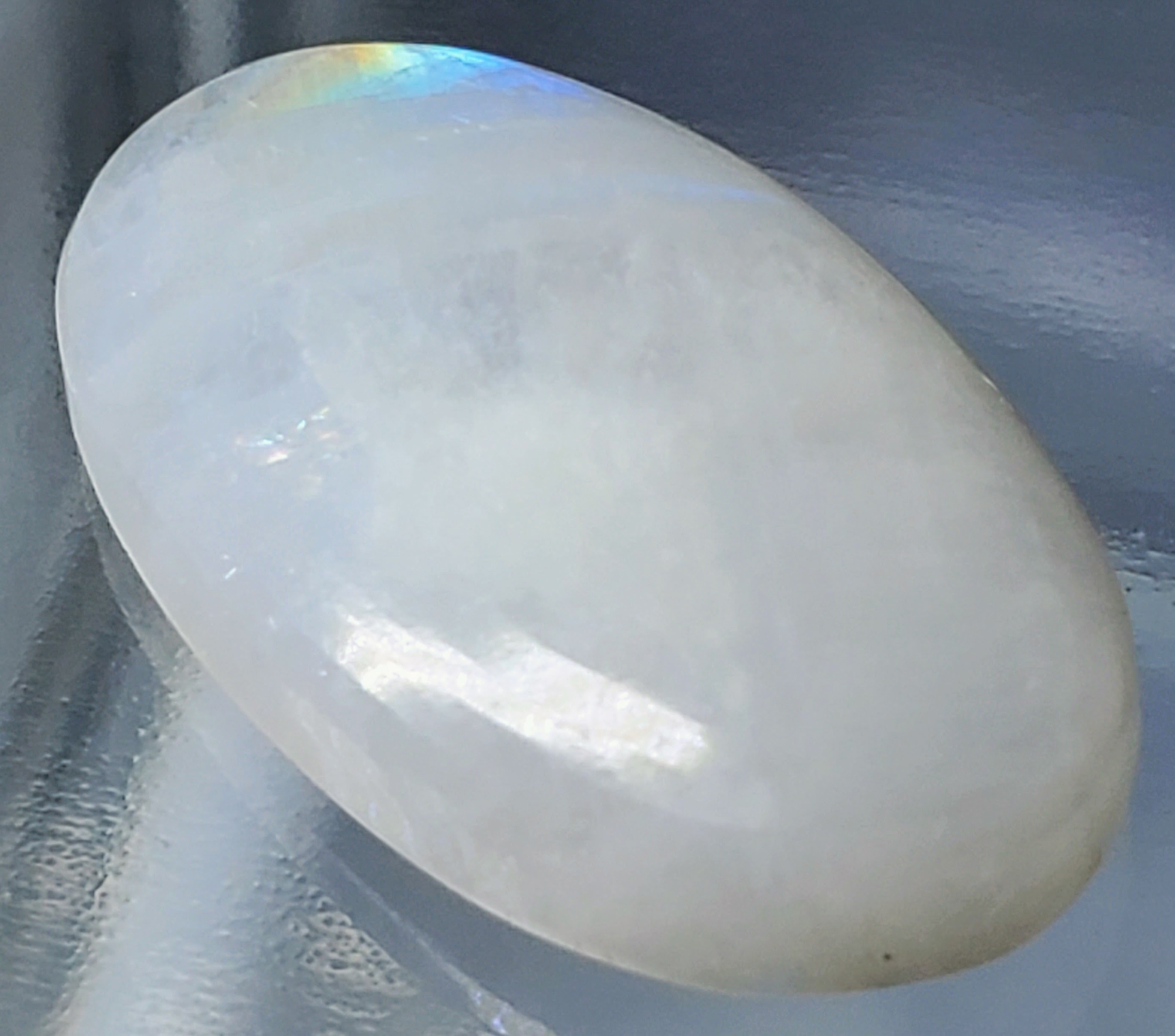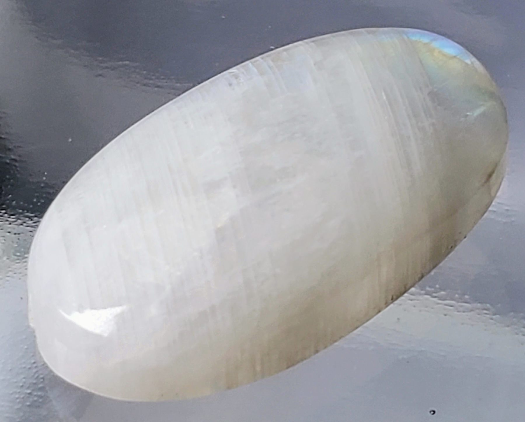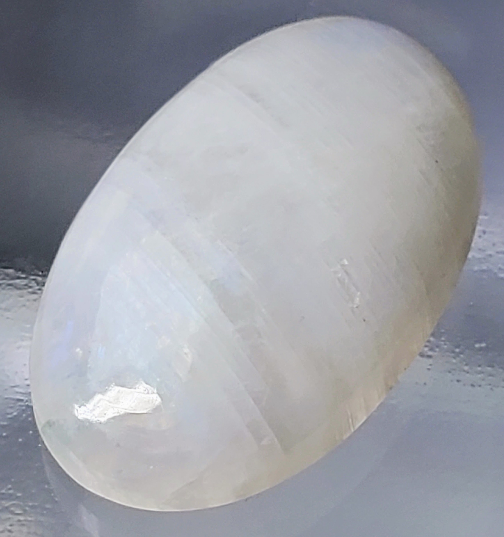 A 15.5-carat moonstone cabochon with white body, blue pearlescence, and natural grain lines. Translucent and untreated, it glows beautifully. Estimated retail price is $300.
