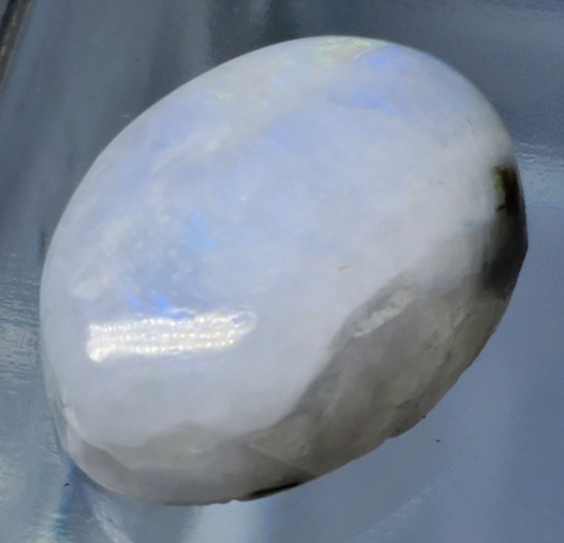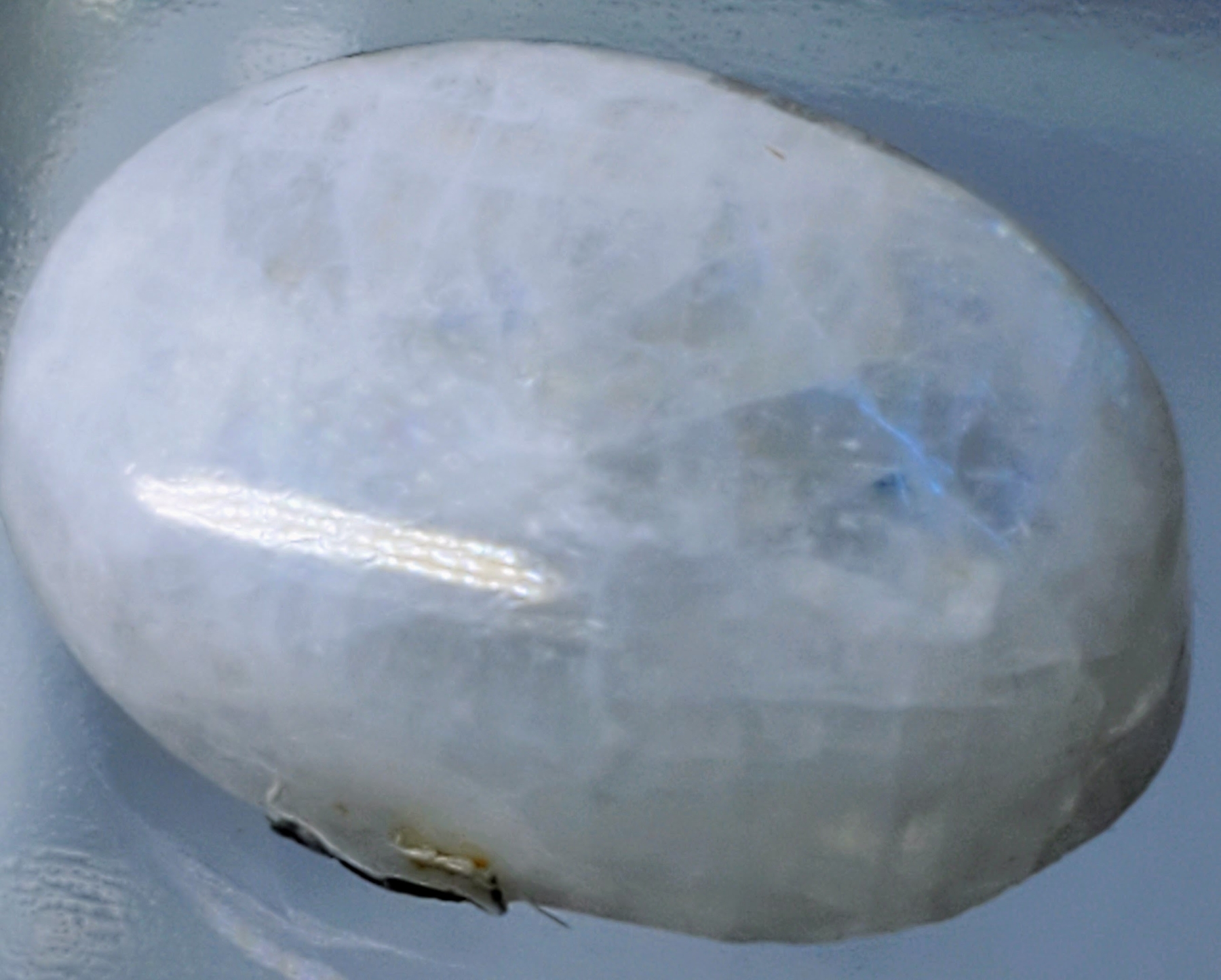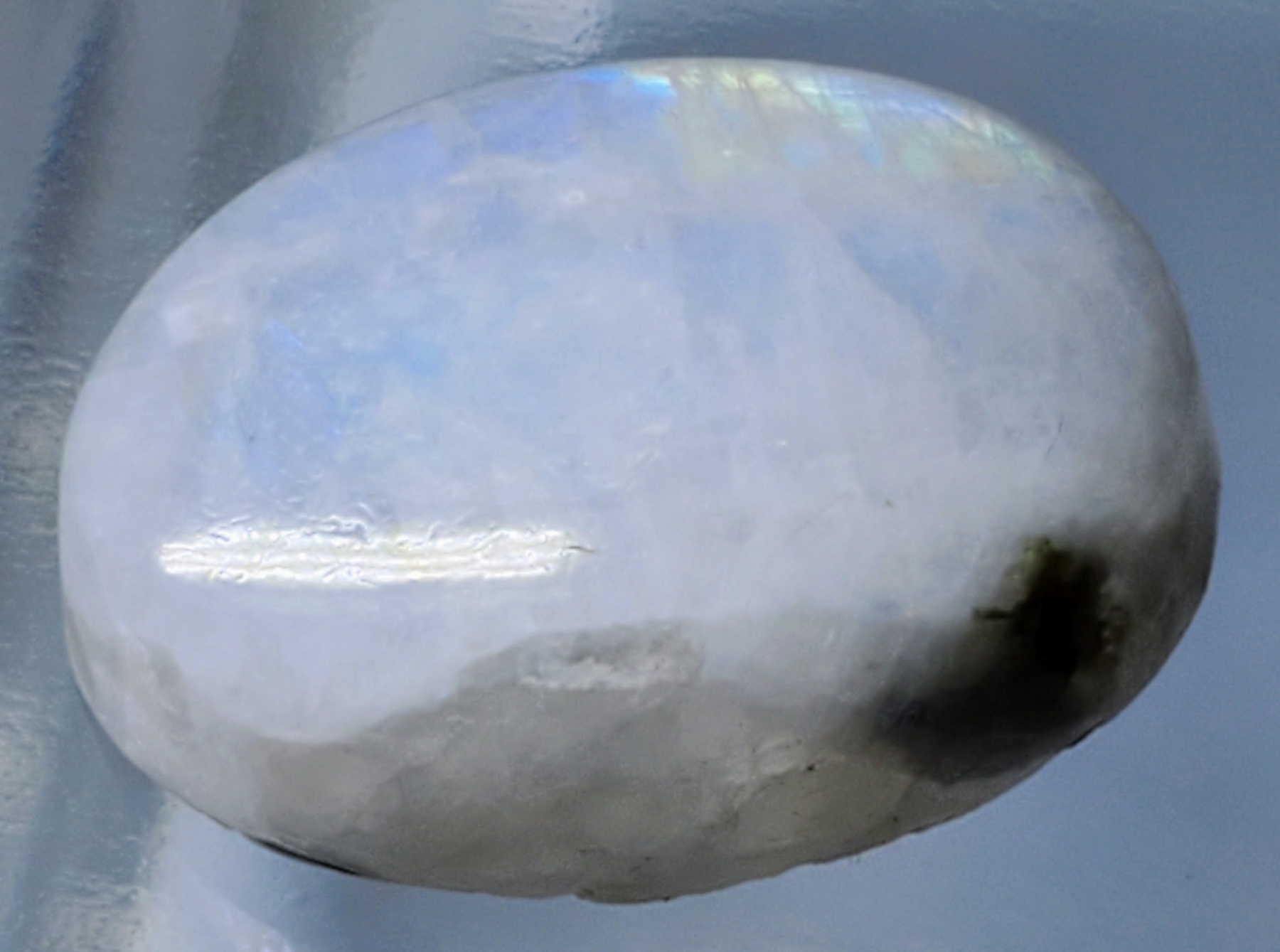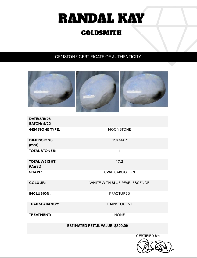 A 17.2-carat moonstone cabochon showing white body color with blue pearlescence, translucent glow, and natural fractures. Untreated and luminous. Estimated retail price is $300.