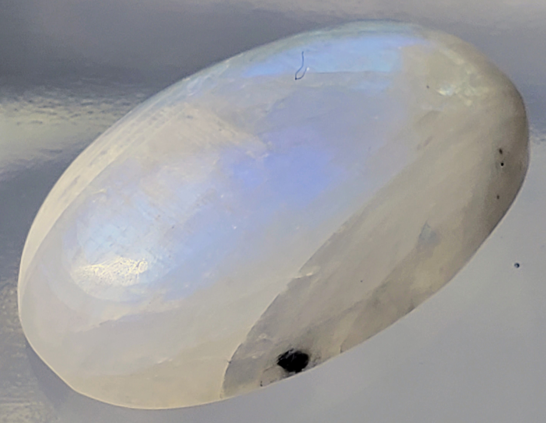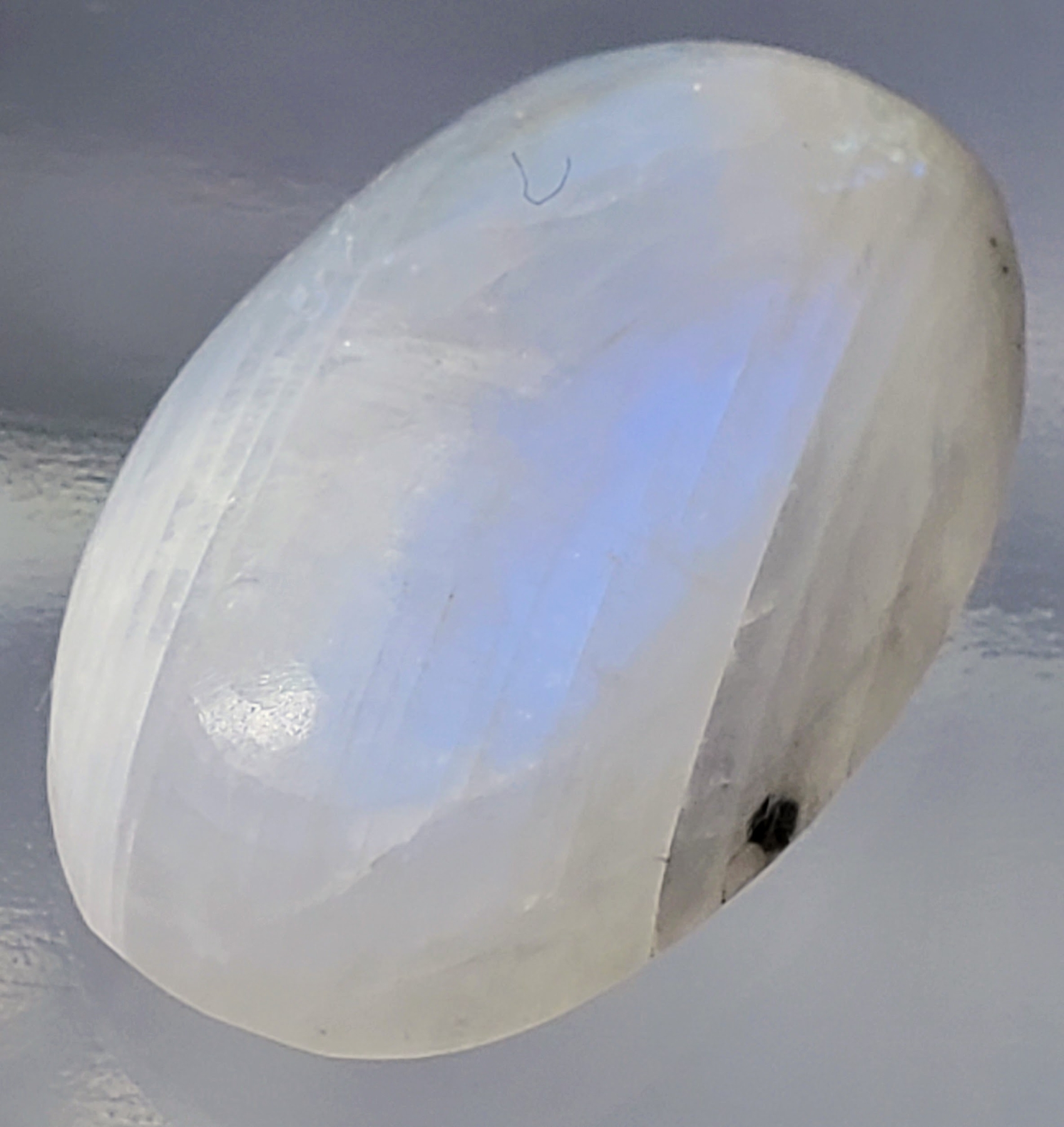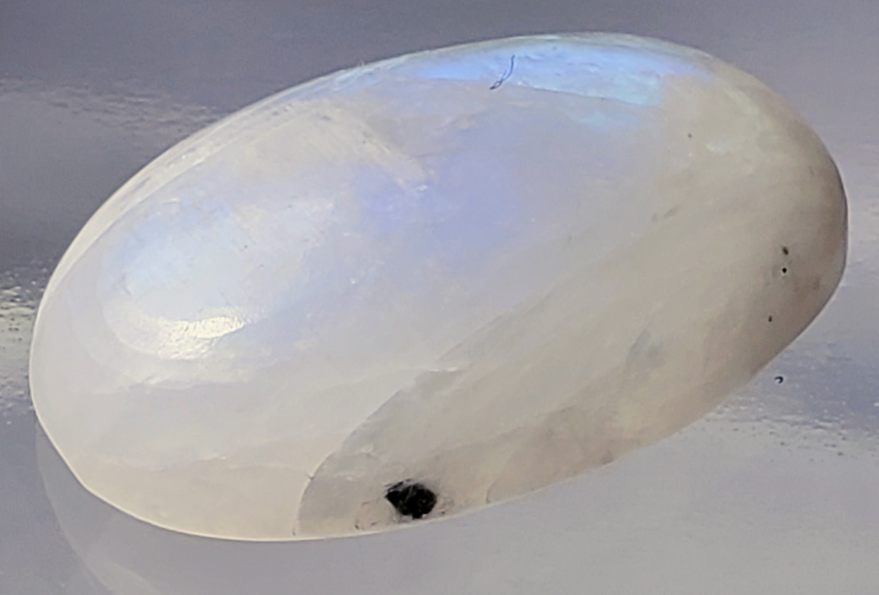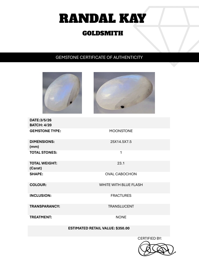 A 23.1-carat moonstone cabochon featuring strong blue flash, translucent body, and natural fractures. Untreated and radiant with ethereal glow. Estimated retail price is $350.
