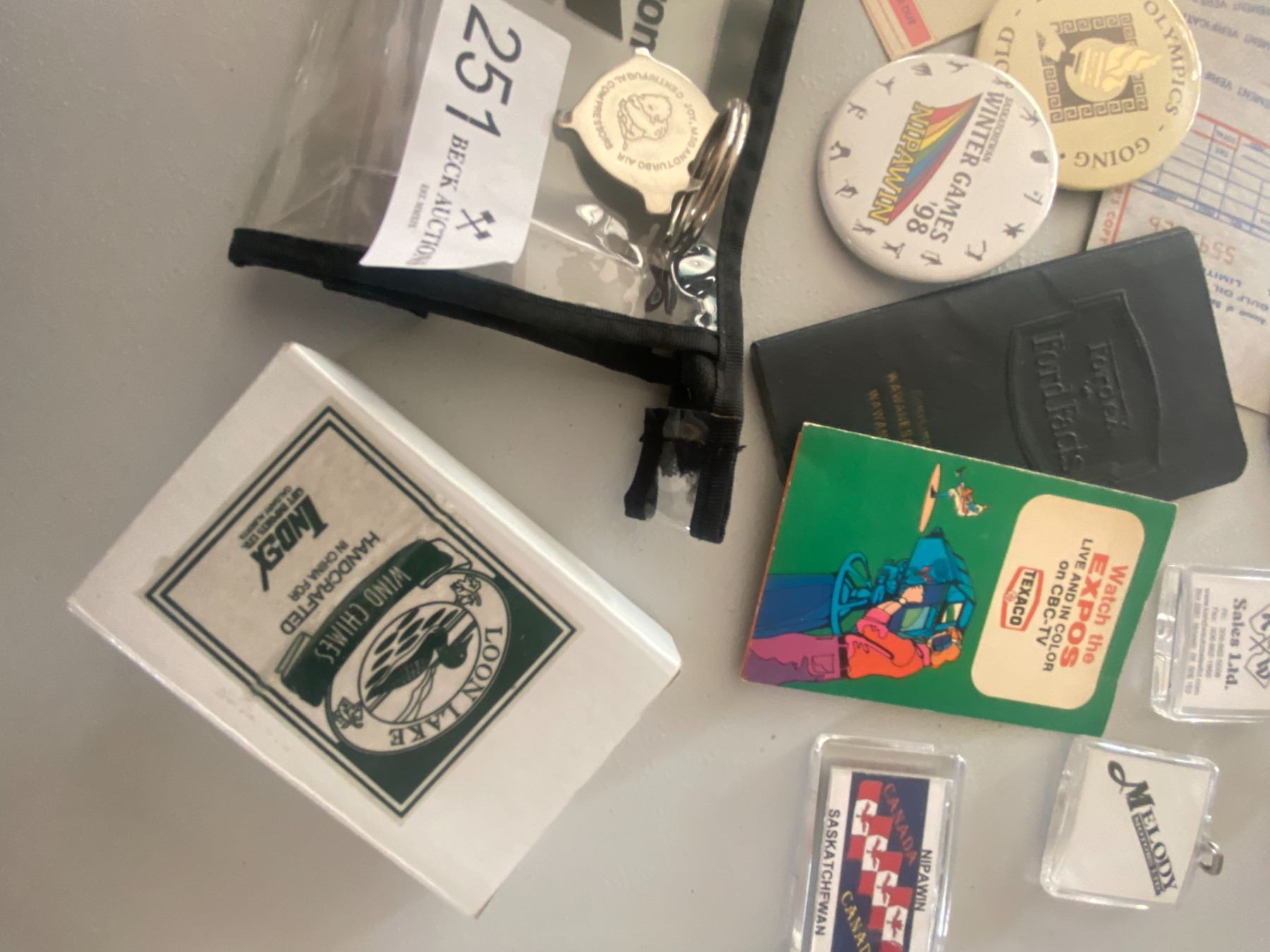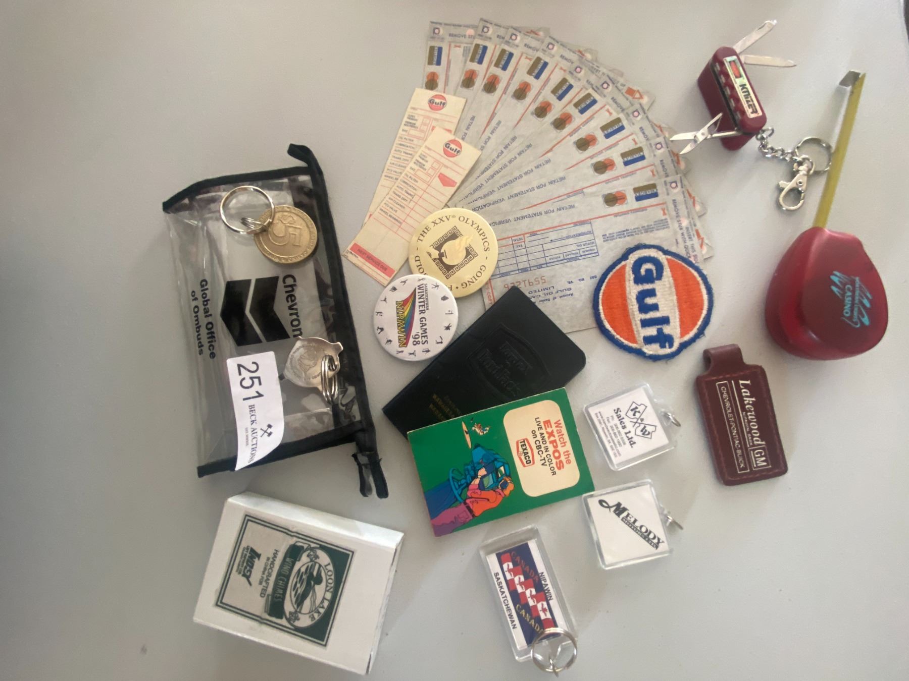 Multiple Gulf items and keepsakes, keychains, tapemeasure, pocket knife, playing card & Pins