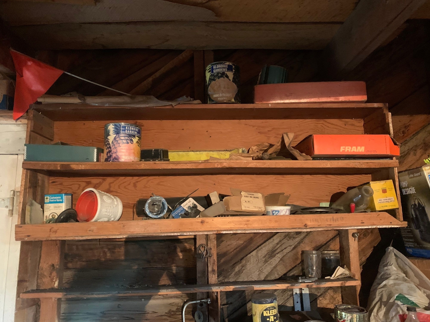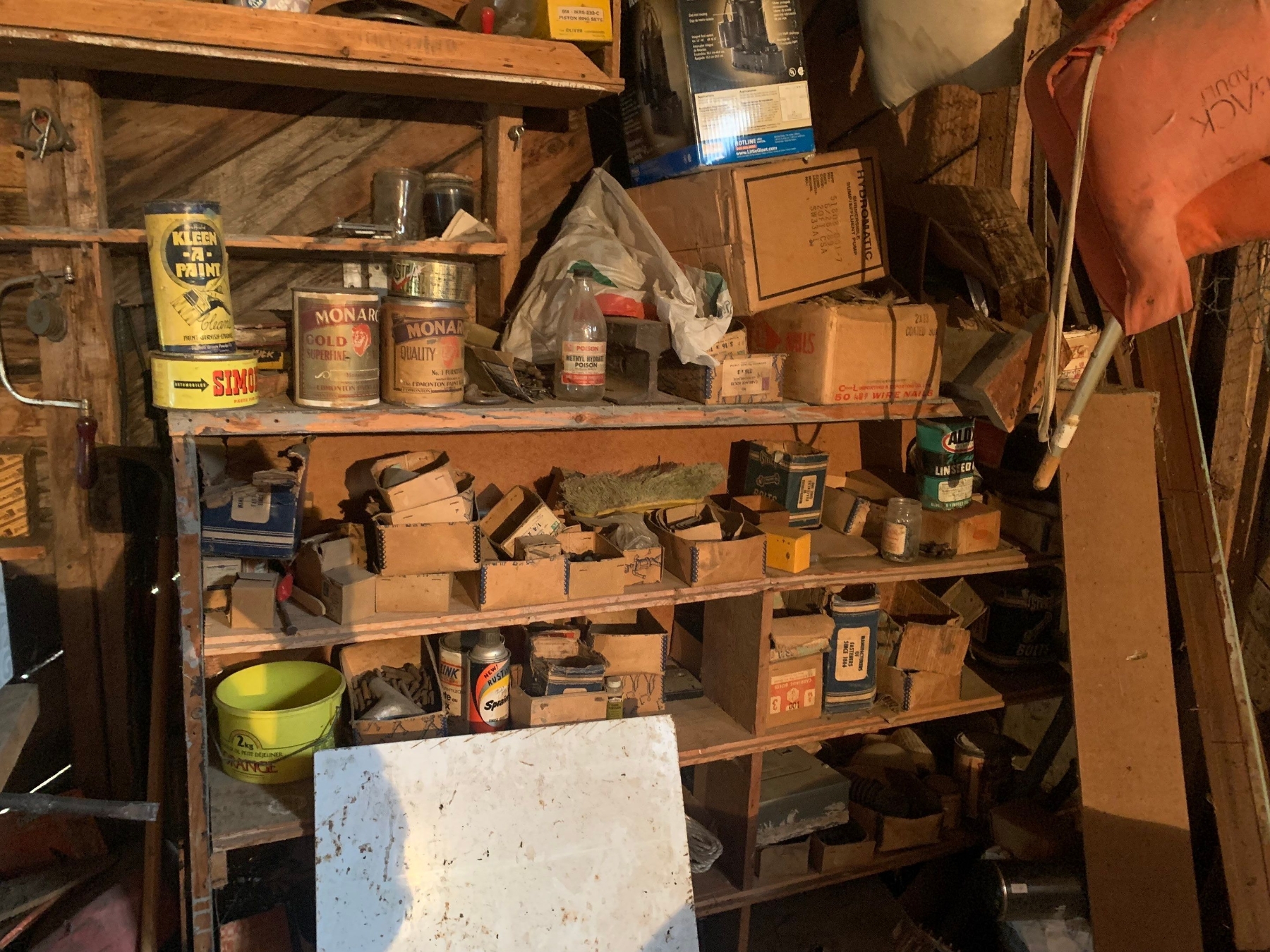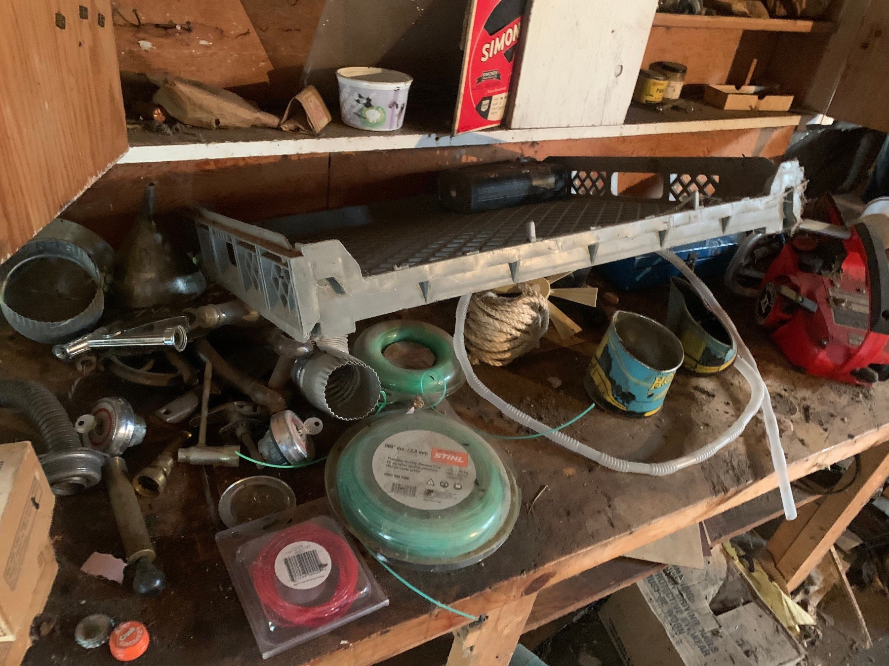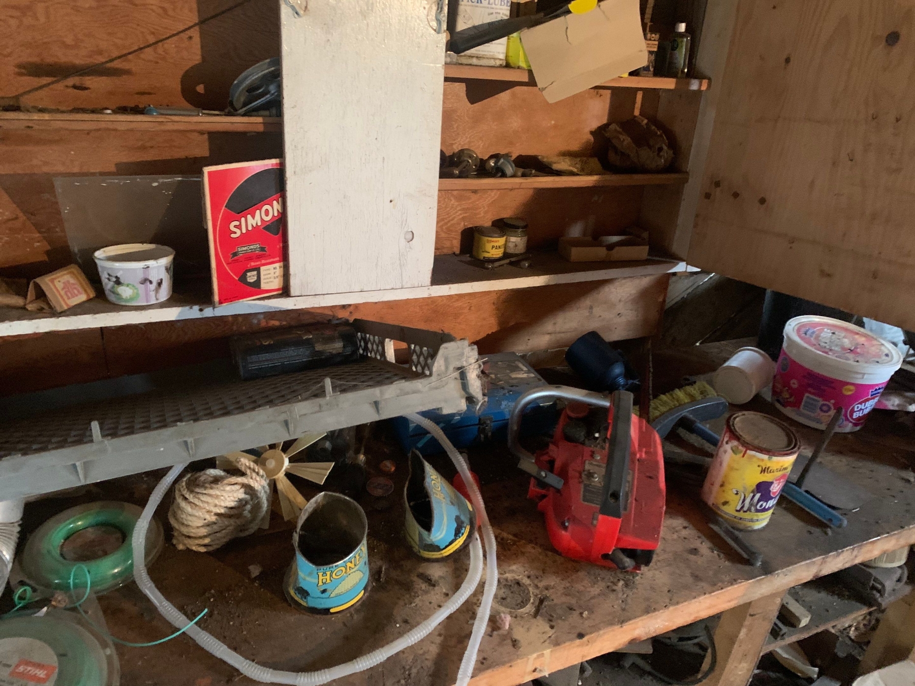 Mystery Garage Lot vintage tins, tools, fishing supplies, chainsaw, handtools, and more
