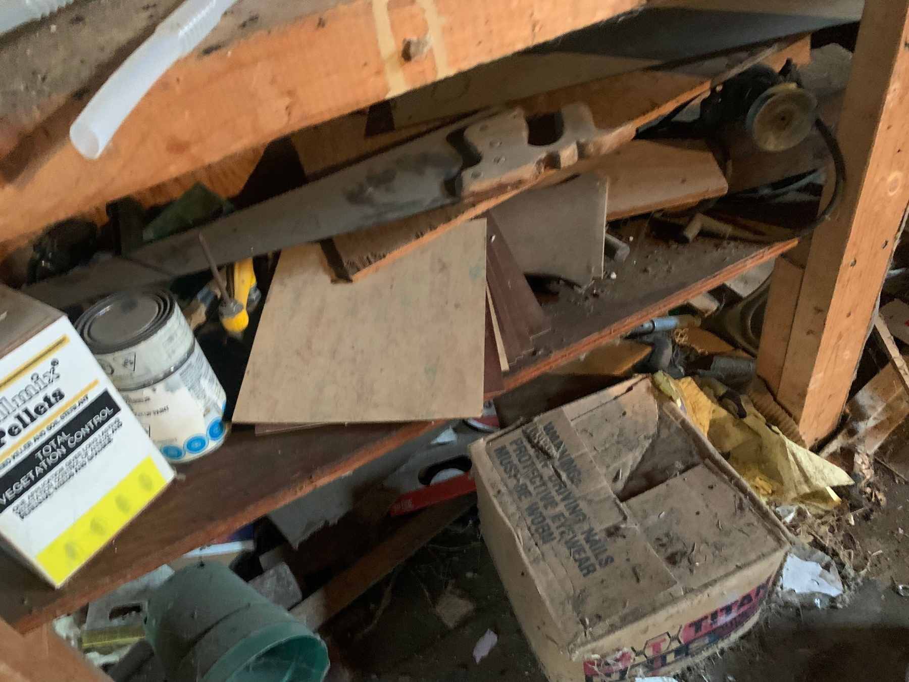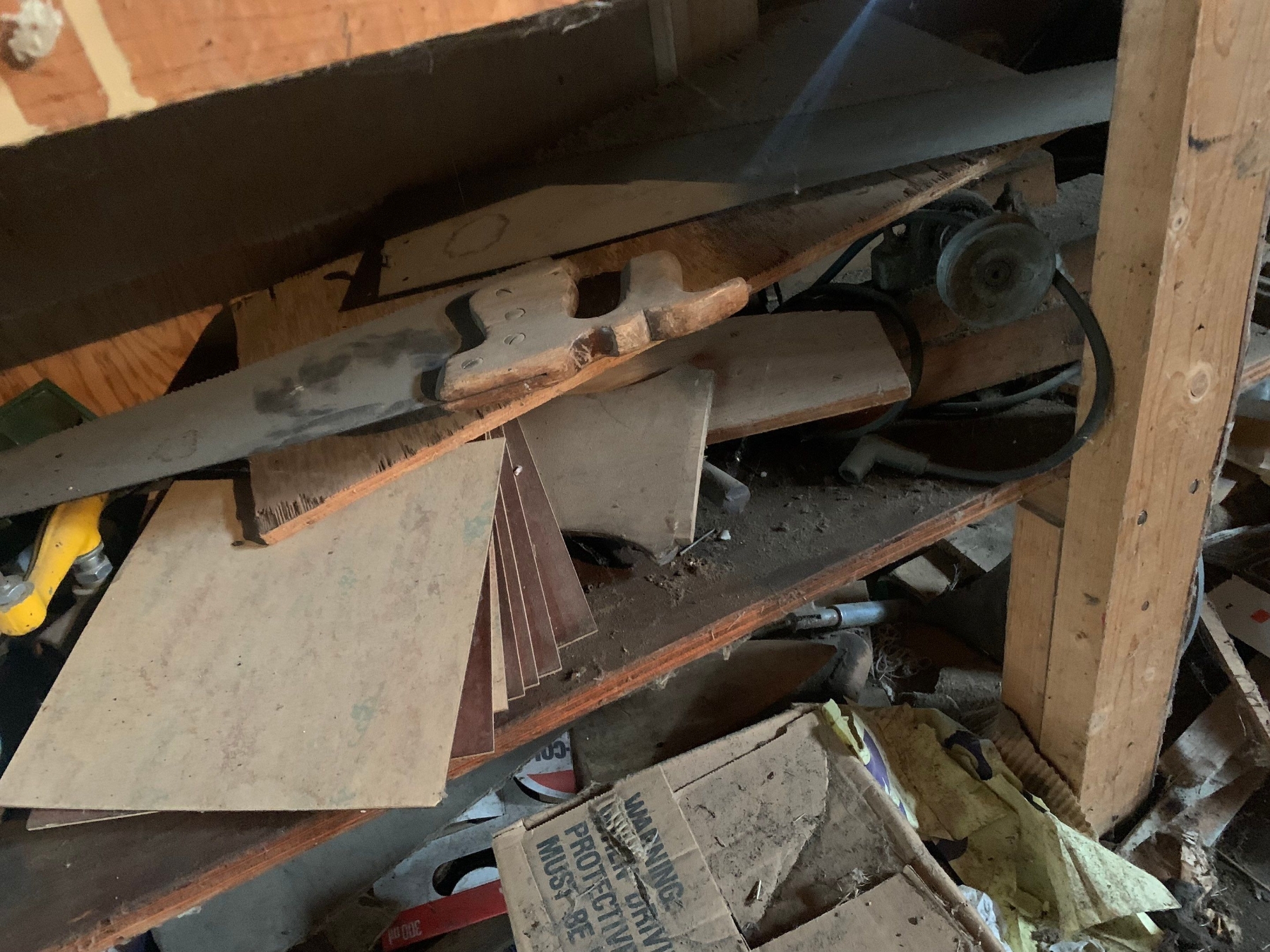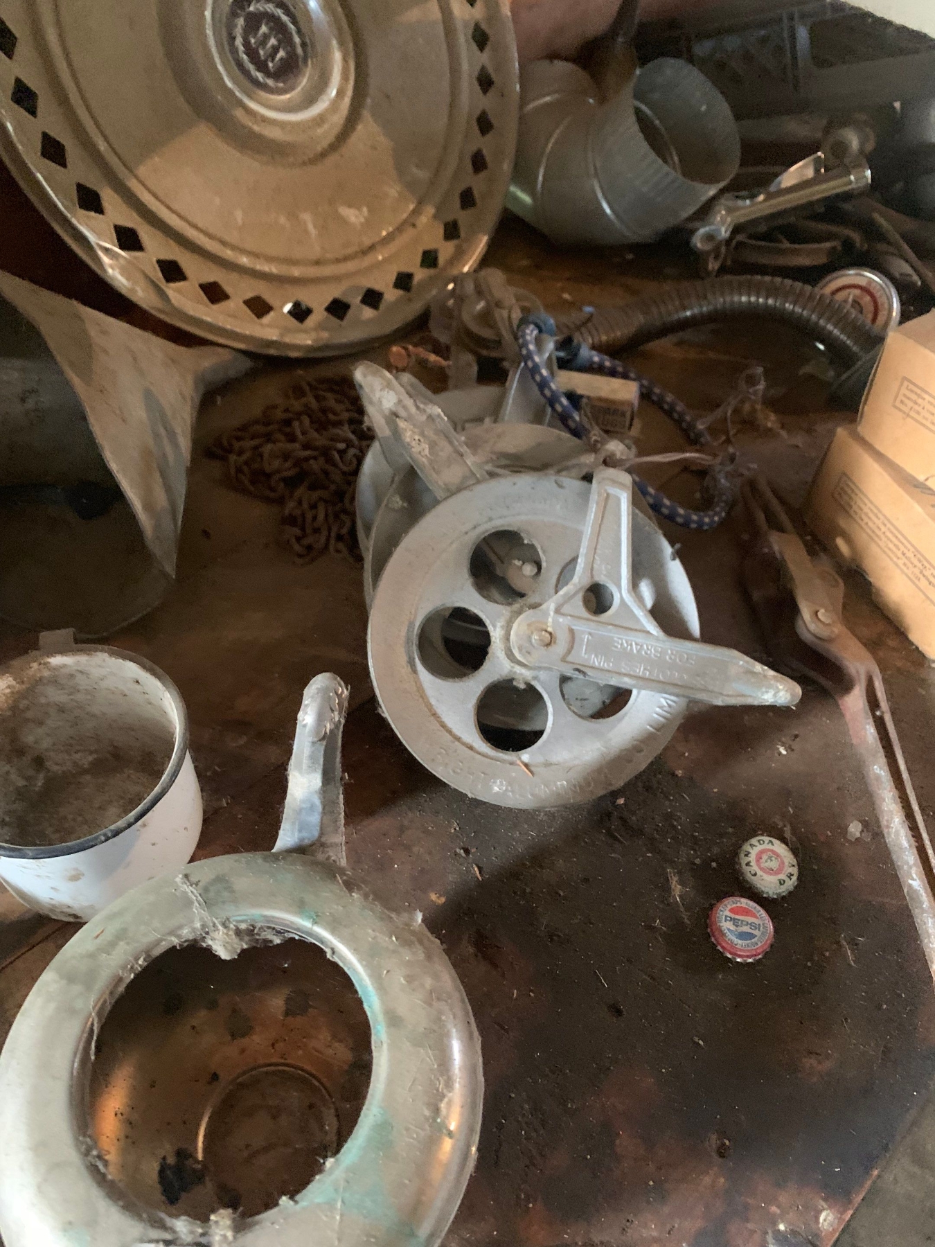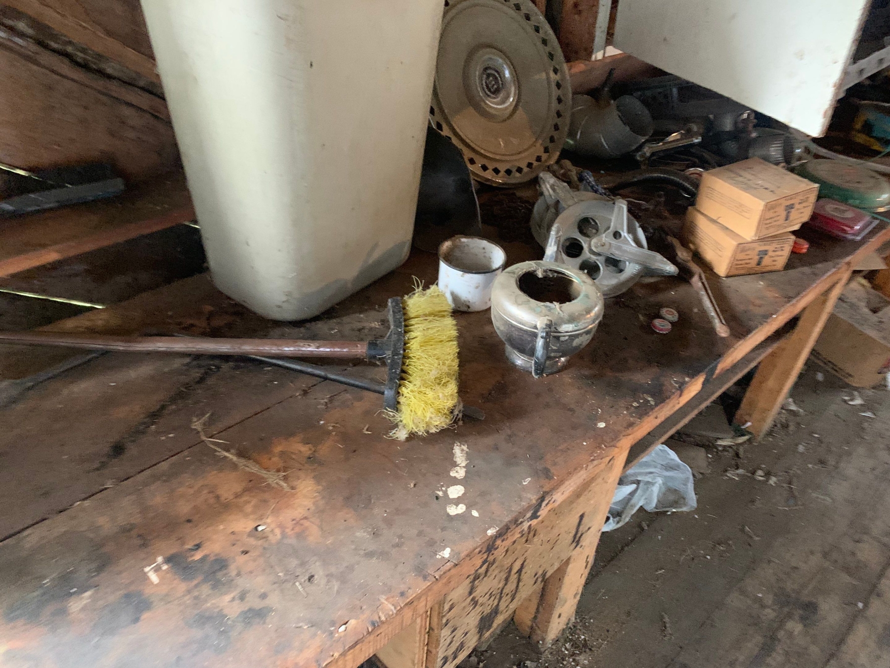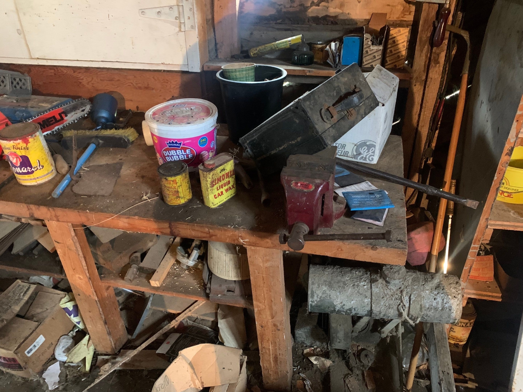 Mystery Garage Lot vintage tins, tools, fishing supplies, chainsaw, handtools, and more