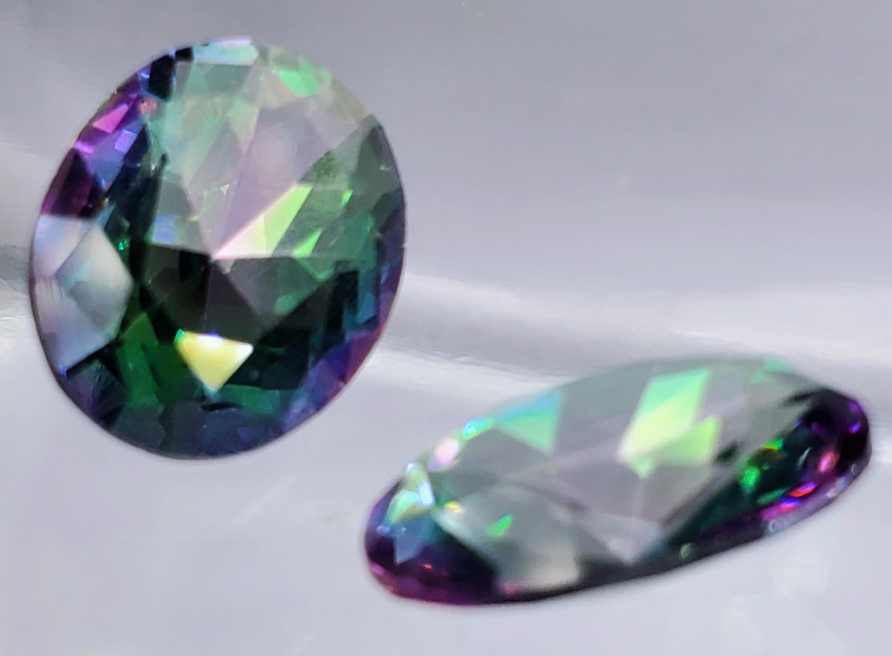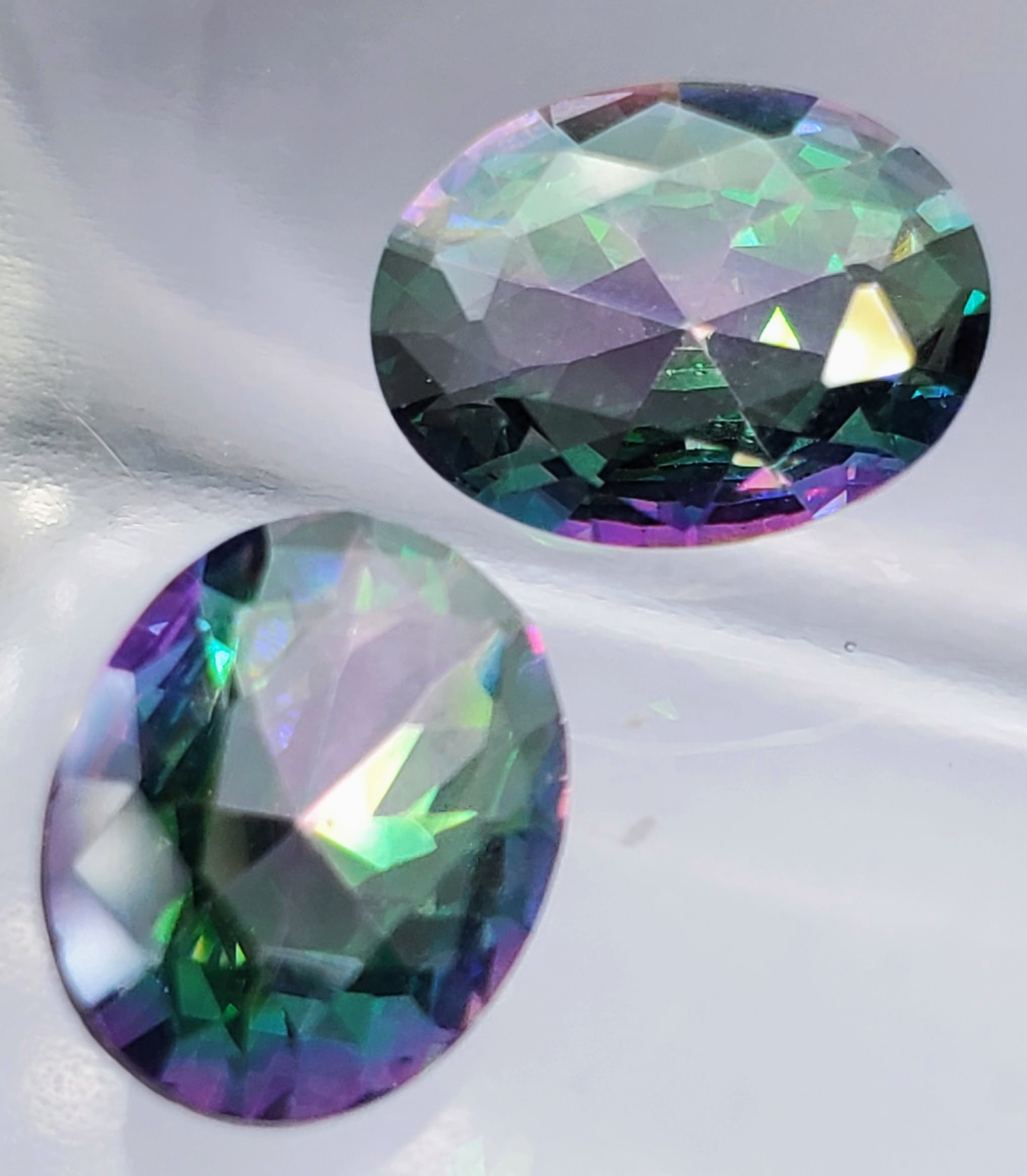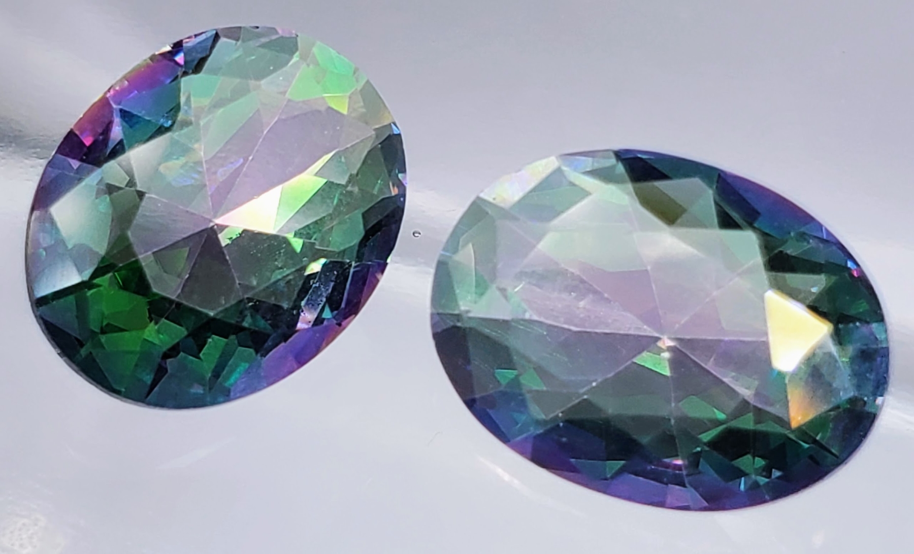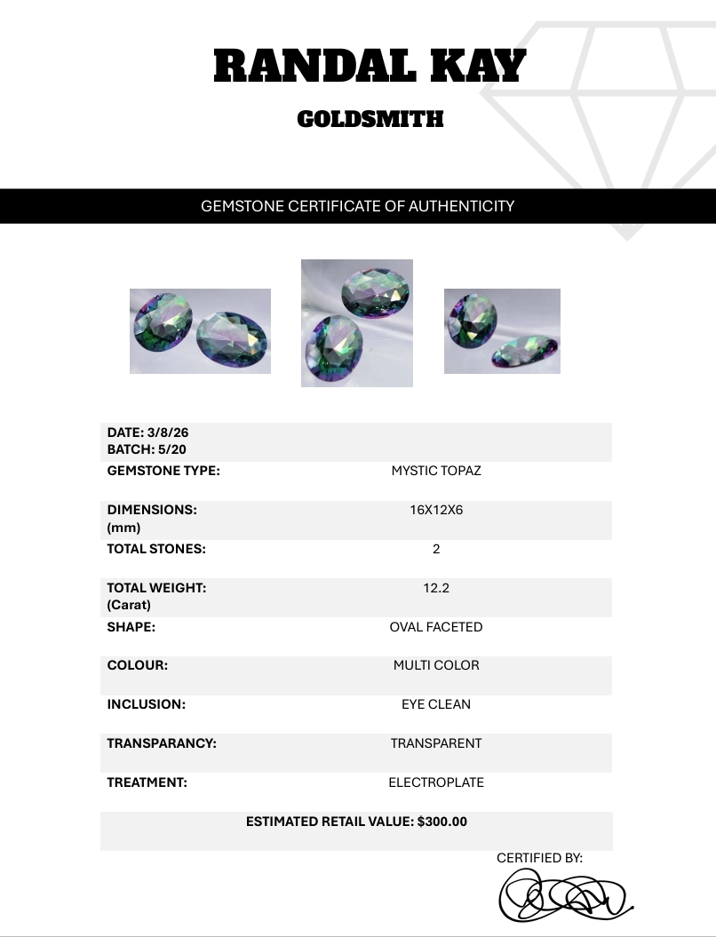 A 12.2-carat pair of mystic topaz featuring multicolor iridescence, eye-clean clarity, transparent bodies, and oval faceting. Electroplated for vibrant rainbow effect. Estimated retail price is $300.