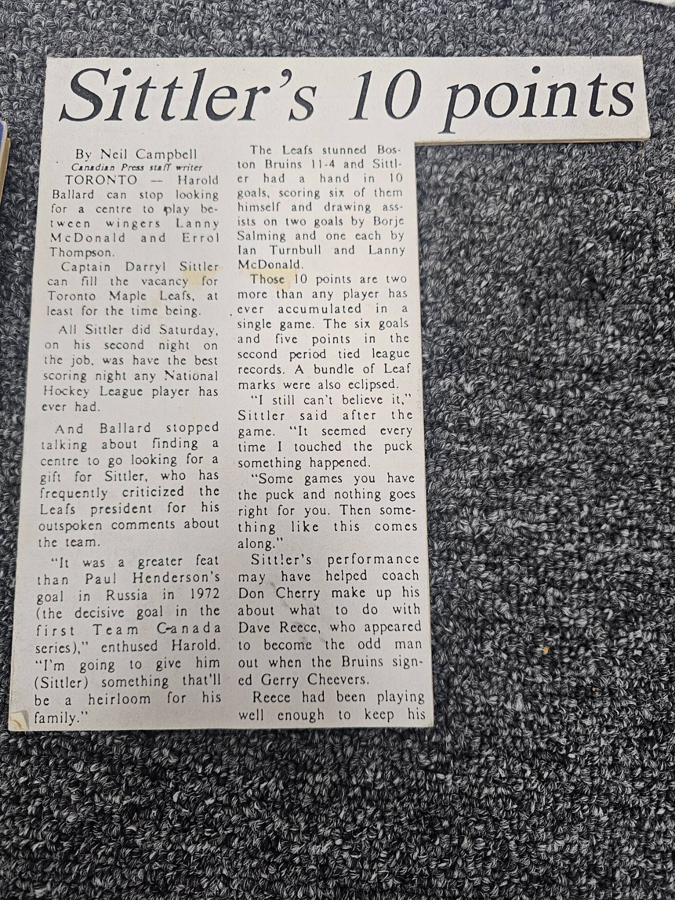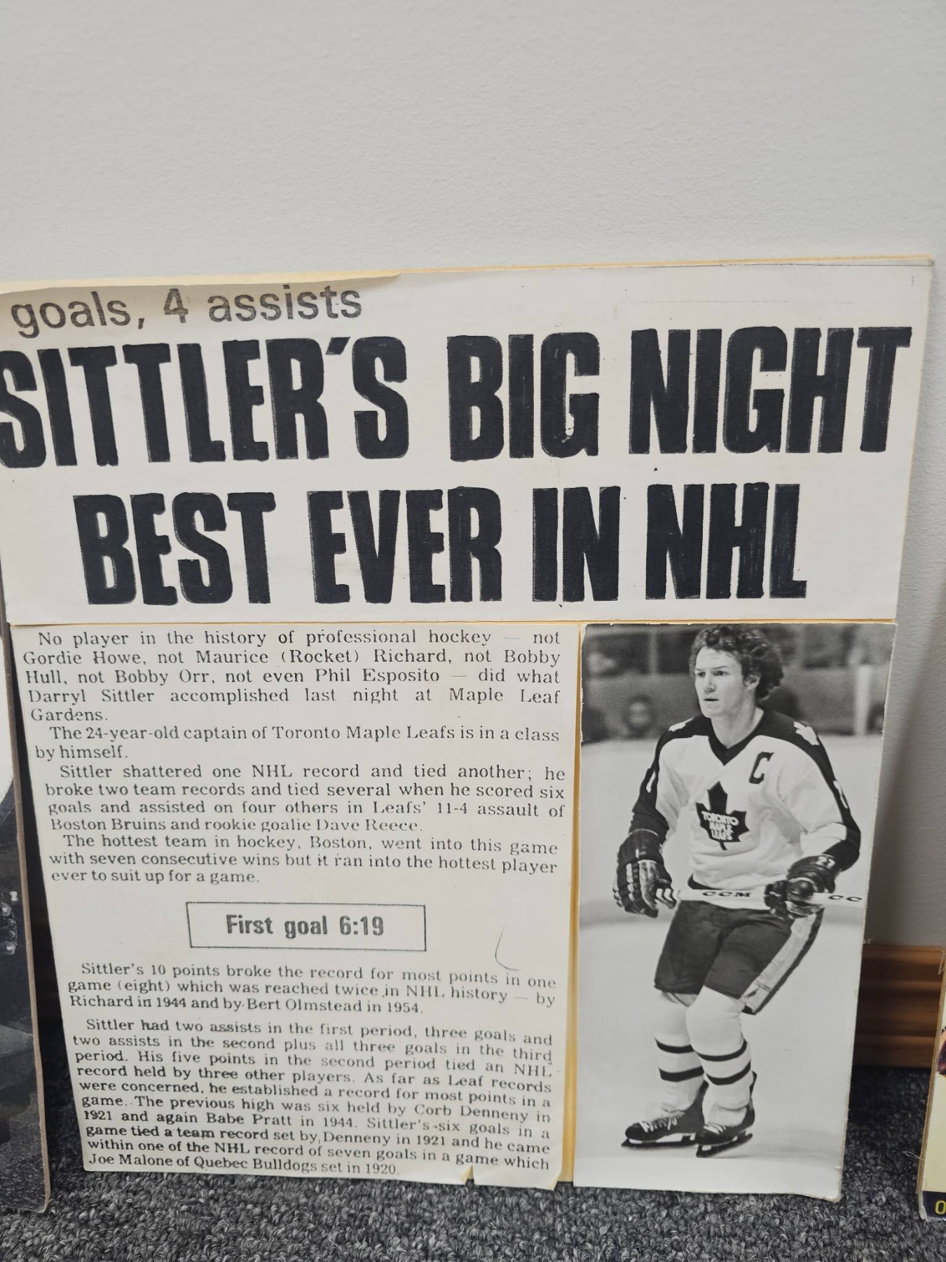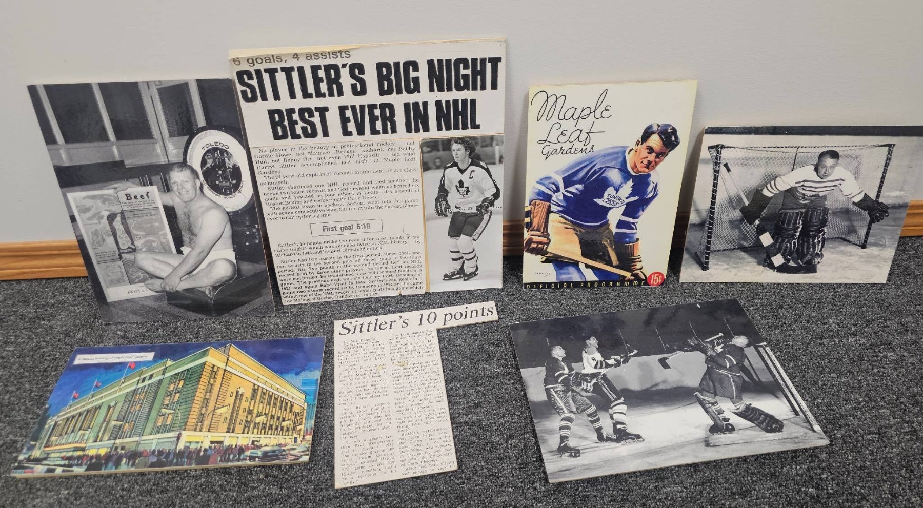 A compelling collection of NHL memorabilia featuring items celebrating Darryl Sittler's legendary 10-point game, including newspaper clippings, replica posters, and historical photographs. Also included are vintage Maple Leaf Gardens items, nostalgic hockey imagery, and player features. This lot offers a wonderful glimpse into hockey history, perfect for collectors and NHL enthusiasts.