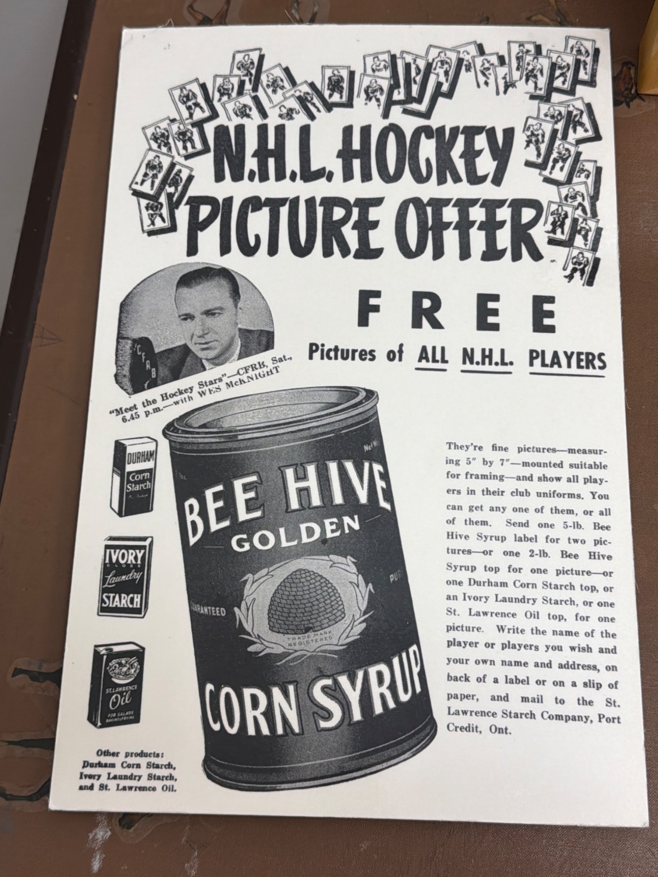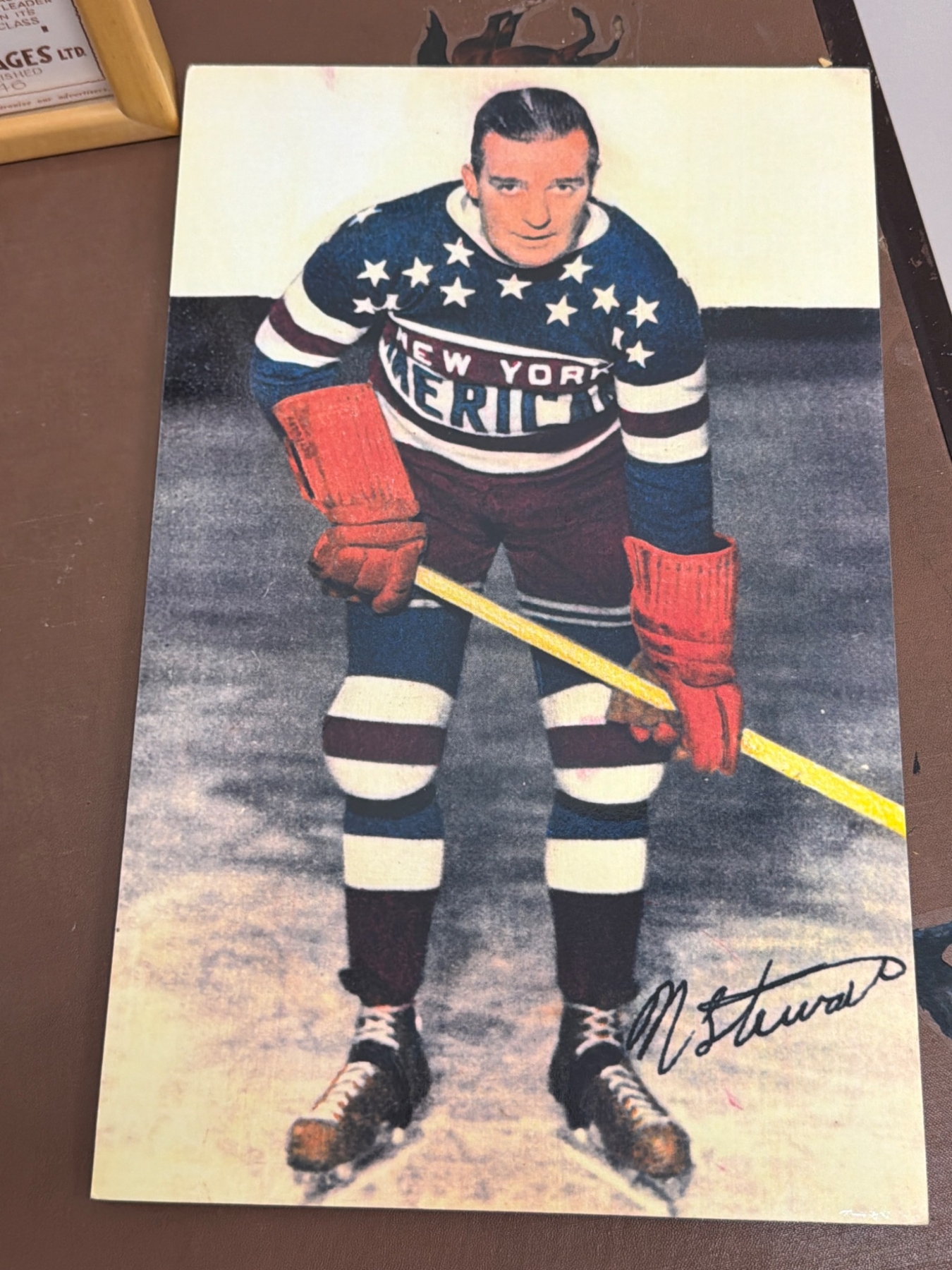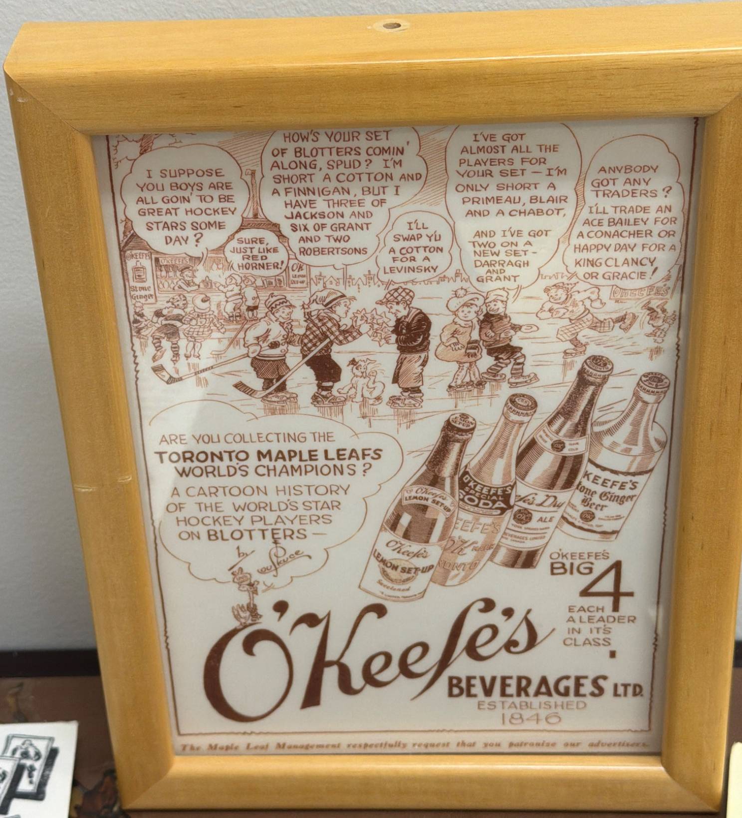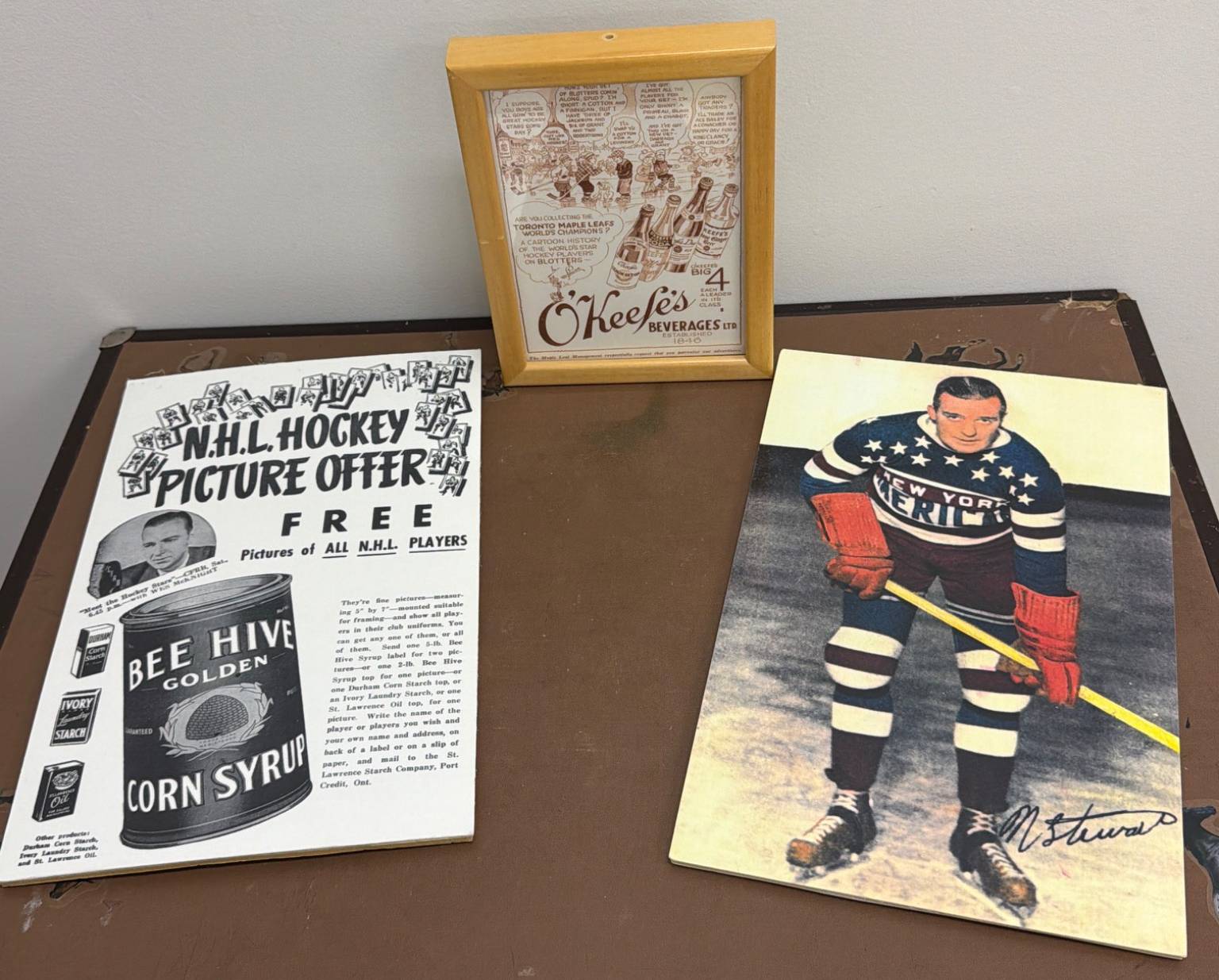 NHL memorabilia includes a Bee Hive Golden Corn Syrup advertisement offering NHL player pictures, a signed print of legendary New York player Nels Stewart, and a framed vintage ad promoting O'Keefe's Beverages tied to the Toronto Maple Leafs. Items are perfect for nostalgic hockey enthusiasts or collectors seeking rare promotional pieces.