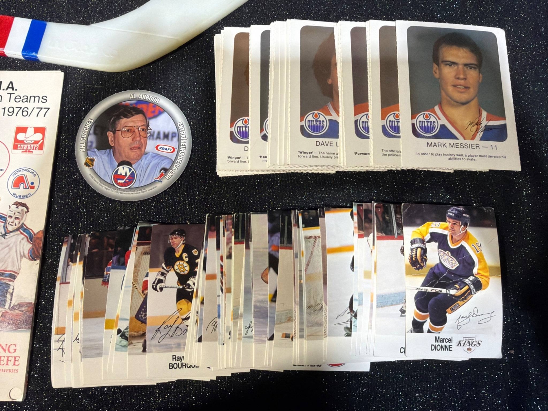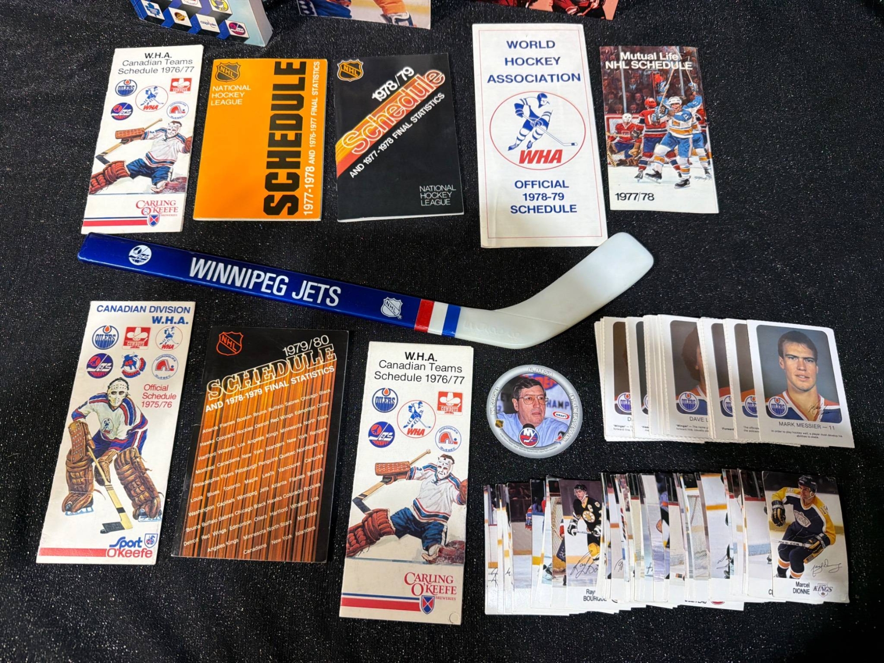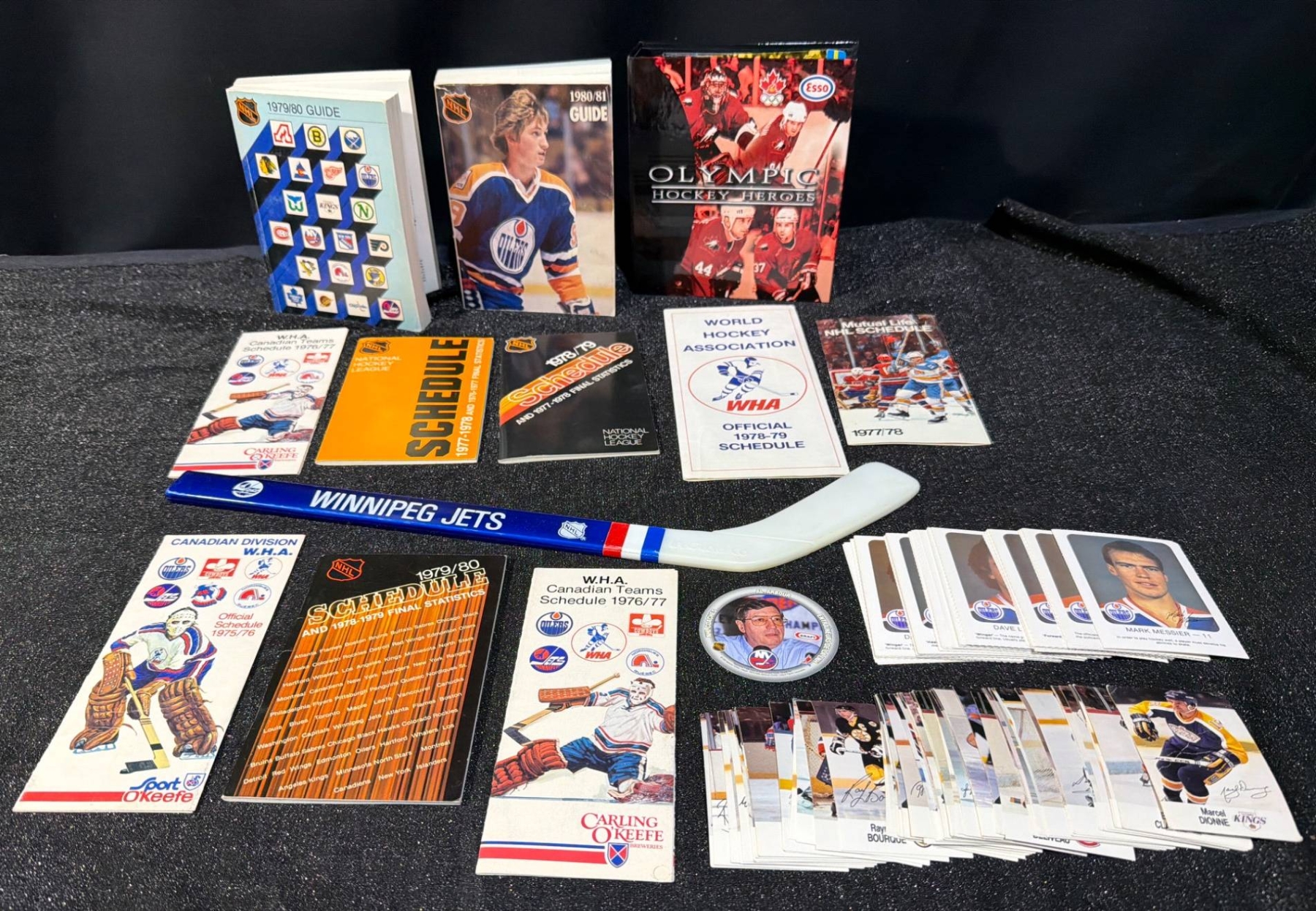 This curated collection offers a glimpse into iconic moments of hockey history, including NHL schedules (1976-1980), World Hockey Association guides, and vibrant team memorabilia. Items include two NHL Guides (1979/80, 1980/81) measuring approximately 8.5 x 11 inches each, over 50 hockey cards featuring star players of varying sizes (approx. 3.5 x 2.5 inches), and a Winnipeg Jets collectible hockey stick (approx. 24 inches long). Great for collectors and hockey history enthusiasts.