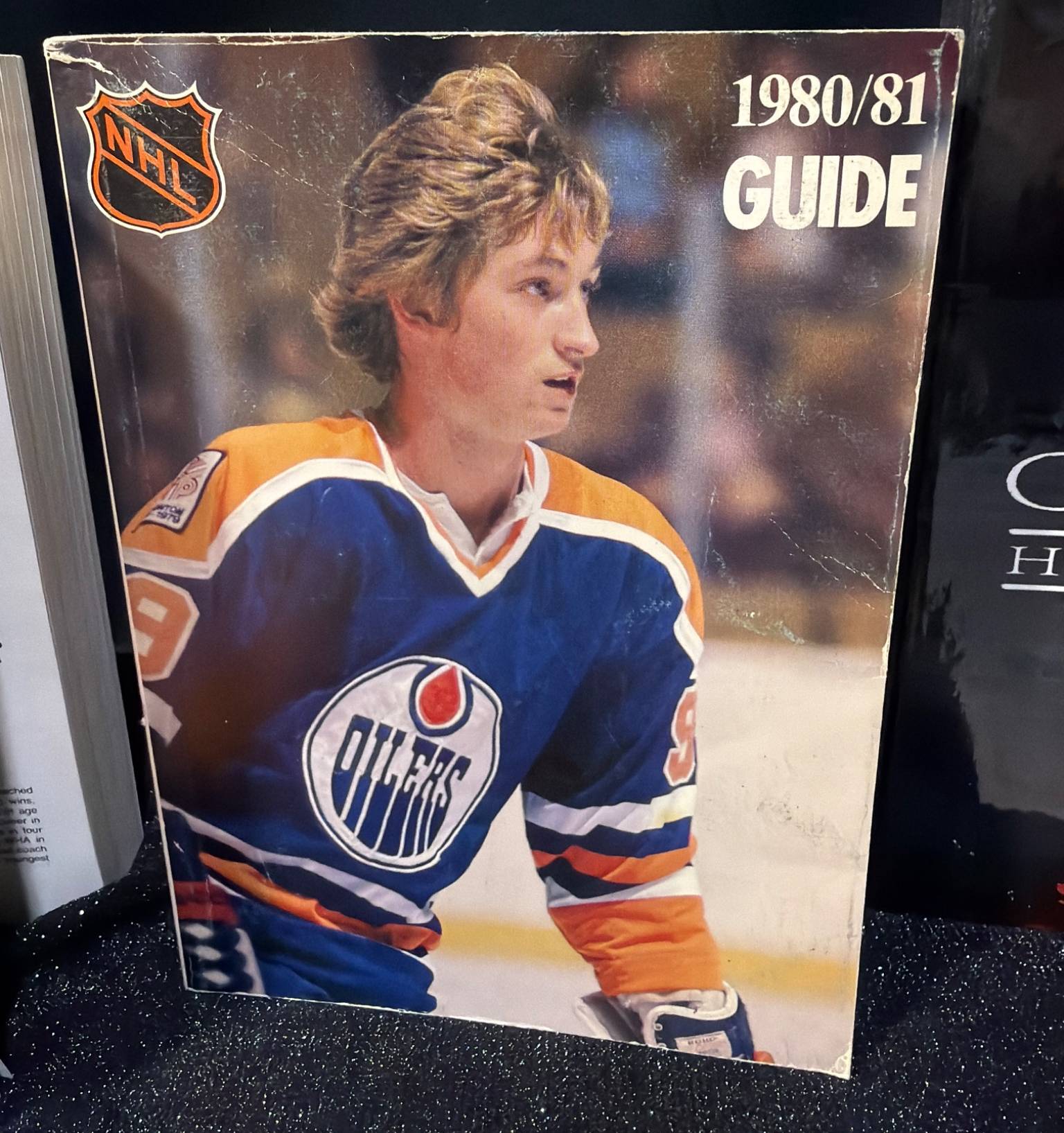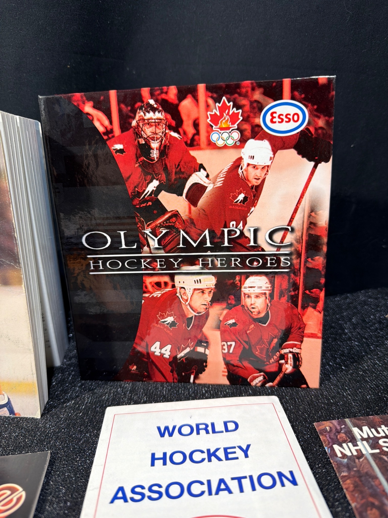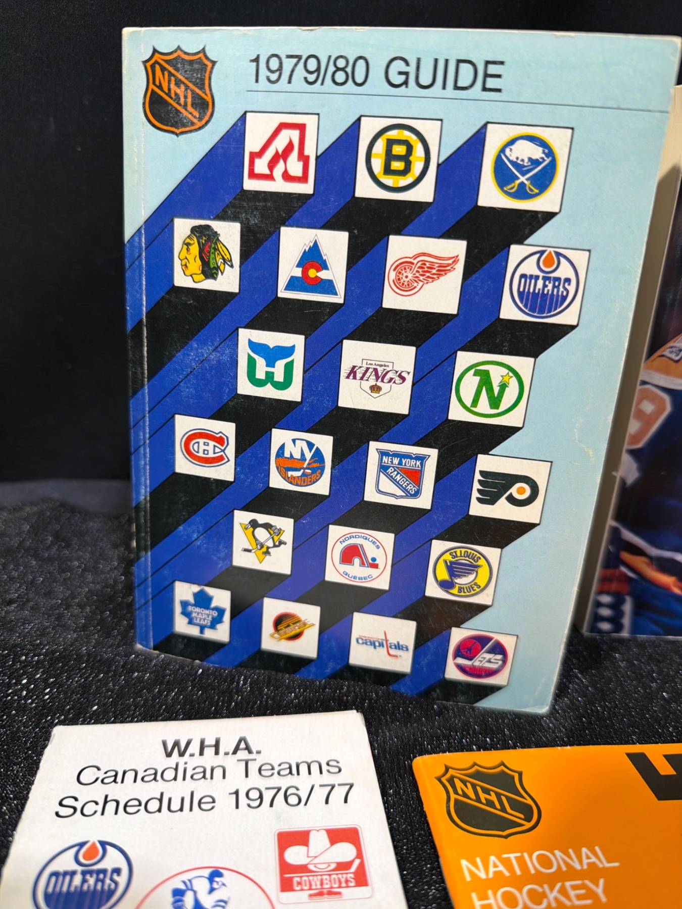 This curated collection offers a glimpse into iconic moments of hockey history, including NHL schedules (1976-1980), World Hockey Association guides, and vibrant team memorabilia. Items include two NHL Guides (1979/80, 1980/81) measuring approximately 8.5 x 11 inches each, over 50 hockey cards featuring star players of varying sizes (approx. 3.5 x 2.5 inches), and a Winnipeg Jets collectible hockey stick (approx. 24 inches long). Great for collectors and hockey history enthusiasts.