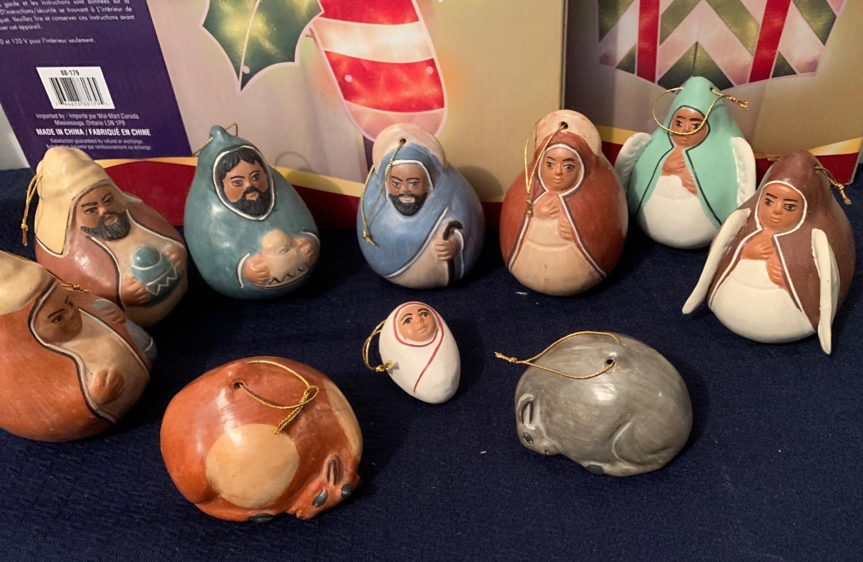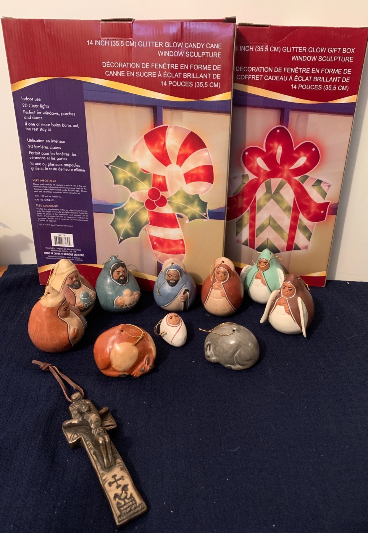 Nativity Scene Ornaments w/ Irish Folk Art Penal Cross & Holiday Lights