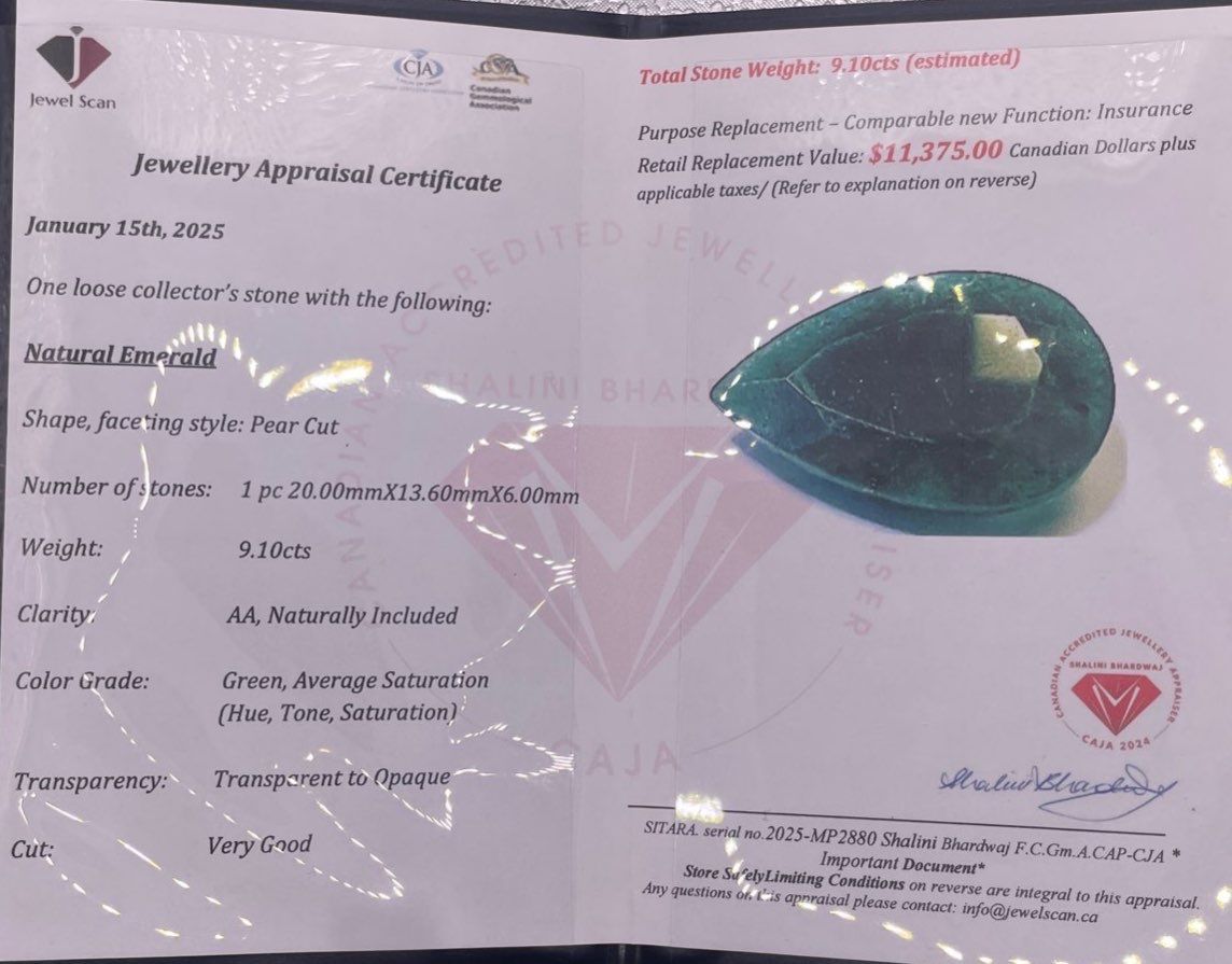 Natural Emerald. 9.1cts, AA Clarity, Green Average Saturation.