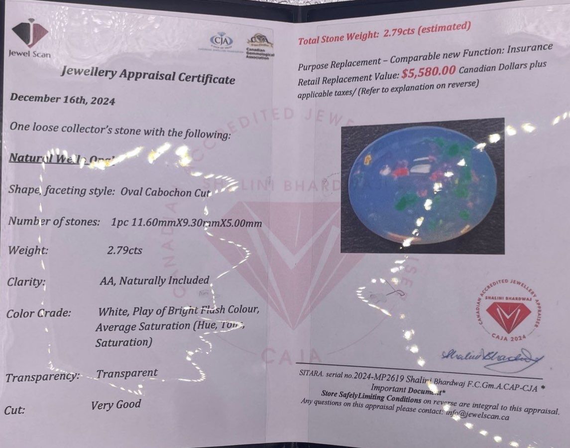 Natural Wello Opal. 2.79cts, AA Clarity, White Average Saturation.