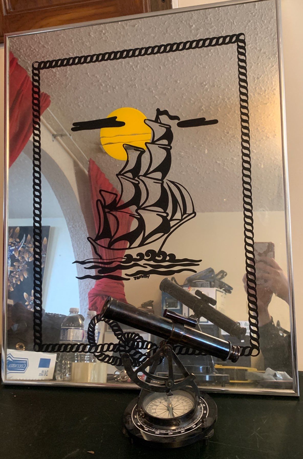 Nautical Mirror Art w/ Antique Boat Compass 20x26