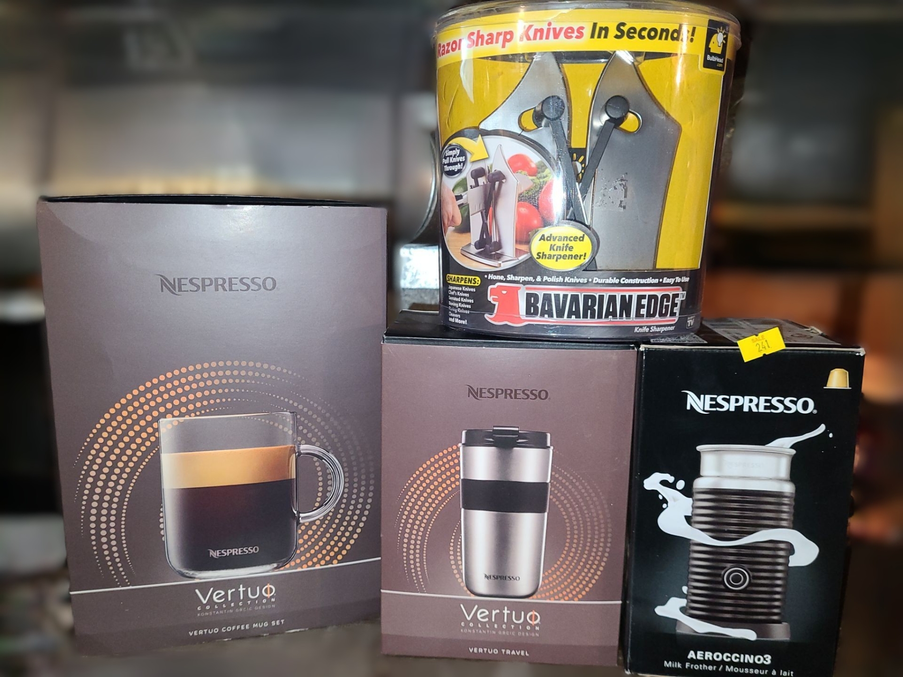 Nespresso: Aeroccino3, Vertuo: Clear Mug Set, Travel Mug - Bavarian Edge Knife Sharpener (All New)