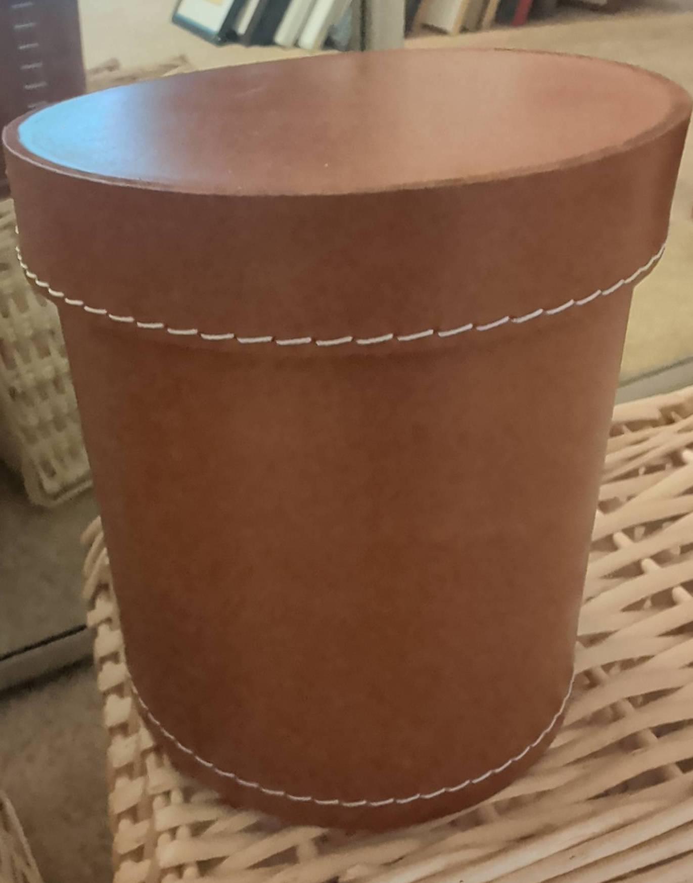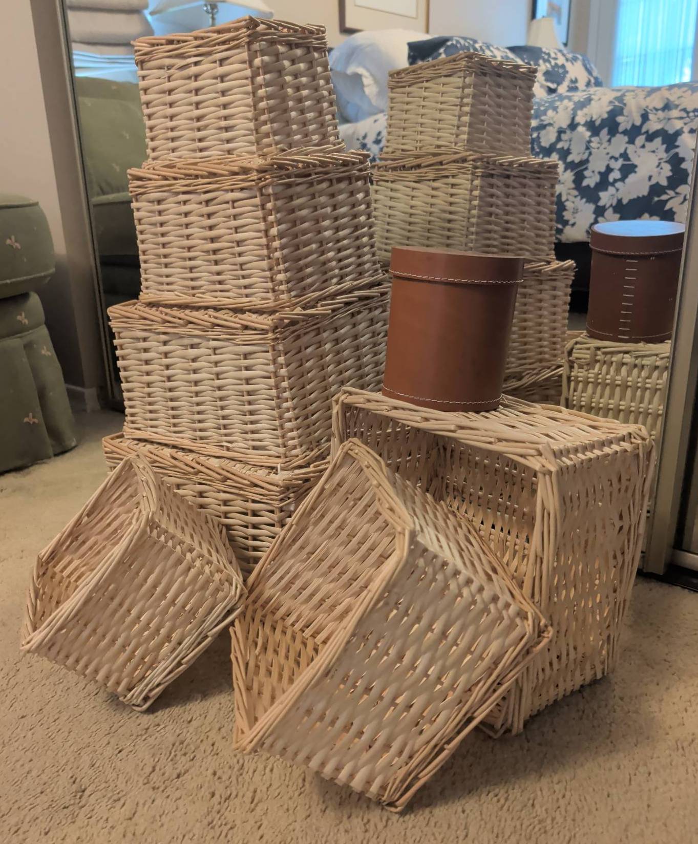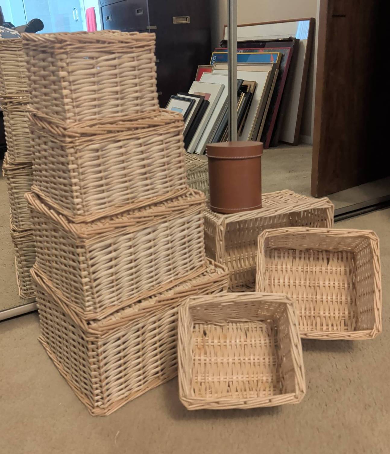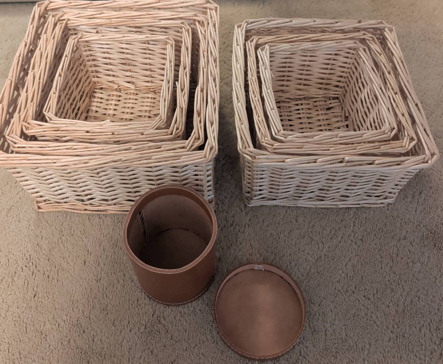 Multiple wicker baskets in a square nesting design, ideal for organization and storage. Baskets come in varying sizes that fit neatly into one another for compact storage. Also included is a decorative genuine leather cylindrical canister with a removable lid, suitable for storing small items. A functional and stylish addition to your home or workspace.