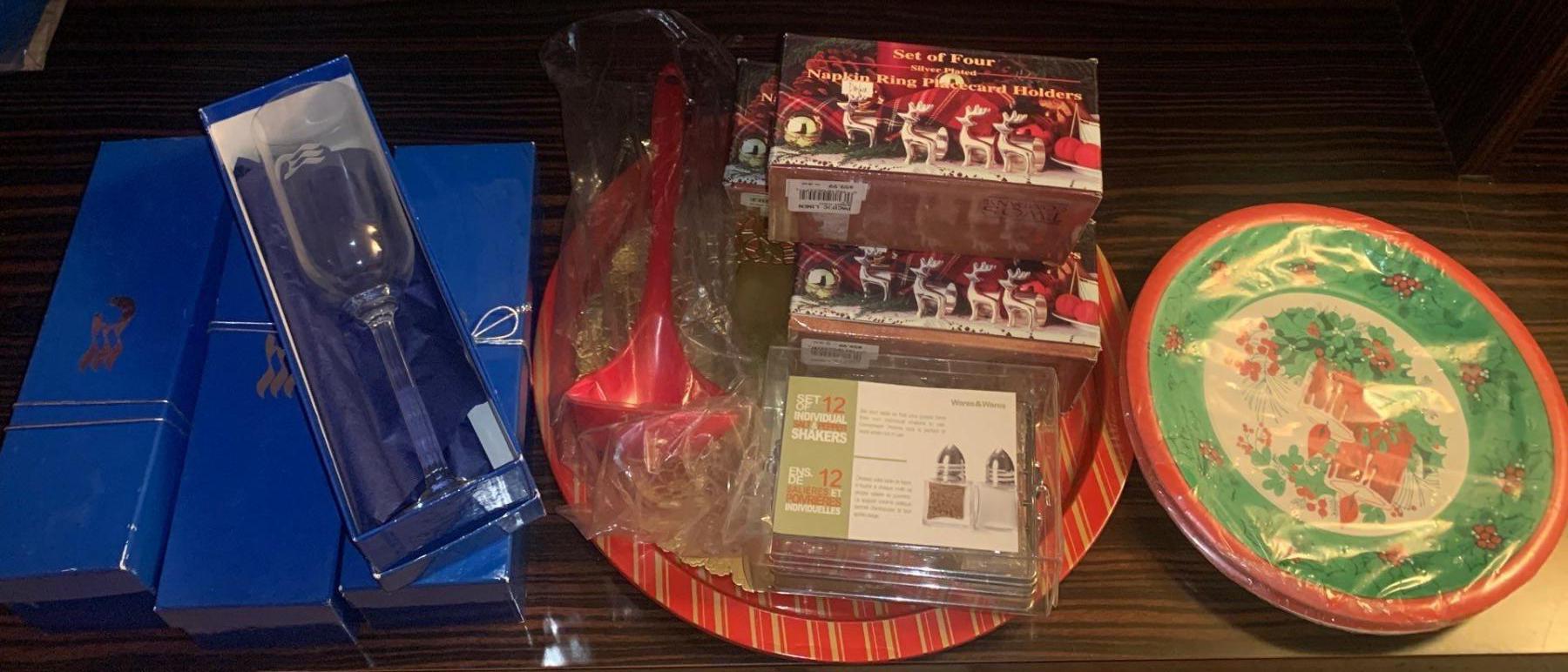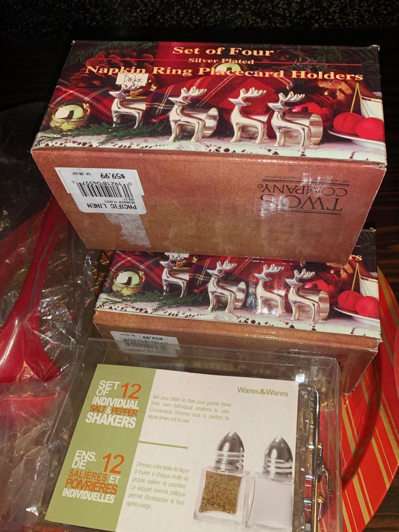 New Holiday Themed Tableware - Silver Plated Napkin Rings Plates Ladels S+P Shakers