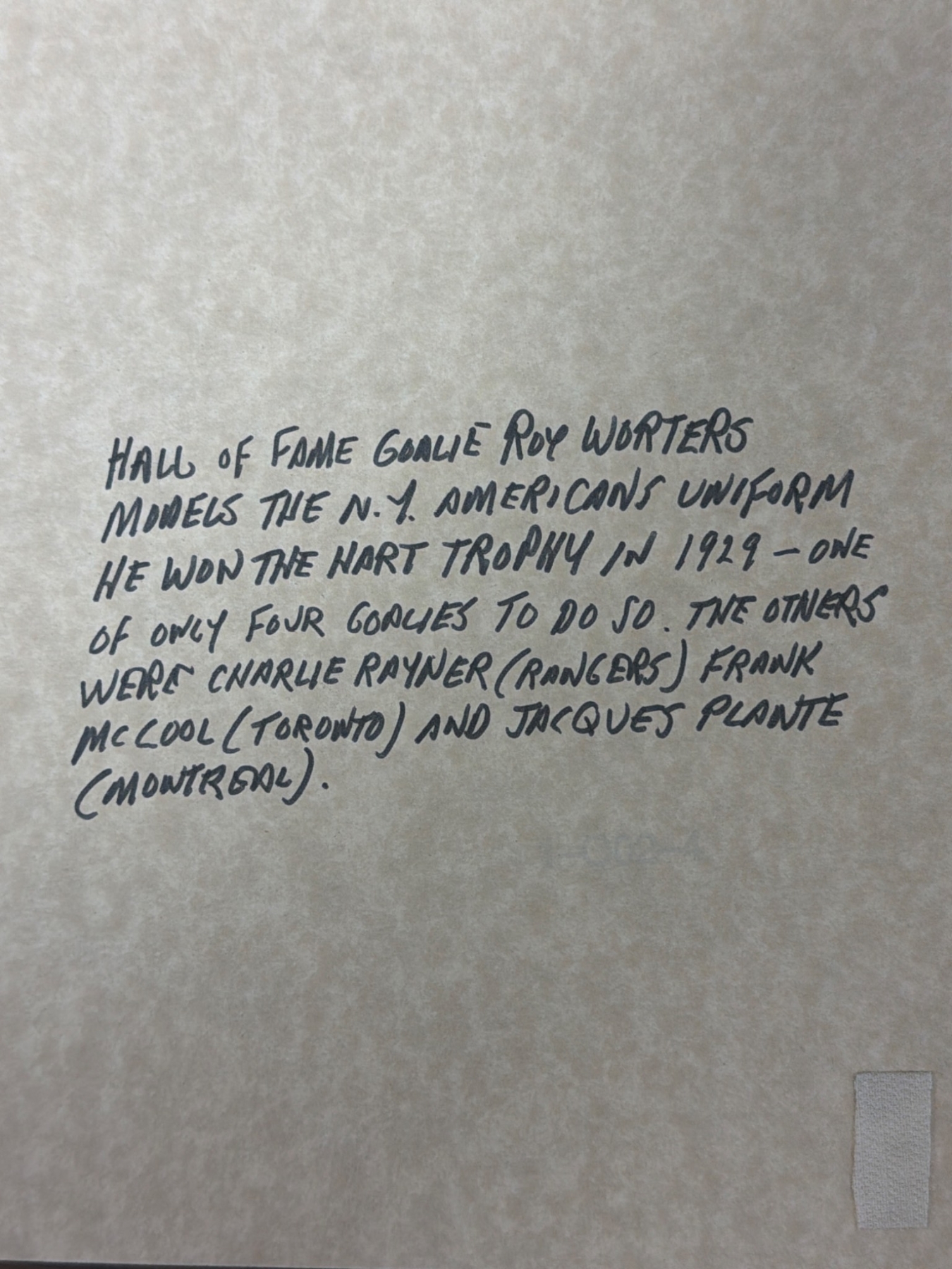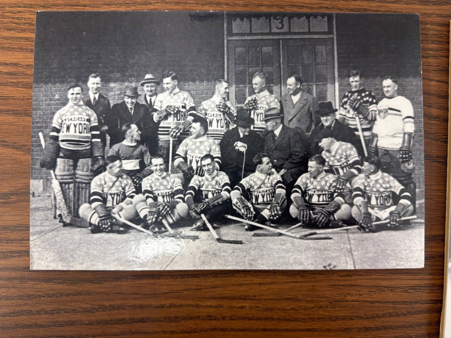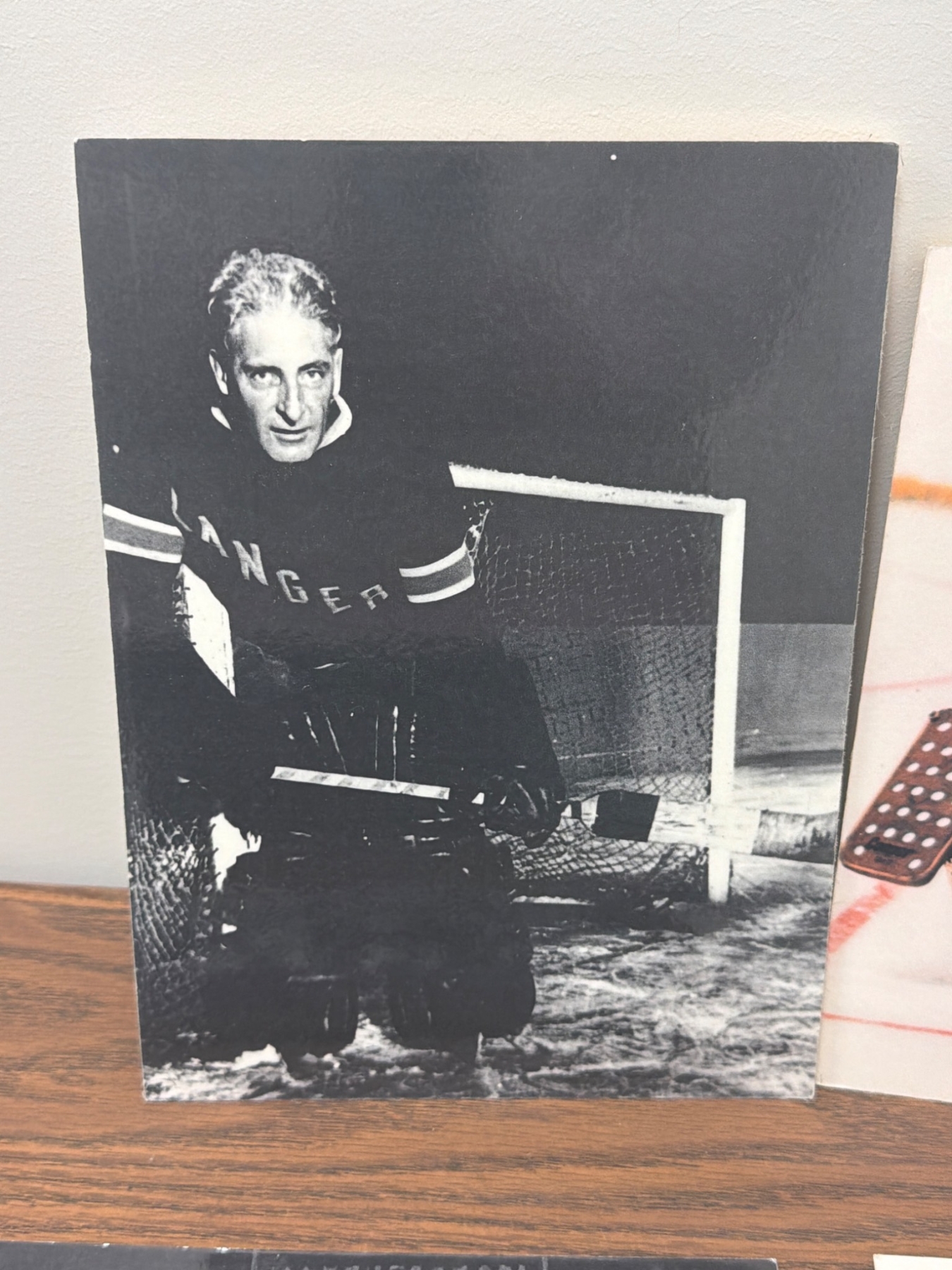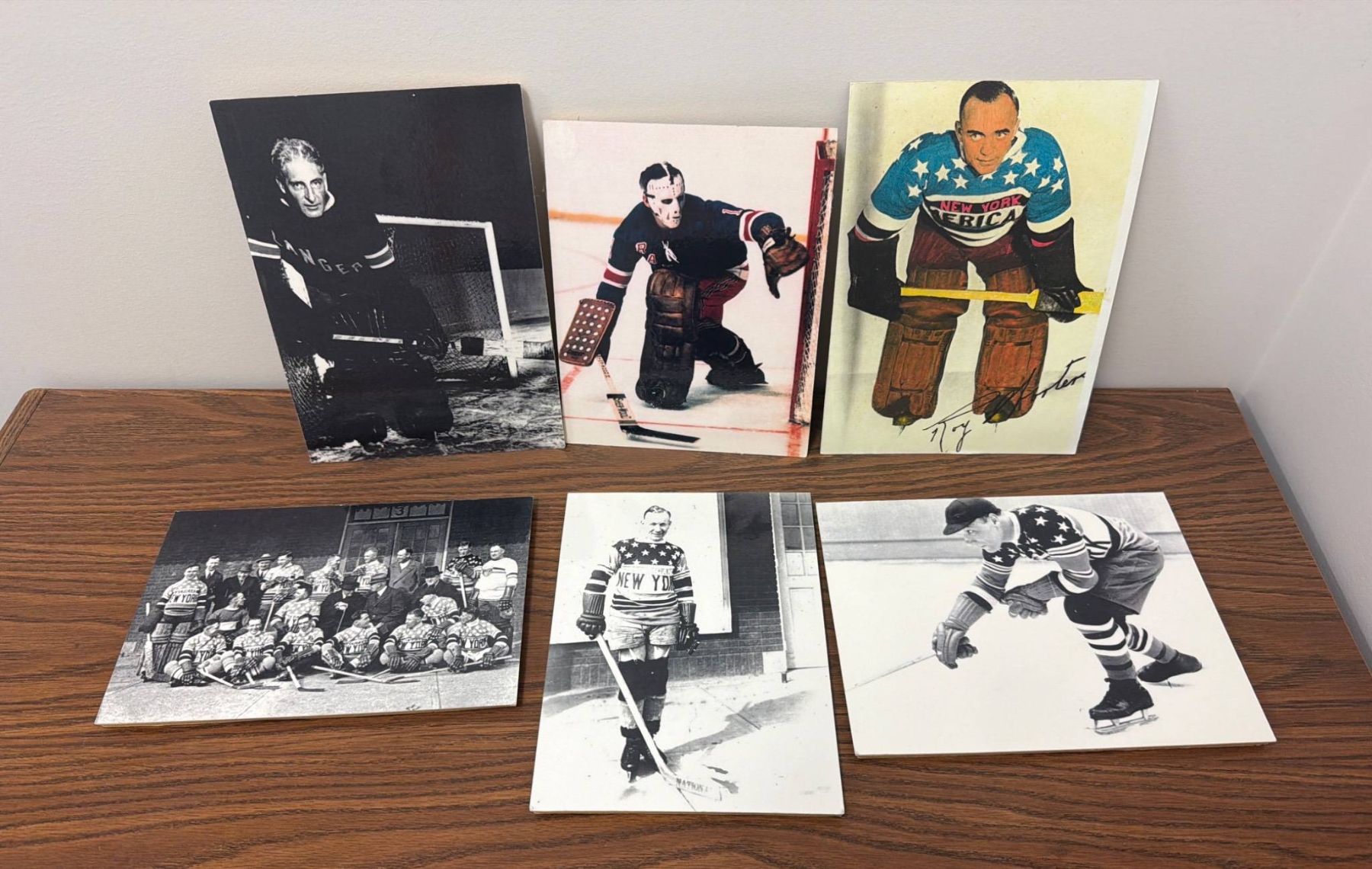 Six vintage hockey photographs and prints linked to the New York Americans and New York Rangers, including images of Hall of Fame goalie Roy Worters in full uniform, notable scenes, and player portraits. One image is signed by Roy Worters. The collection showcases moments in hockey history, making it appealing to sports enthusiasts and collectors.