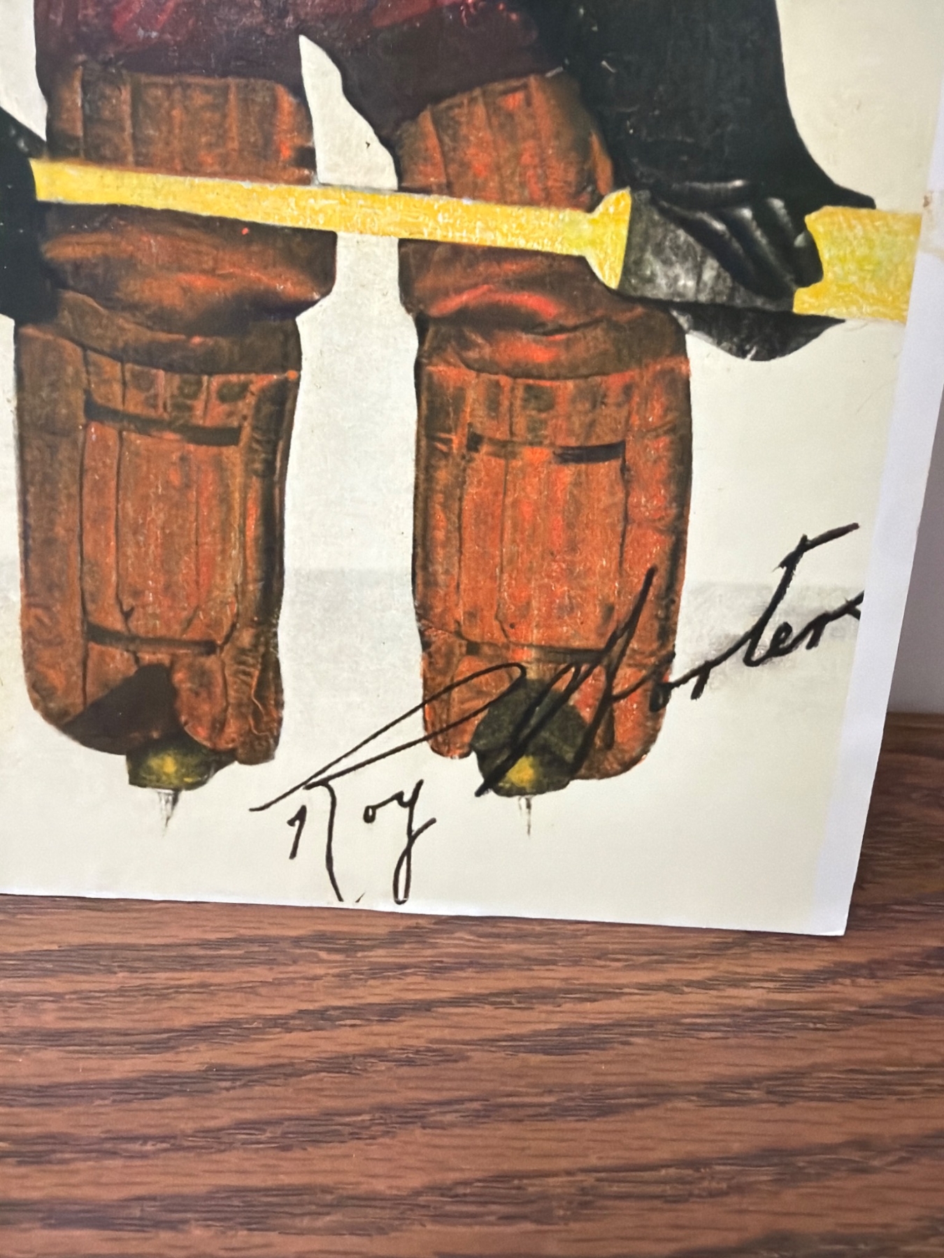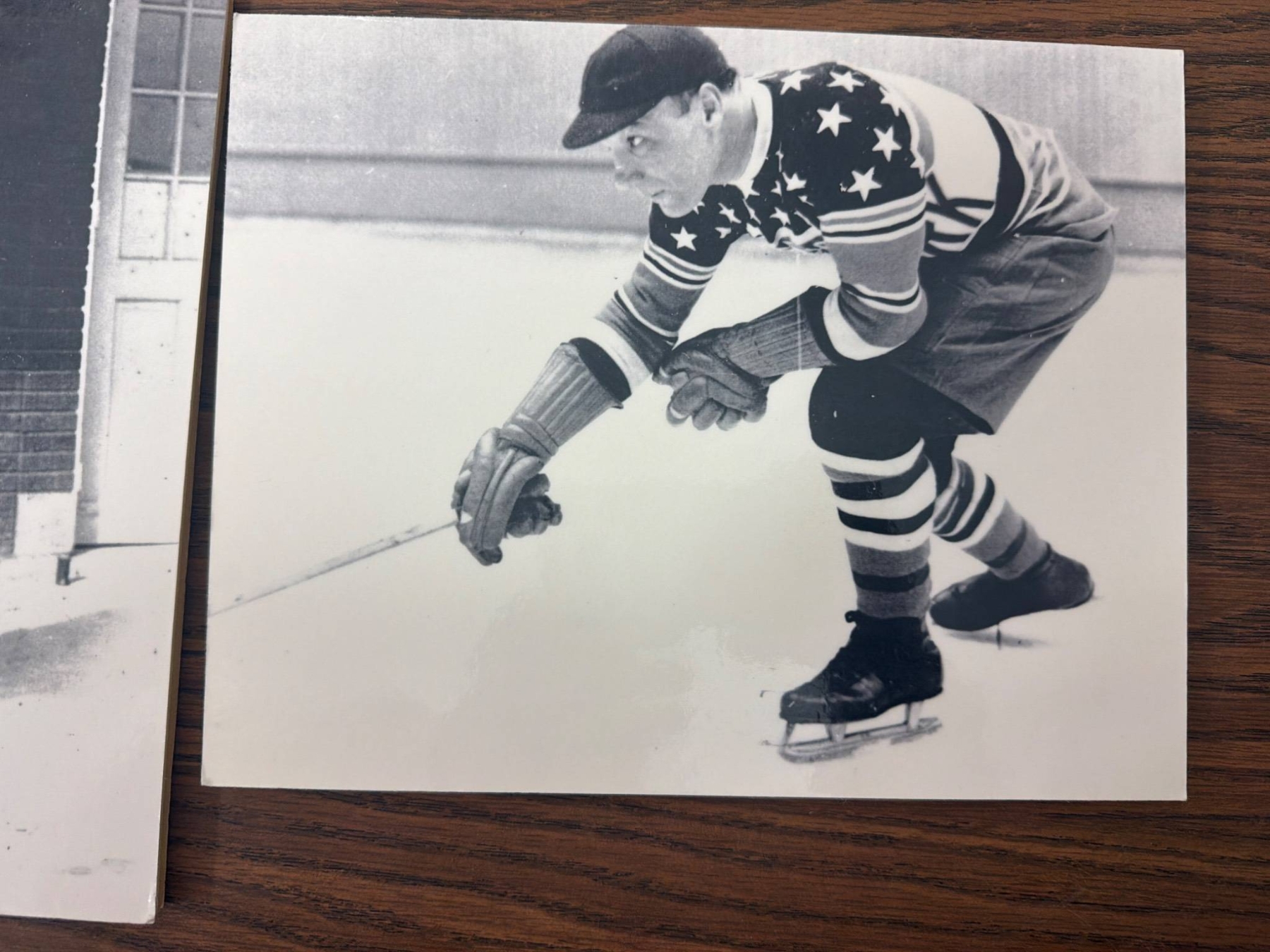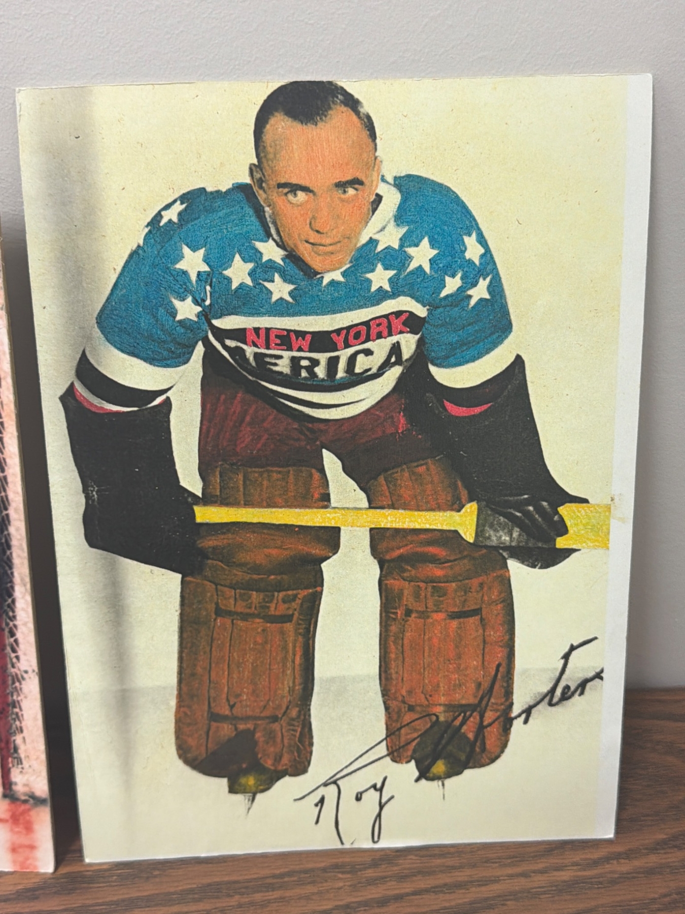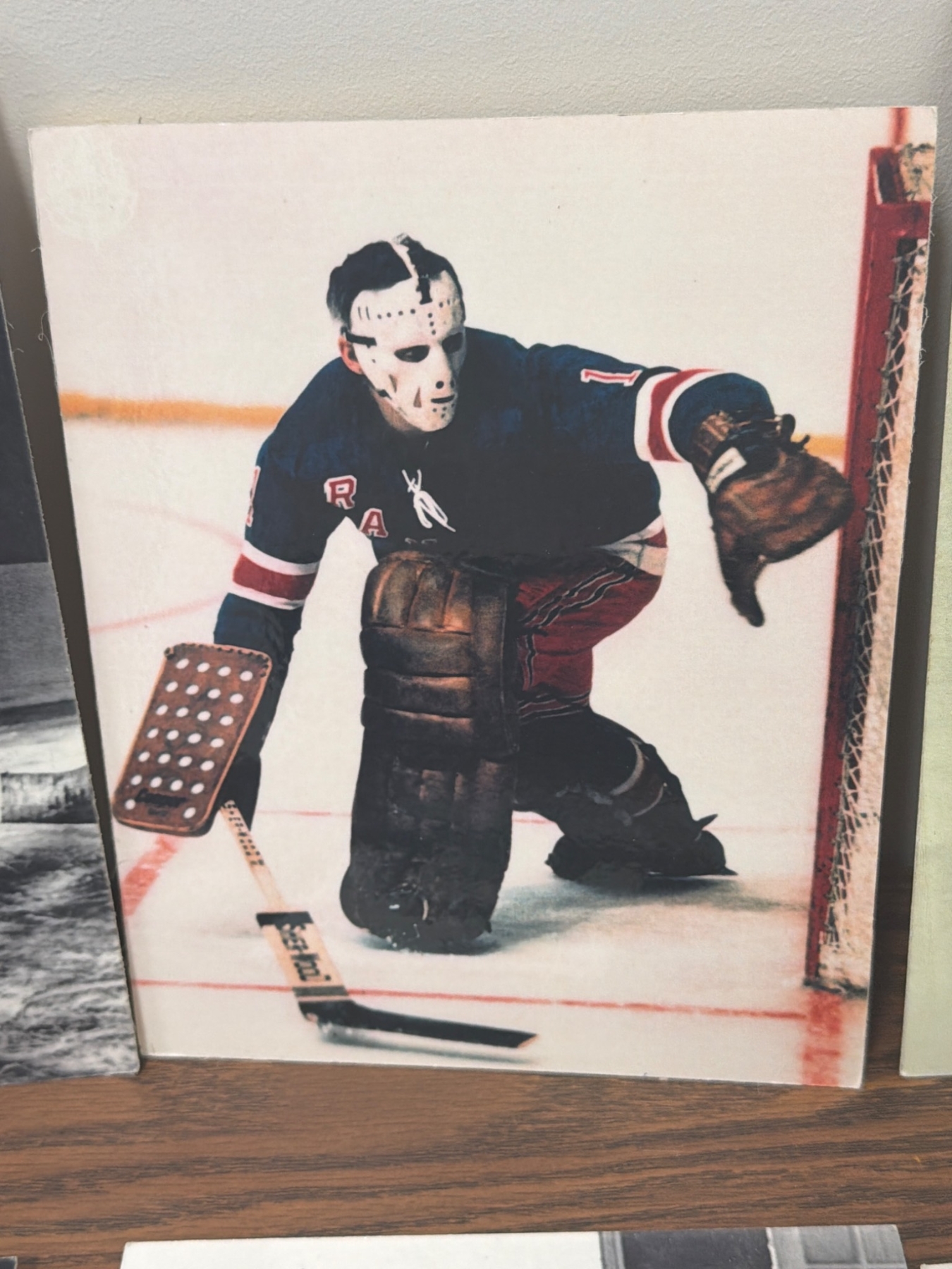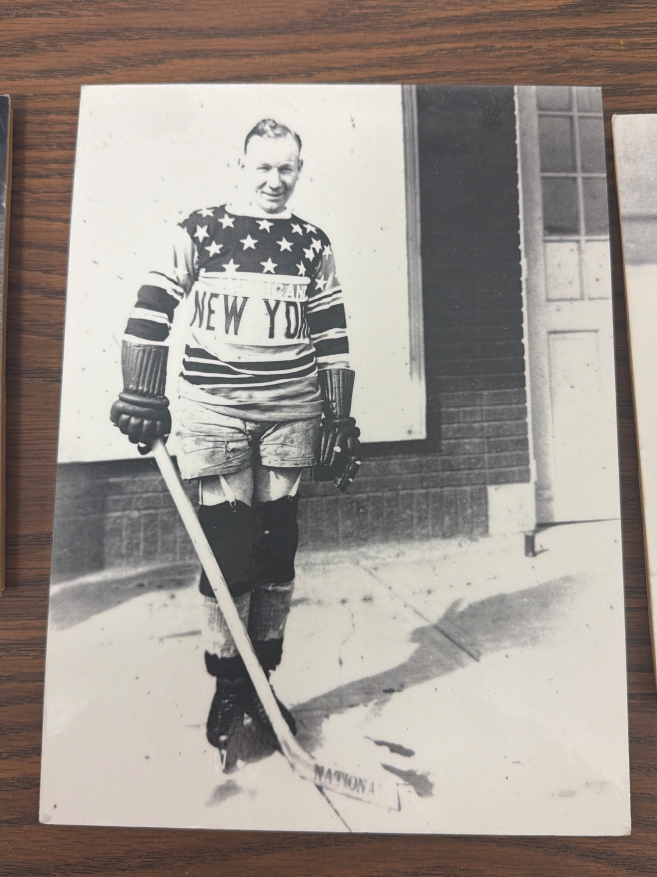 Six vintage hockey photographs and prints linked to the New York Americans and New York Rangers, including images of Hall of Fame goalie Roy Worters in full uniform, notable scenes, and player portraits. One image is signed by Roy Worters. The collection showcases moments in hockey history, making it appealing to sports enthusiasts and collectors.