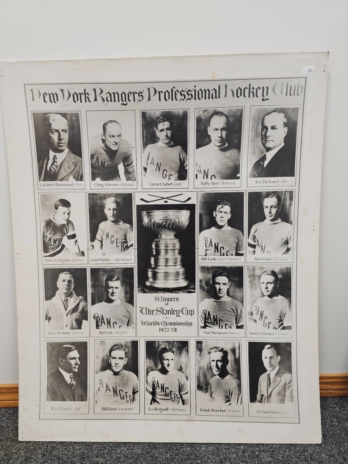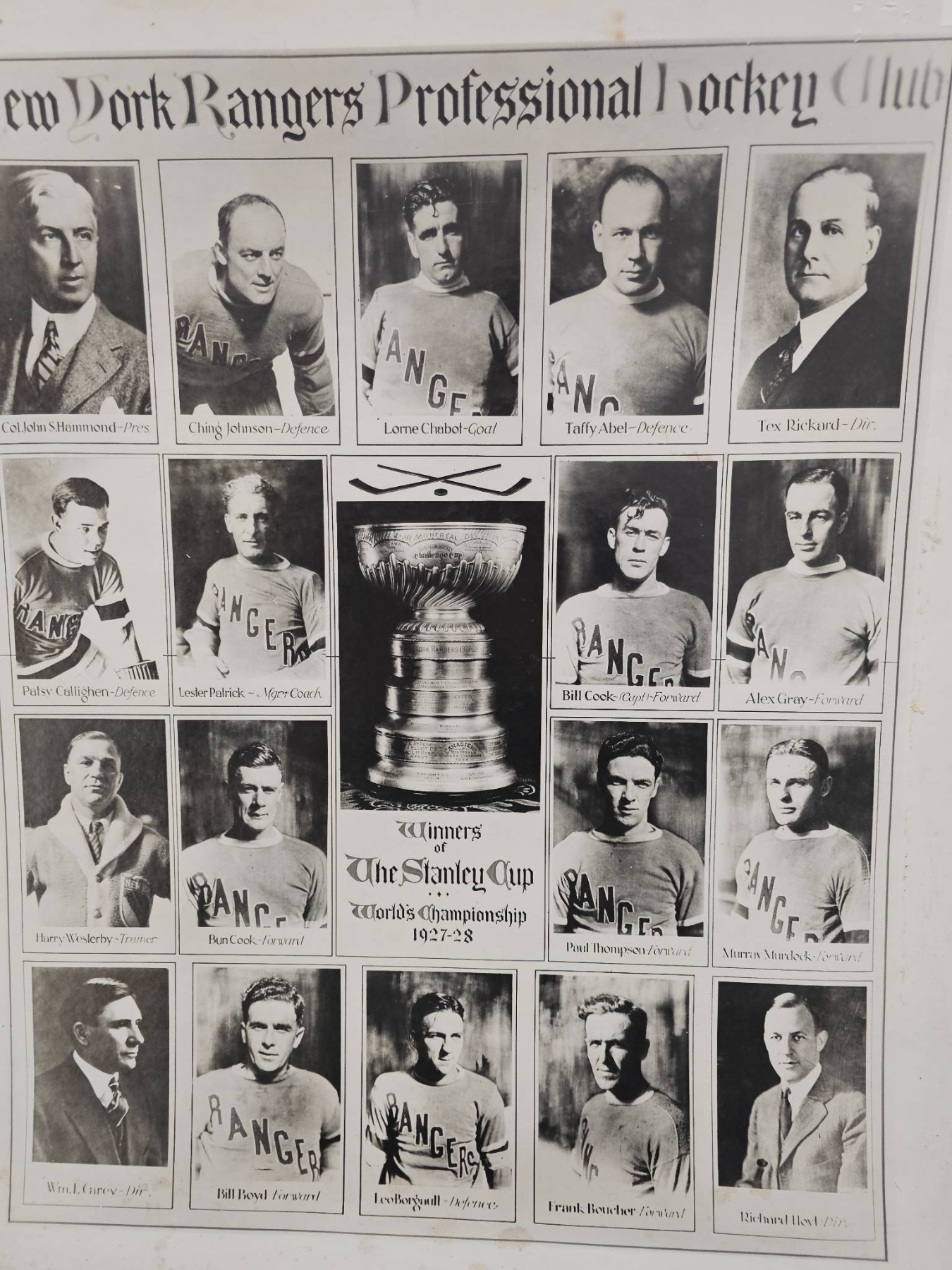 Framed black-and-white collage featuring members of the New York Rangers 1927-1928 Stanley Cup-winning team. Includes individual portraits of prominent players and coaches alongside an image of the Stanley Cup. Measures 22 x 27 inches. In fair condition with signs of age-related wear. A remarkable piece of hockey history, perfect for enthusiasts and collectors alike.