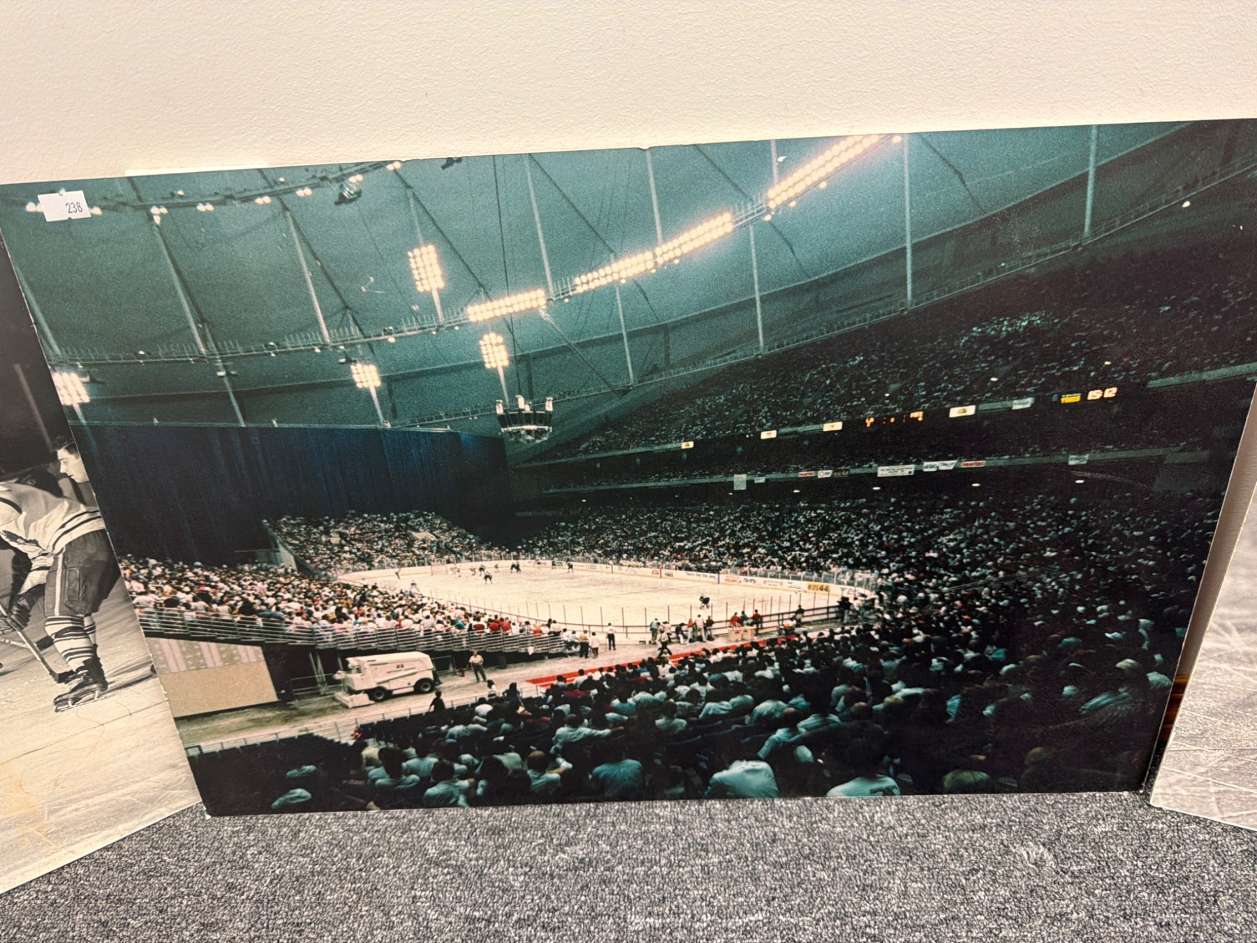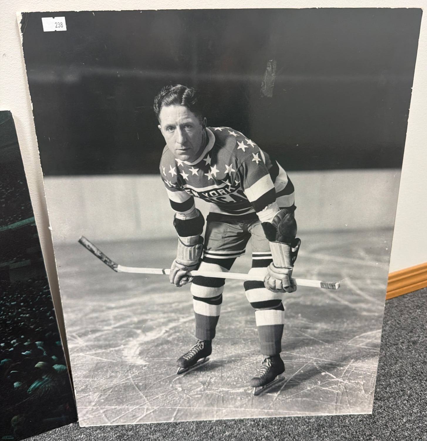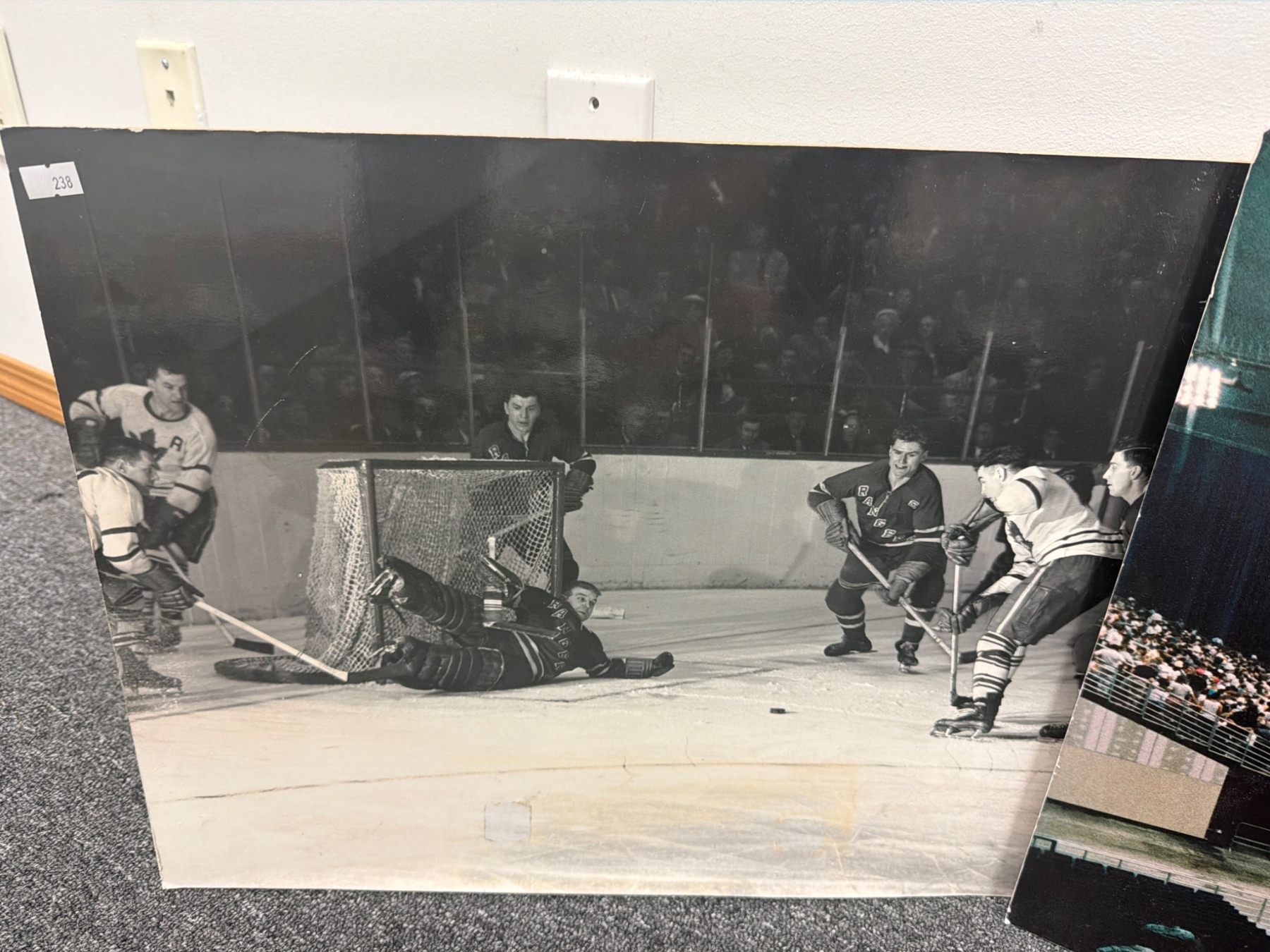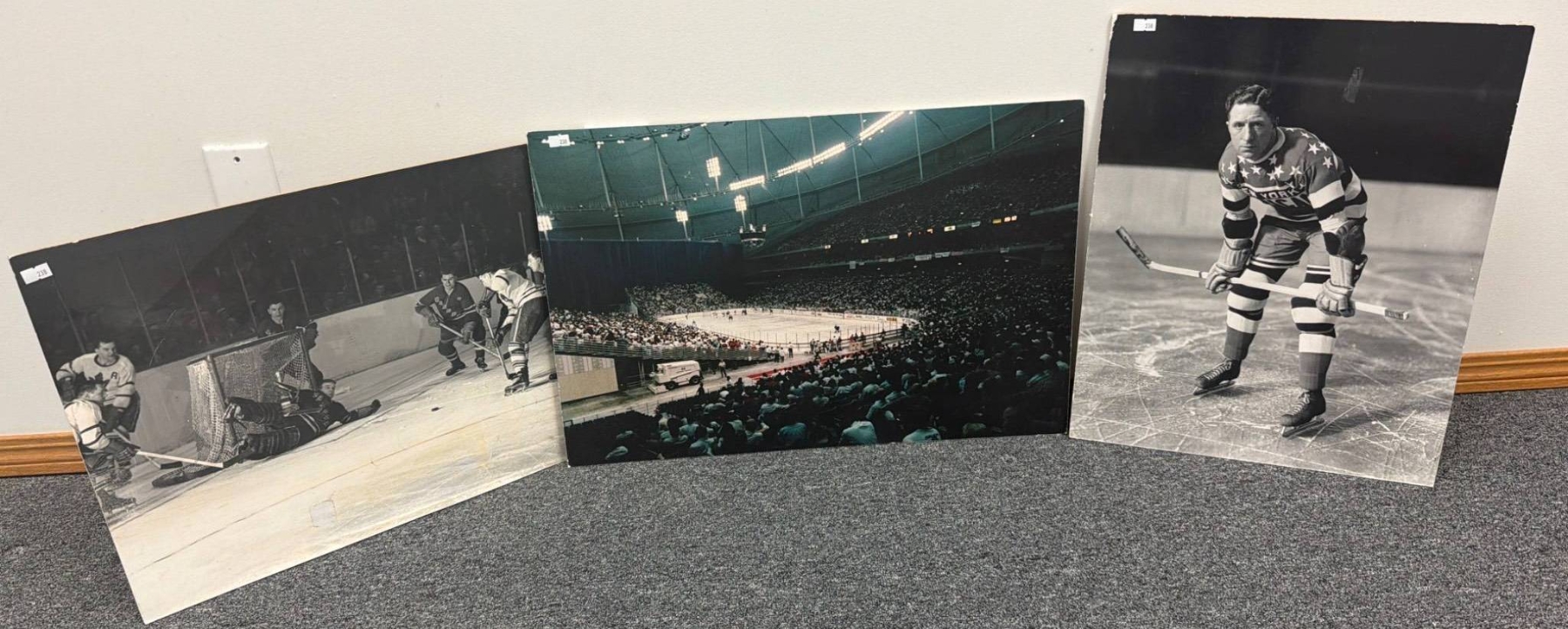 Three large-format hockey photographs featuring the New York Rangers. Includes one action shot of a game, one wide-angle view of a crowded arena, and one striking portrait of a player in a Rangers uniform. Each piece showcases key moments in hockey history, perfect for collectors or fans. Condition shows some minor wear consistent with age.