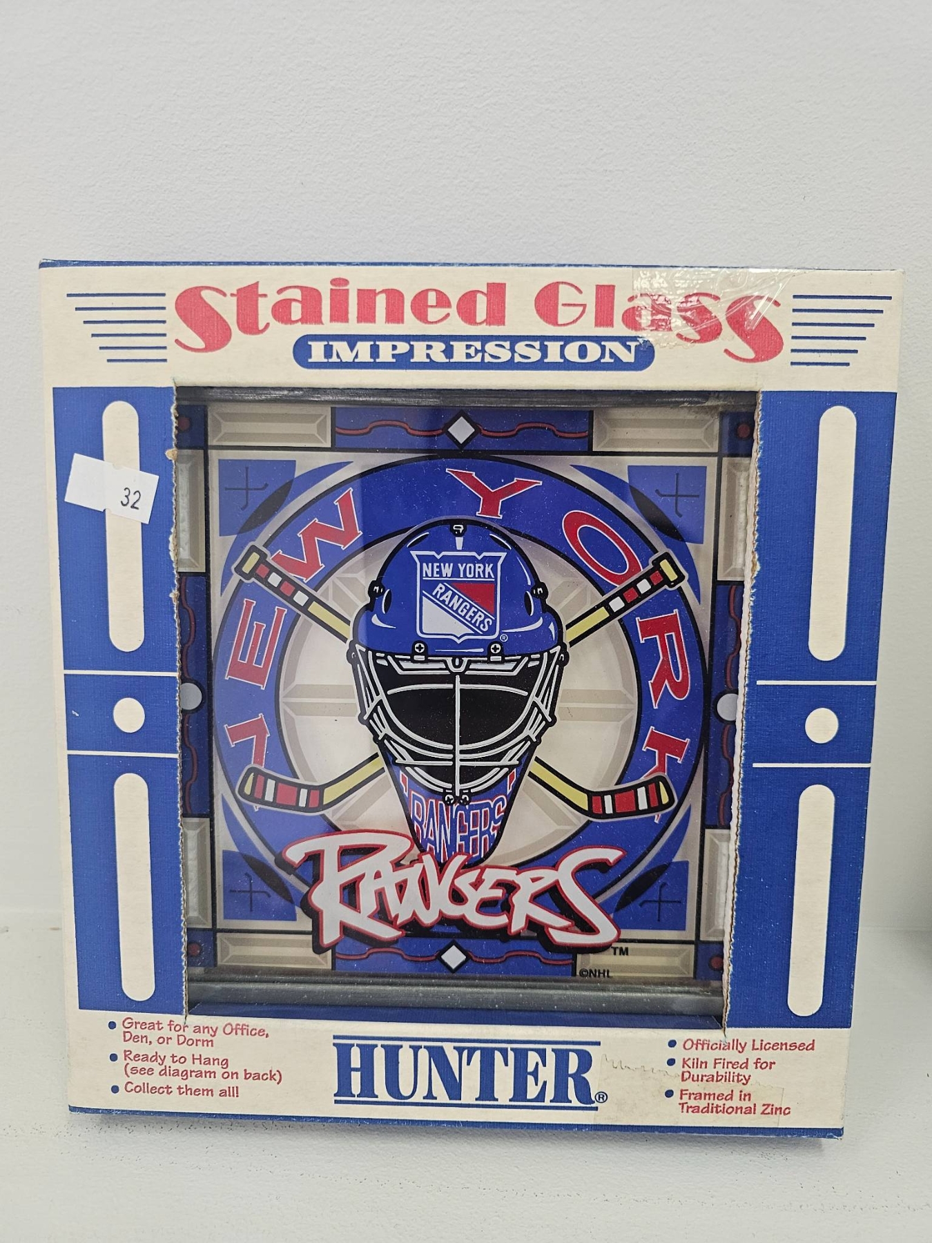 New York Rangers stained glass impression by Hunter. Measures 6.5 x 6.5 inches and features the team's iconic logo with crossed hockey sticks and a helmet design. Licensed NHL merchandise. Packaged in the original box, which shows minor wear.