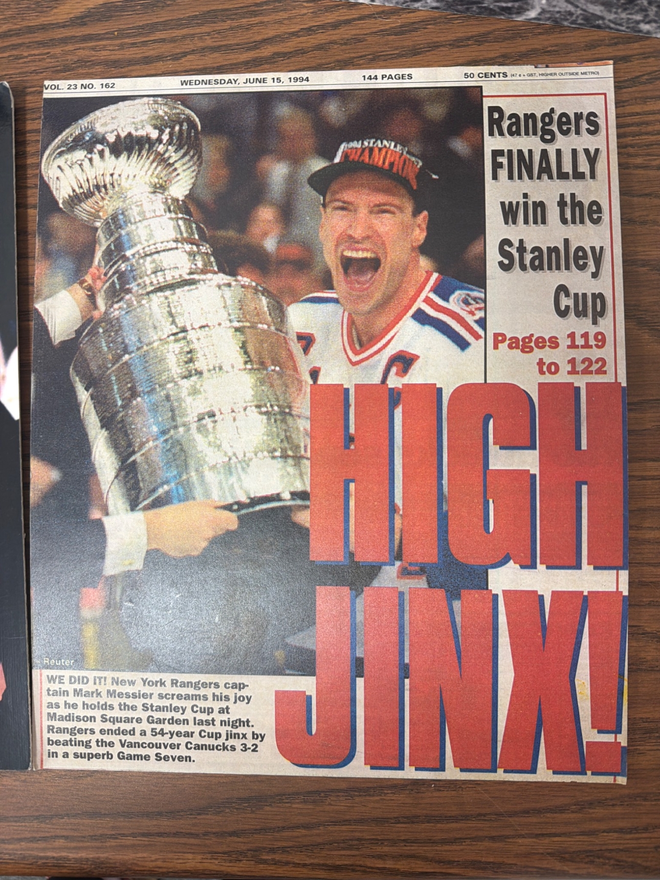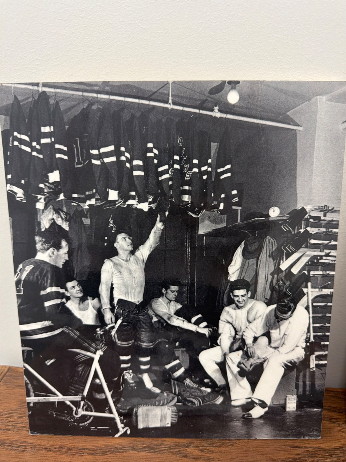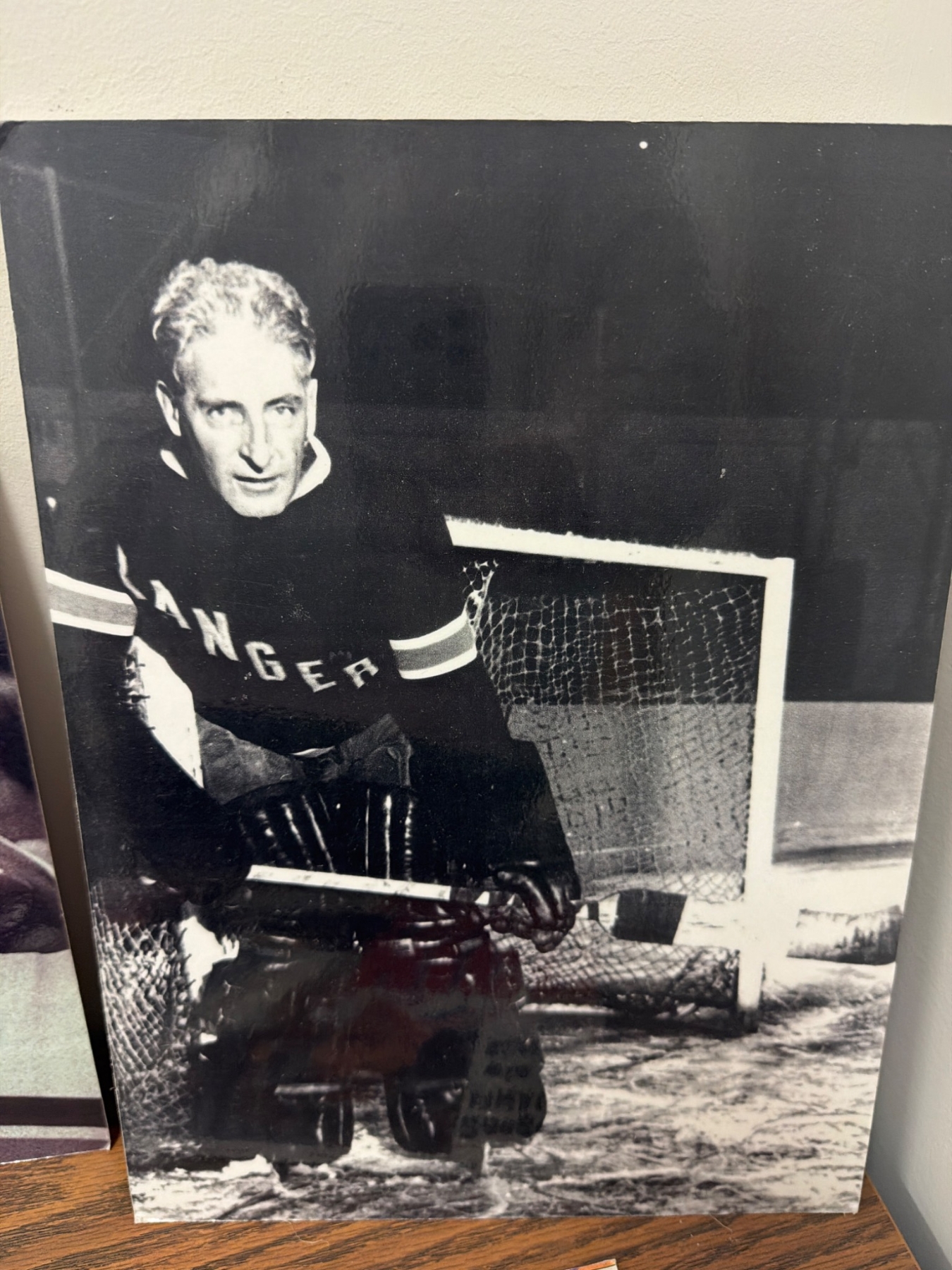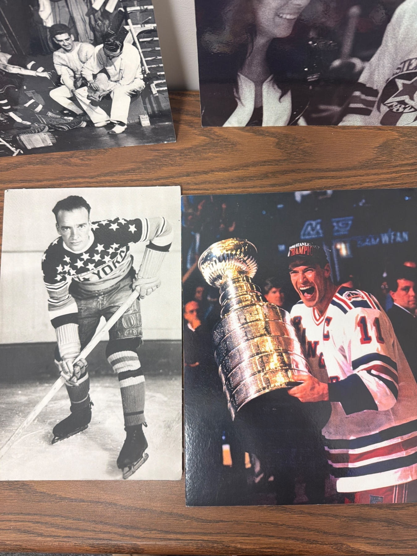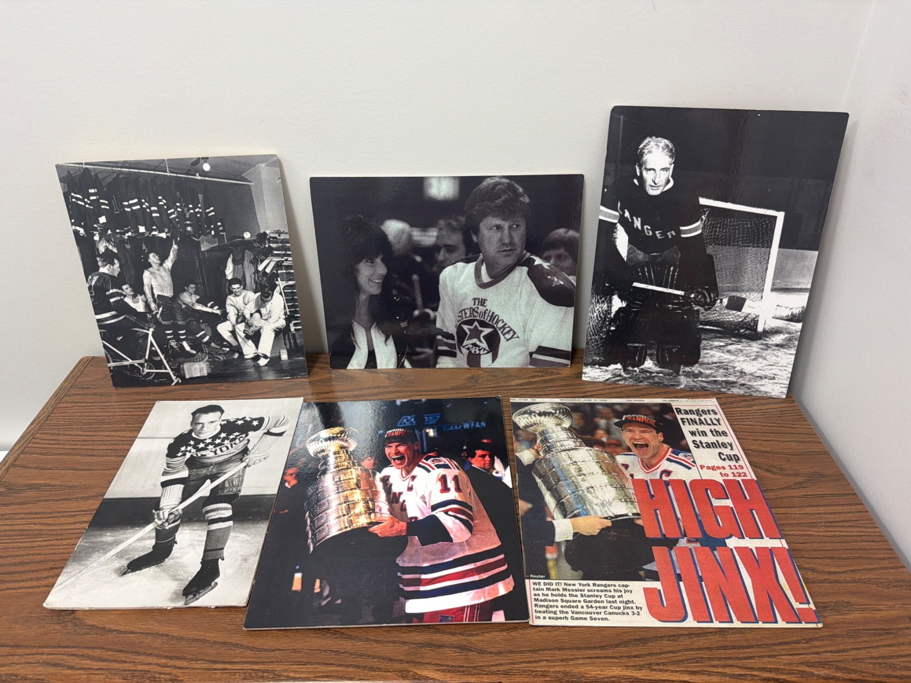 A diverse collection of six prints and photographs related to the New York Rangers, including action shots, locker room scenes, and a celebratory depiction of the team's Stanley Cup win. These items capture historic moments and players in Rangers history, offering a nostalgic look for fans and collectors. Condition appears good with prints ready for display or collection.