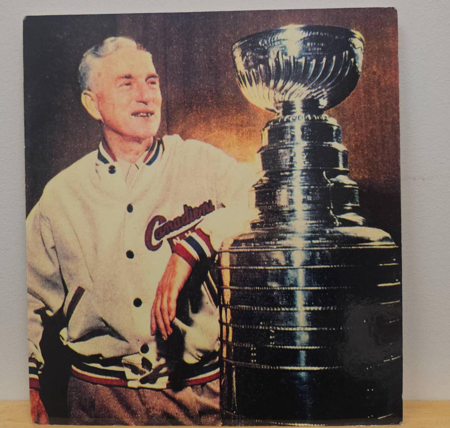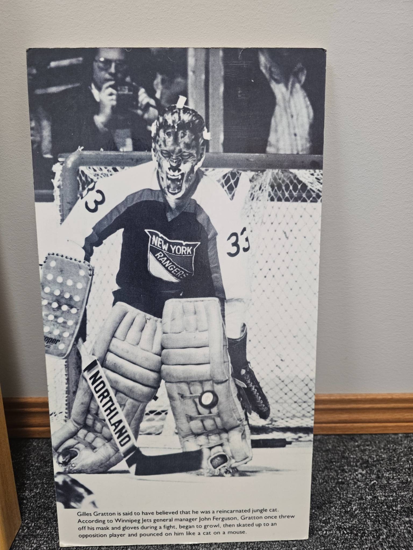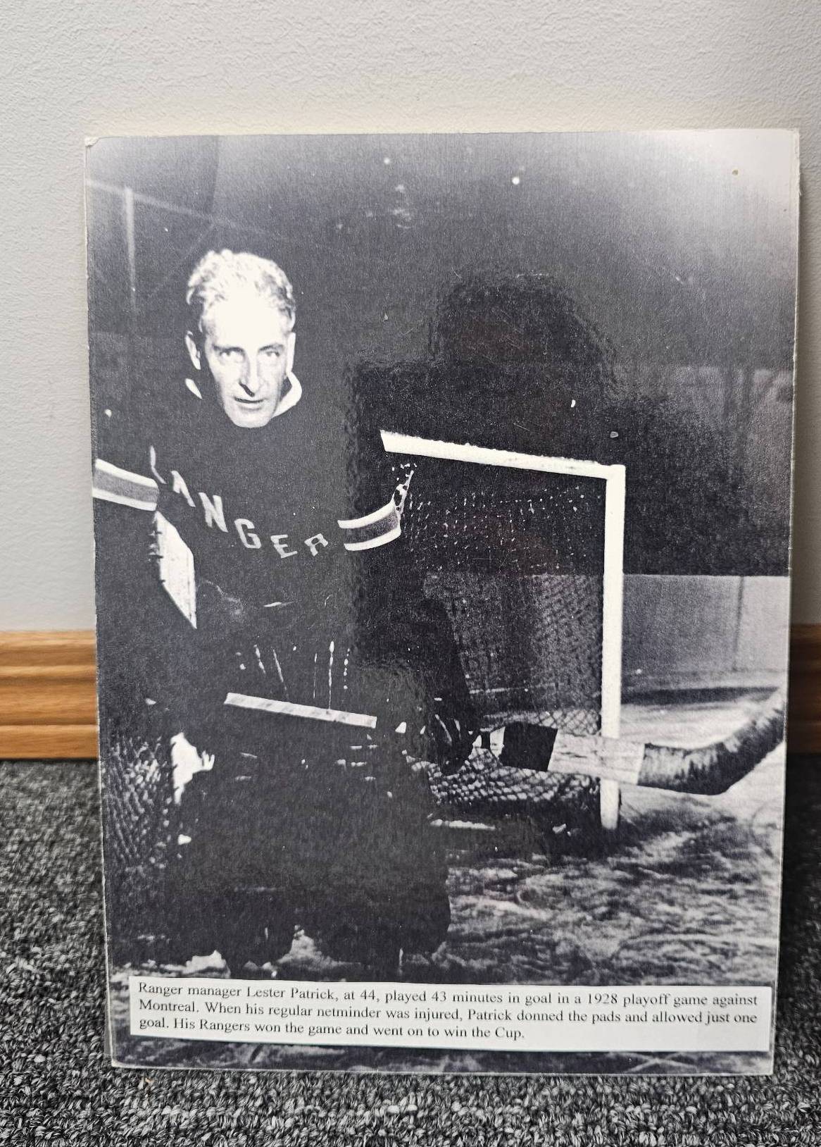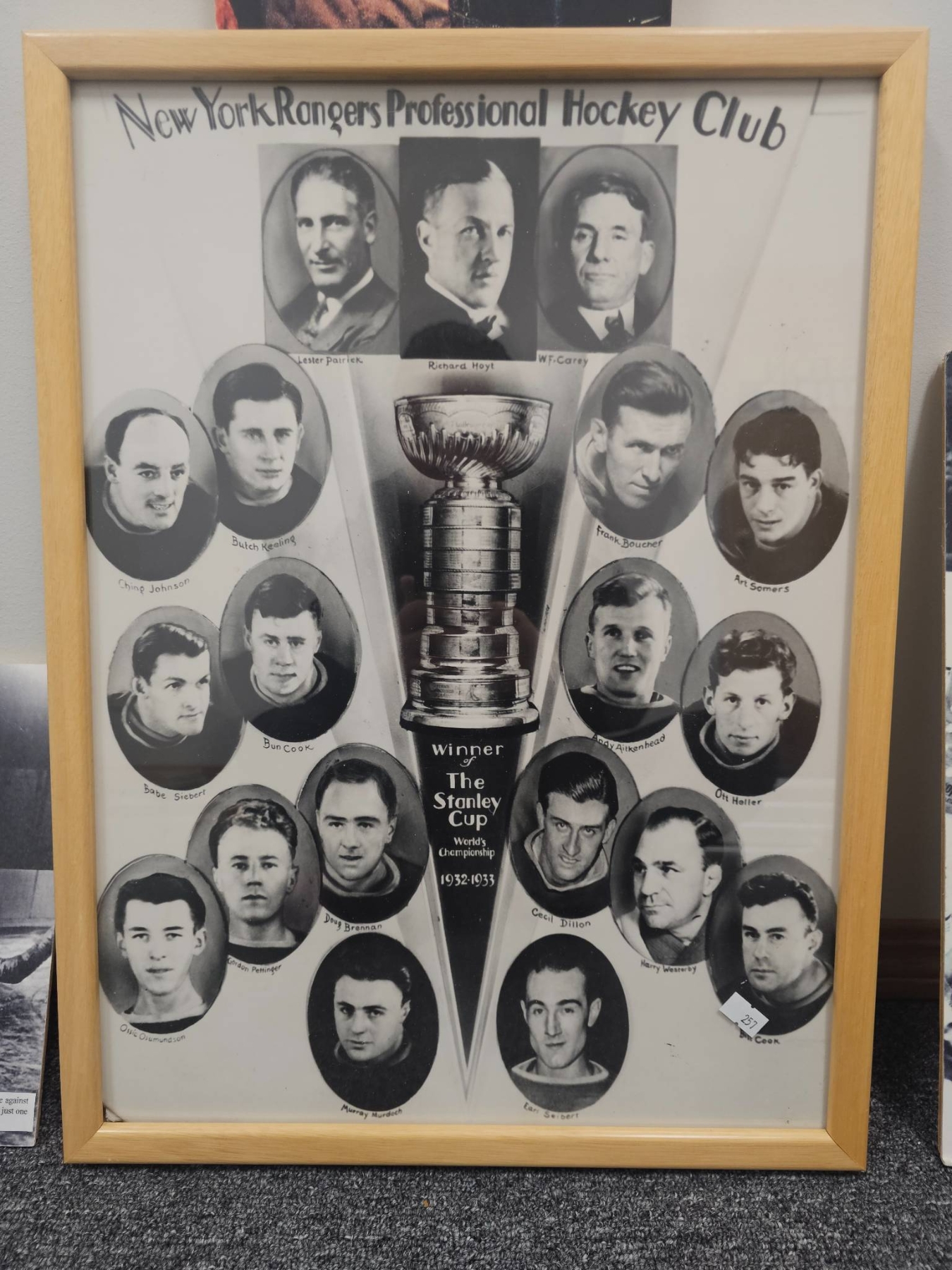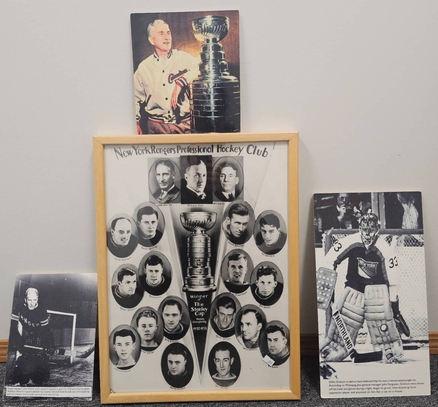 New York Rangers memorabilia featuring a framed team photo from their Stanley Cup victory era, a striking image of a team goalie in action, a historic player portrait with accompanying caption, and a colored print of a coach alongside the Stanley Cup. Perfect for hockey fans or collectors seeking a touch of NHL history.