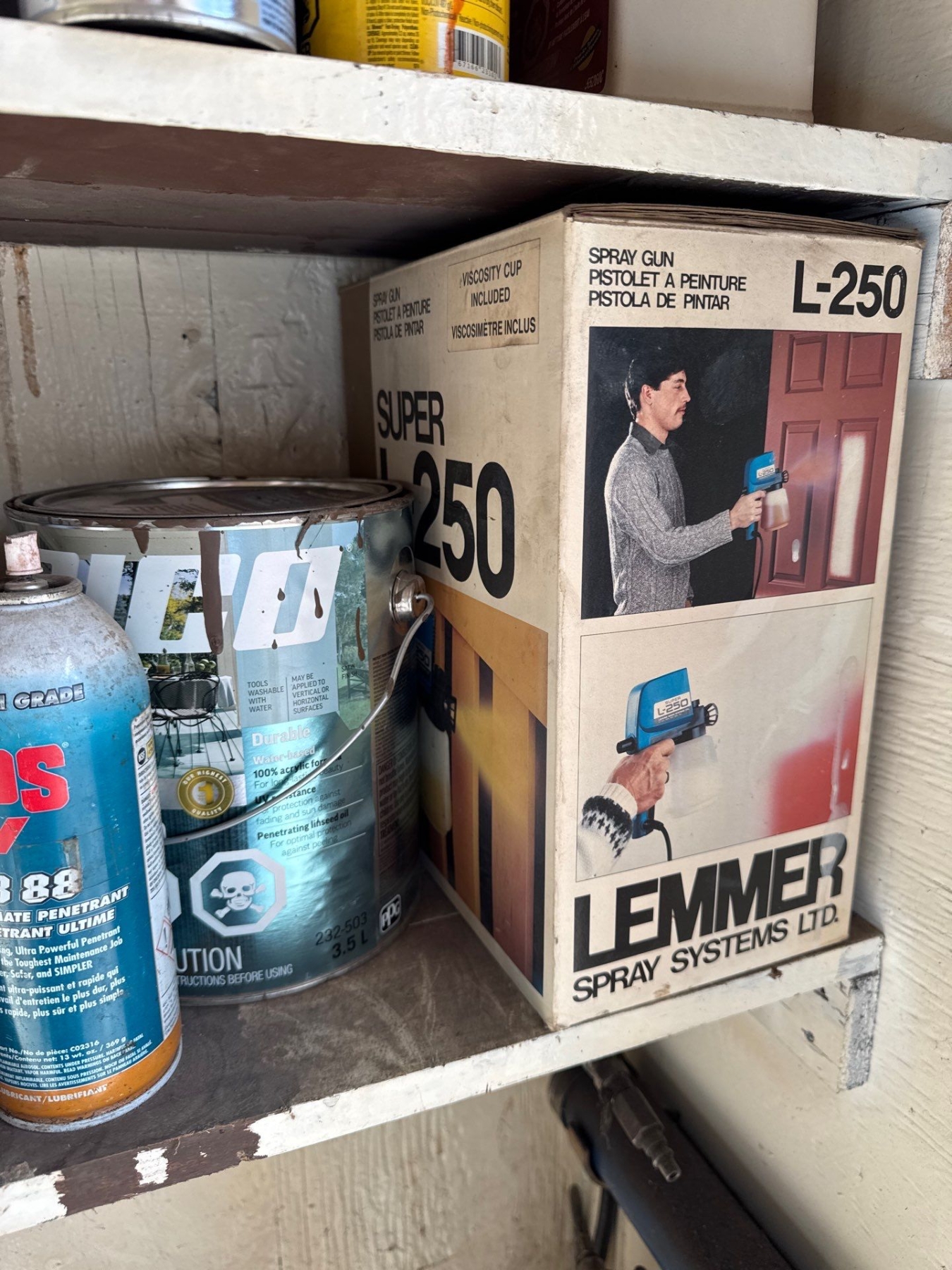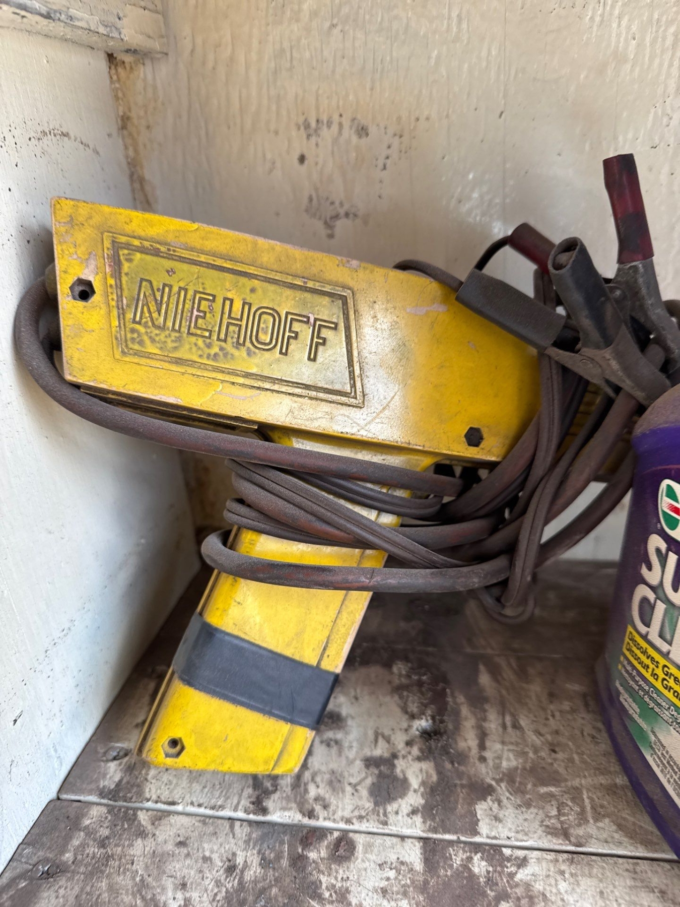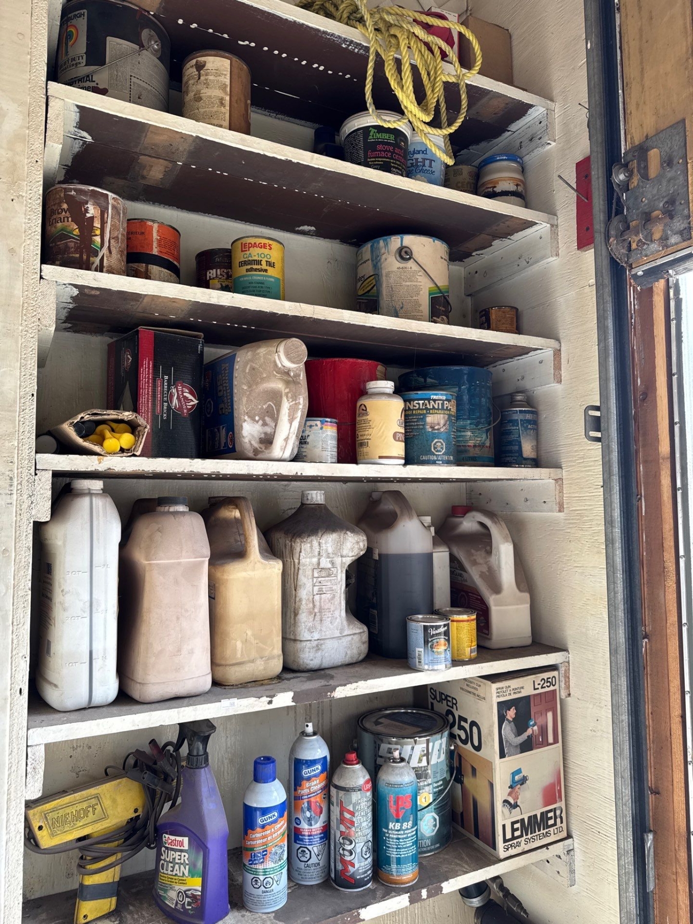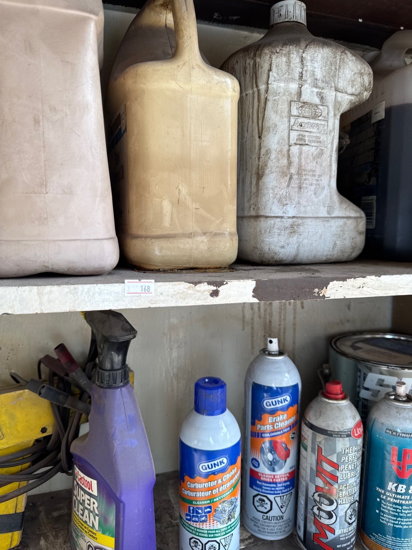 Niehoff stud welder paints various liquid liquids rope on top shelf all items on shelf included