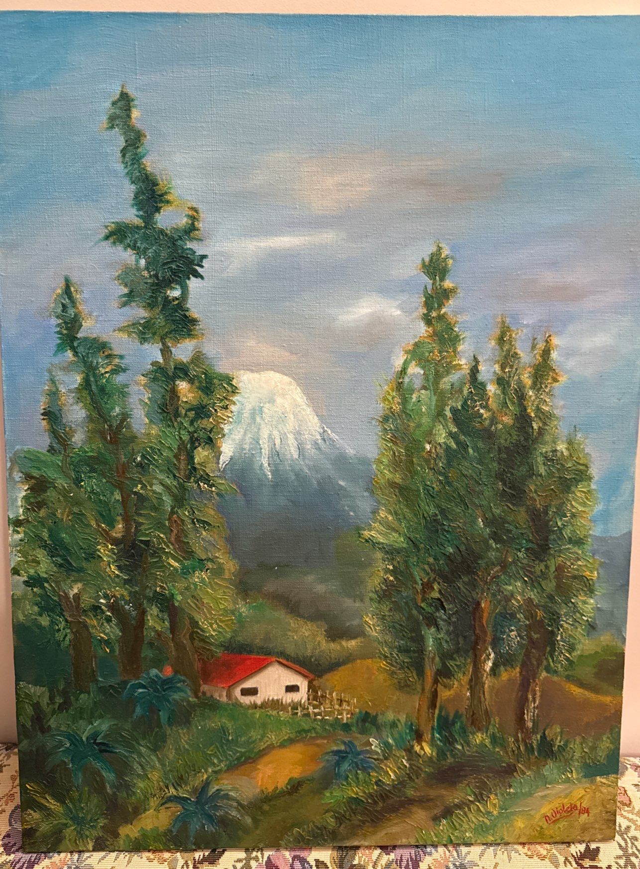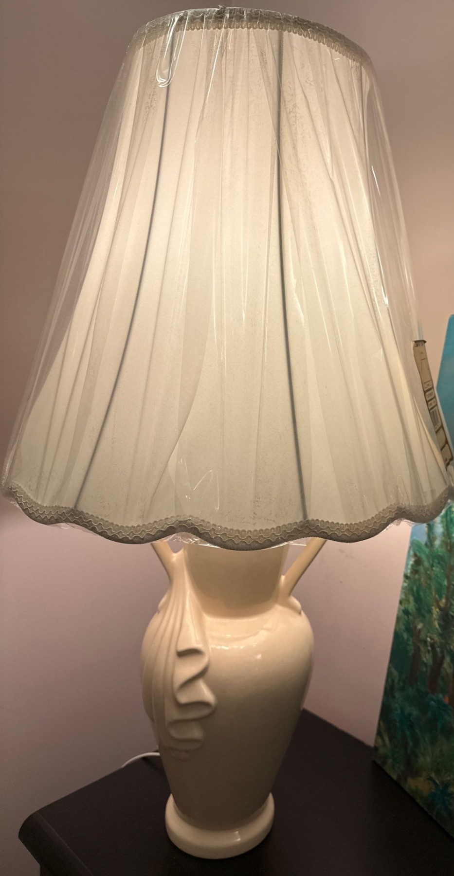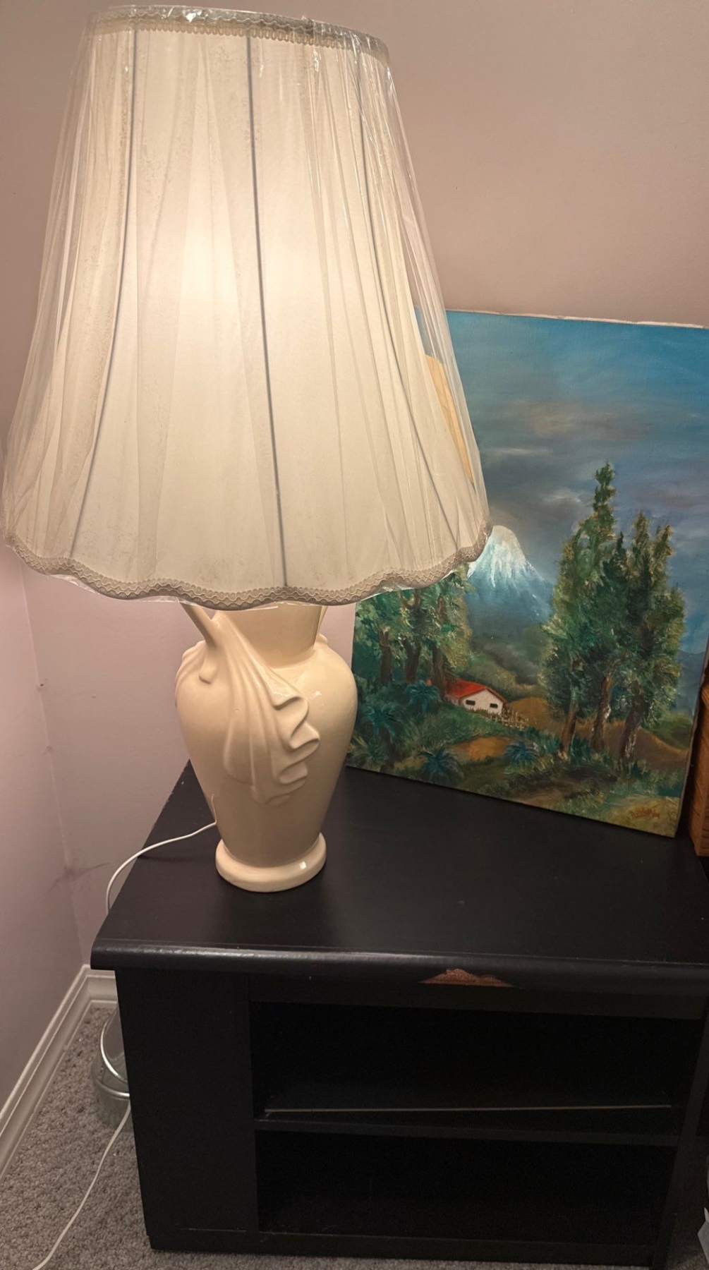 Night Stand End Table w/ Bow Lamp & Original Oil On Canvas Art Piece 20T