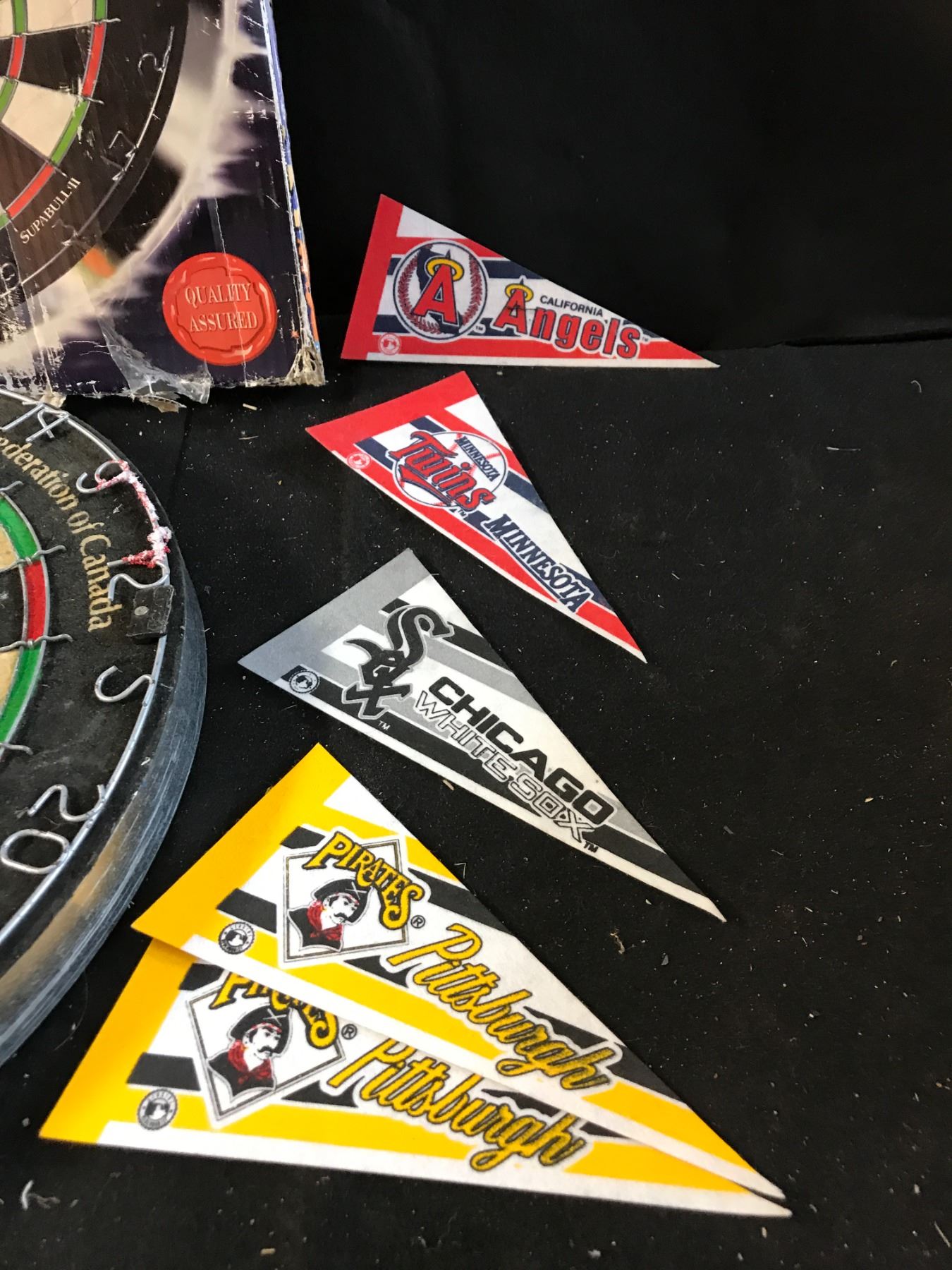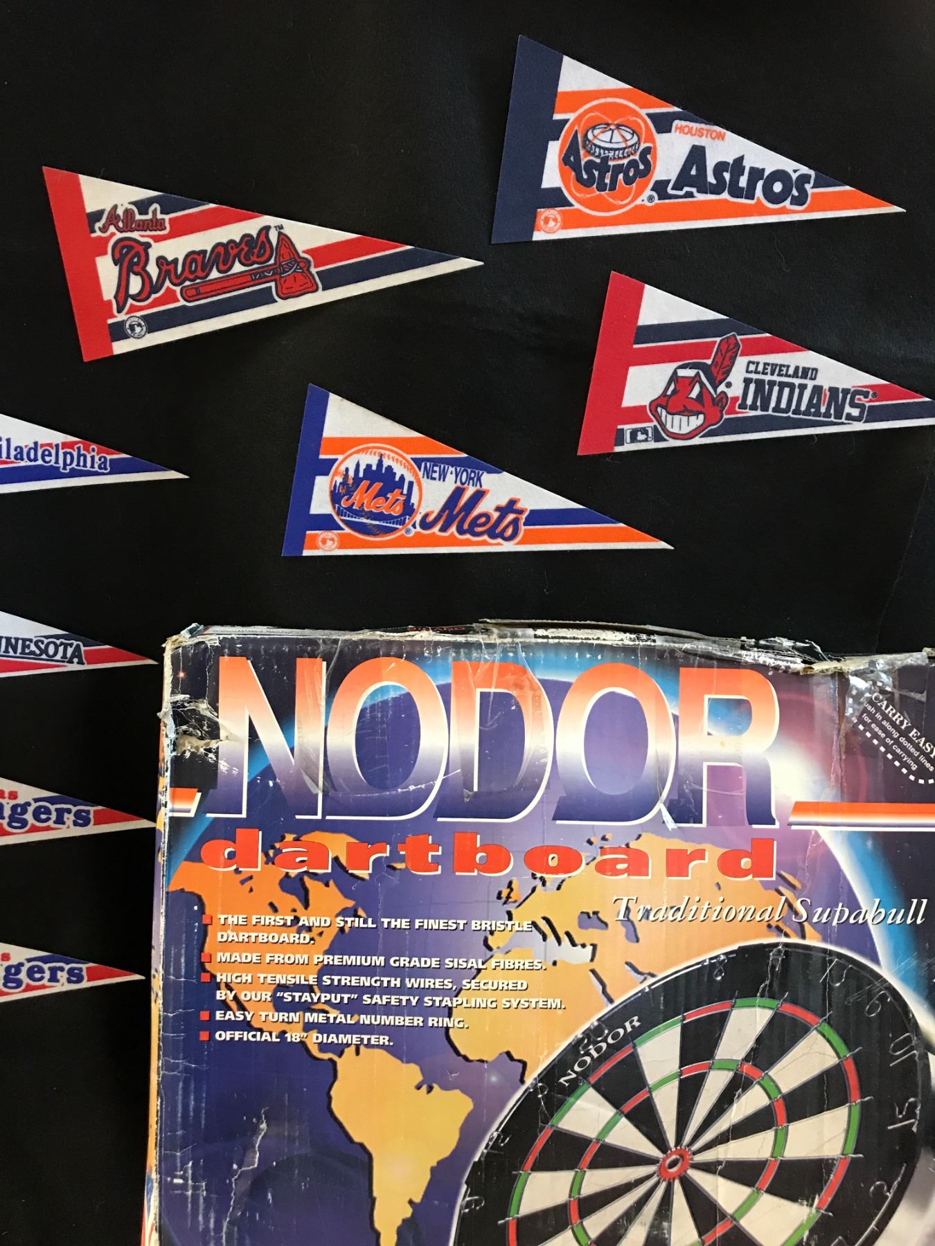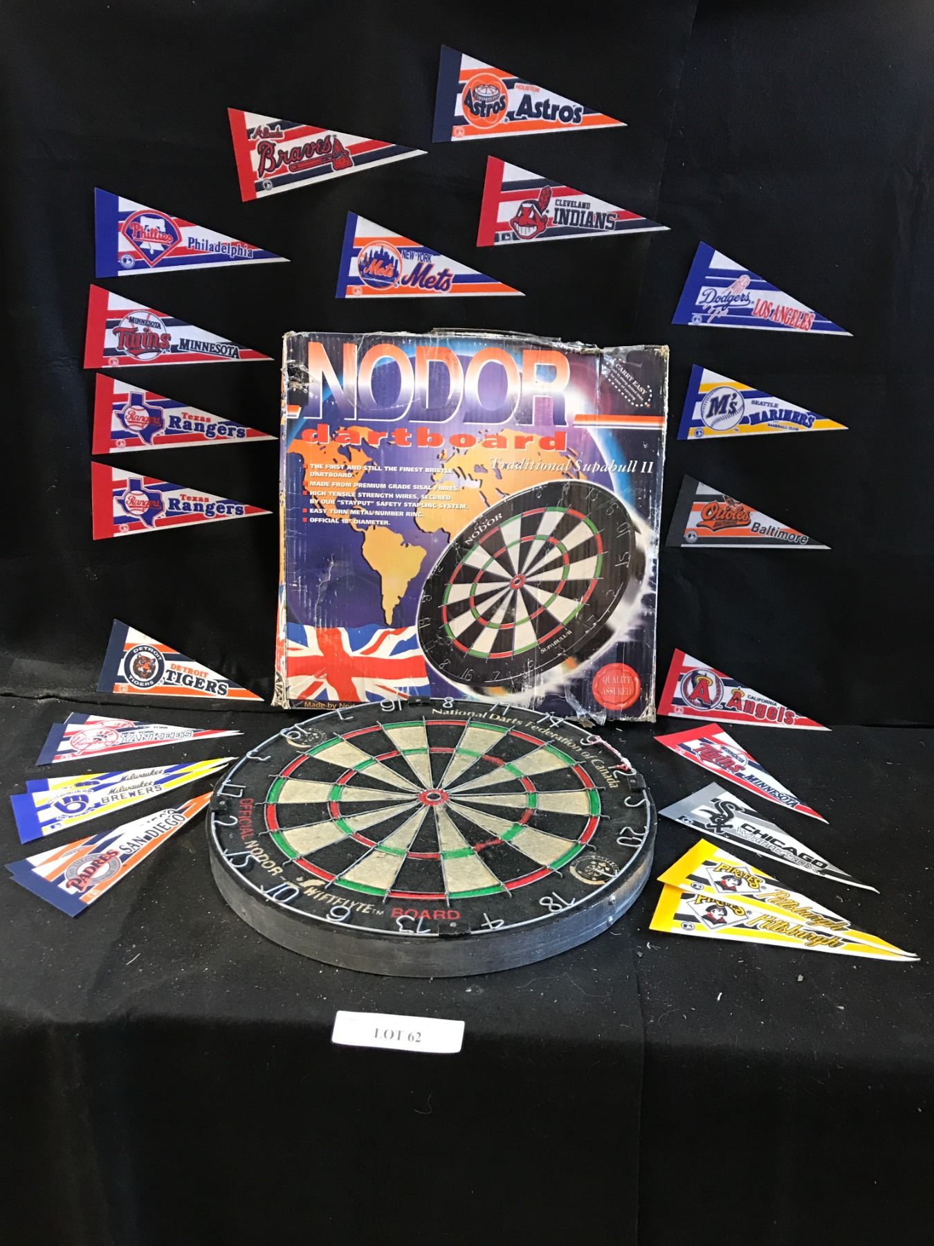 Nodor Dartboard & 20 Banners incl San Diego Padres, Milwaukee Brewers, NY Yankees, Detroit Tigers, 2 Texas Rangers, 2 Minnesota Twins, Philadelphia Phillies, Atlanta Braves, Houston Astro's, Cleveland,Indians, New York Mets, Los Angeles Dodgers, Seattle Mariners, Baltimore Orieles, California Angels, Chicago Whitesox 2 Pittsburgh Pirates