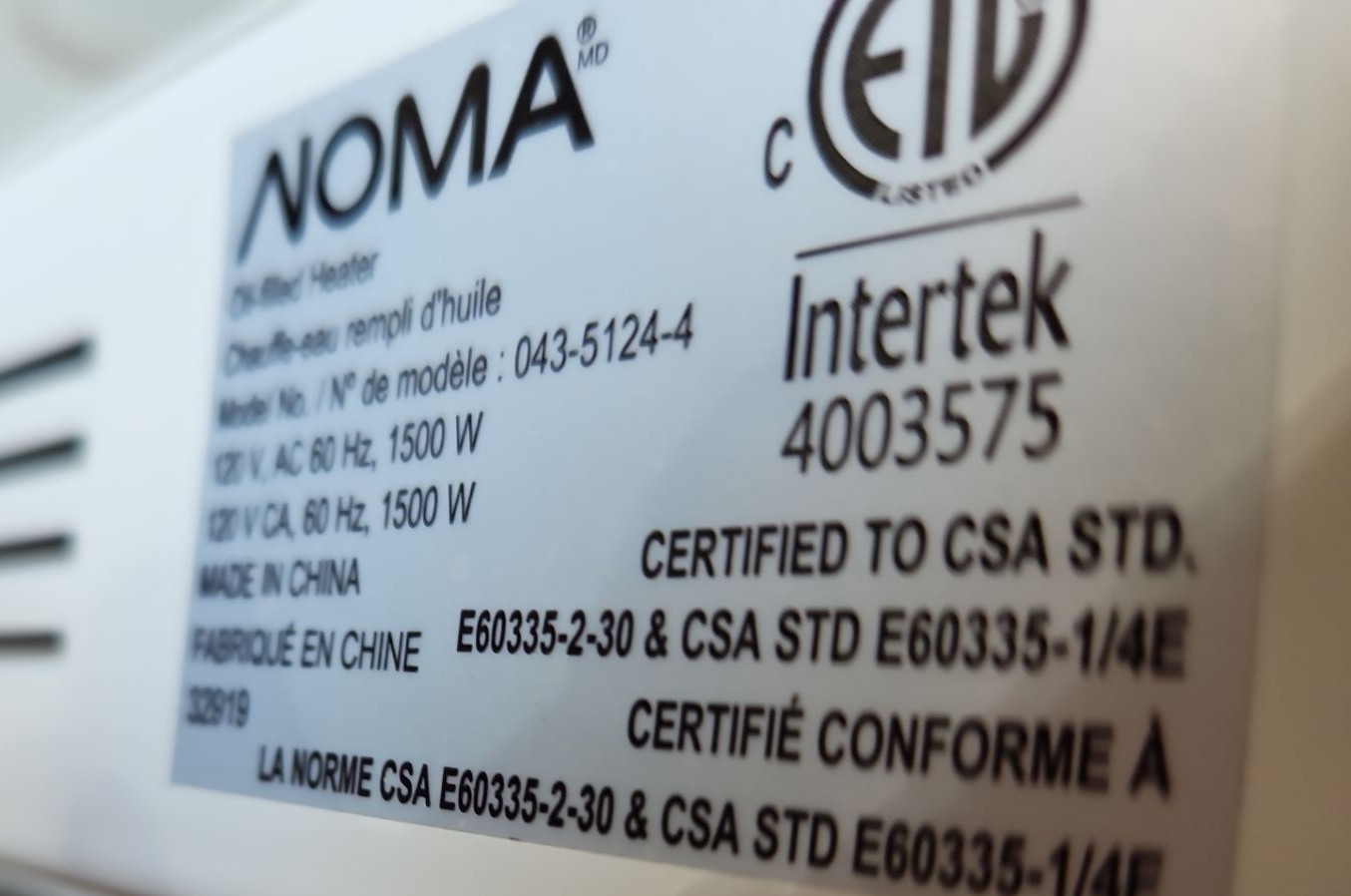 Noma Model 043-5124-4 Space Heater 6 W, 13 D, 24 T