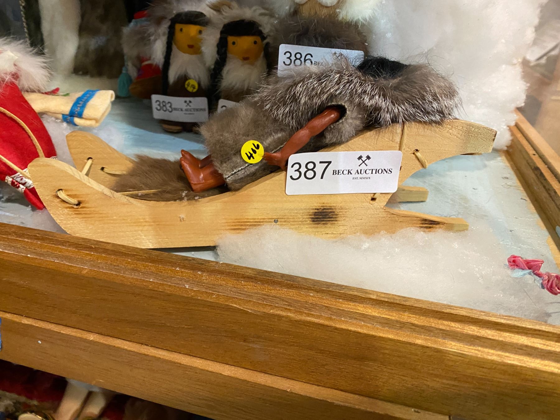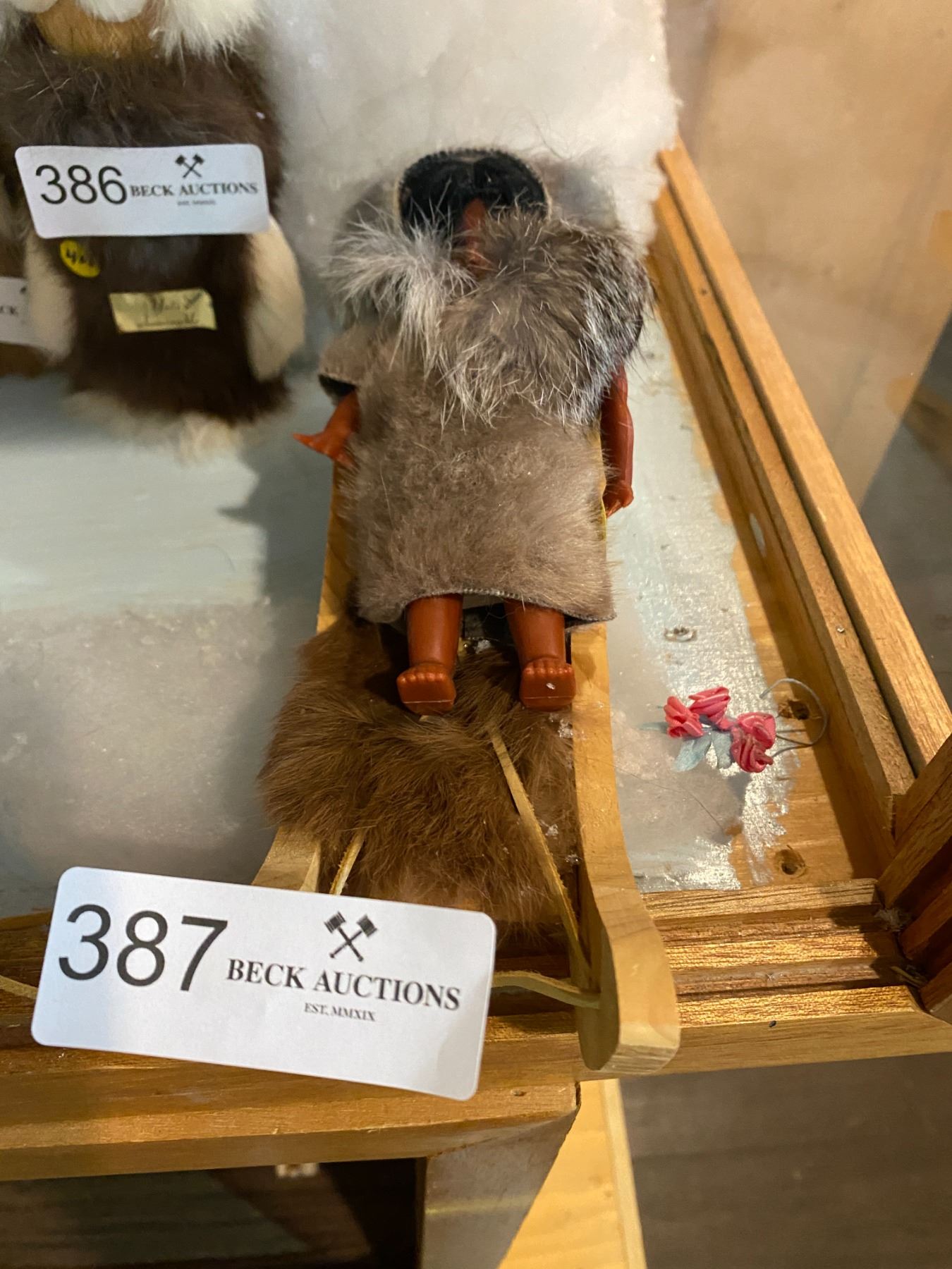 North Pole - 1975 Celluloid Doll in Rabbit Fur & Seal Skin, Dog Sled