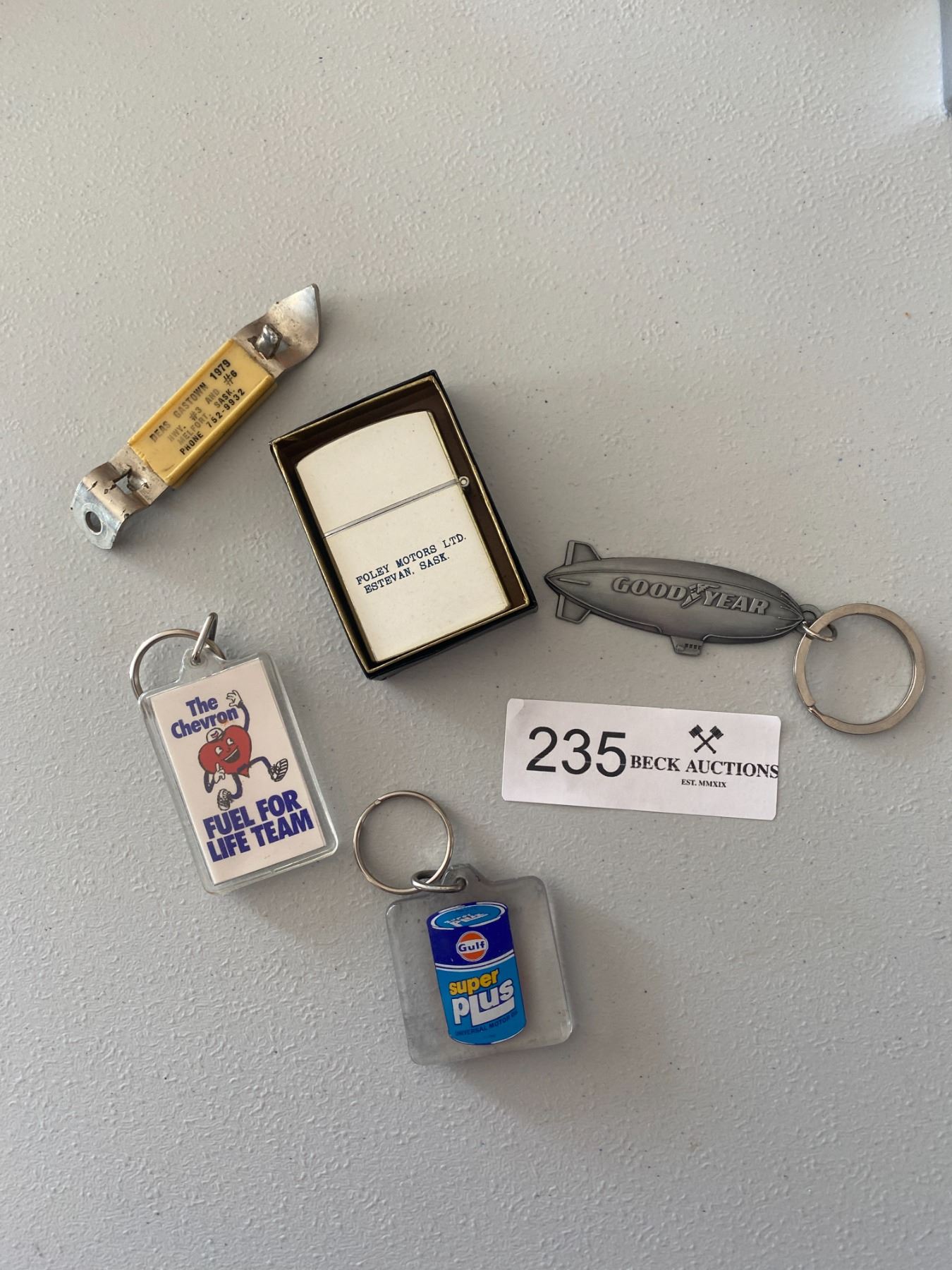 Chevron, Good Year, Gulf keychains with a Zippo and bottle opener