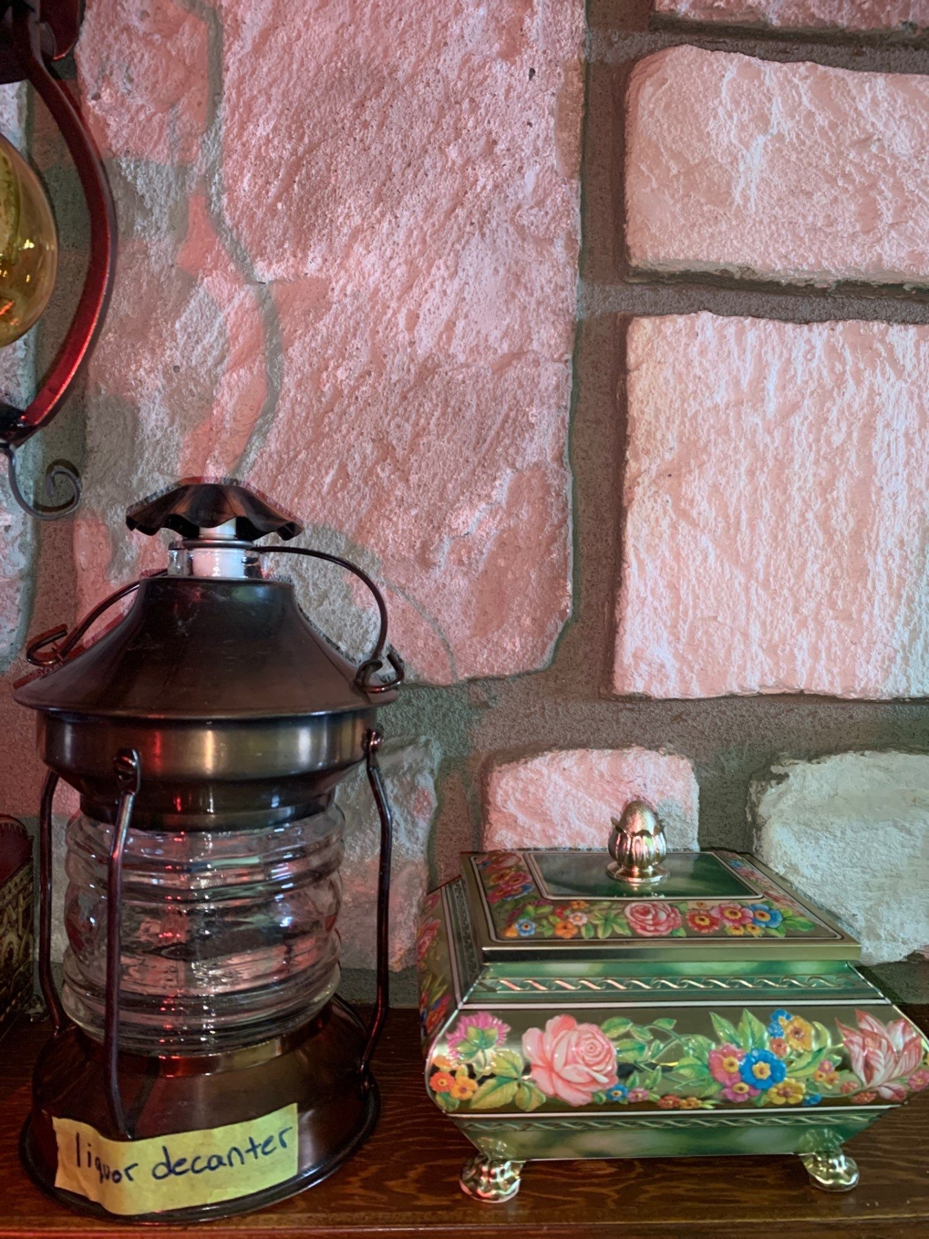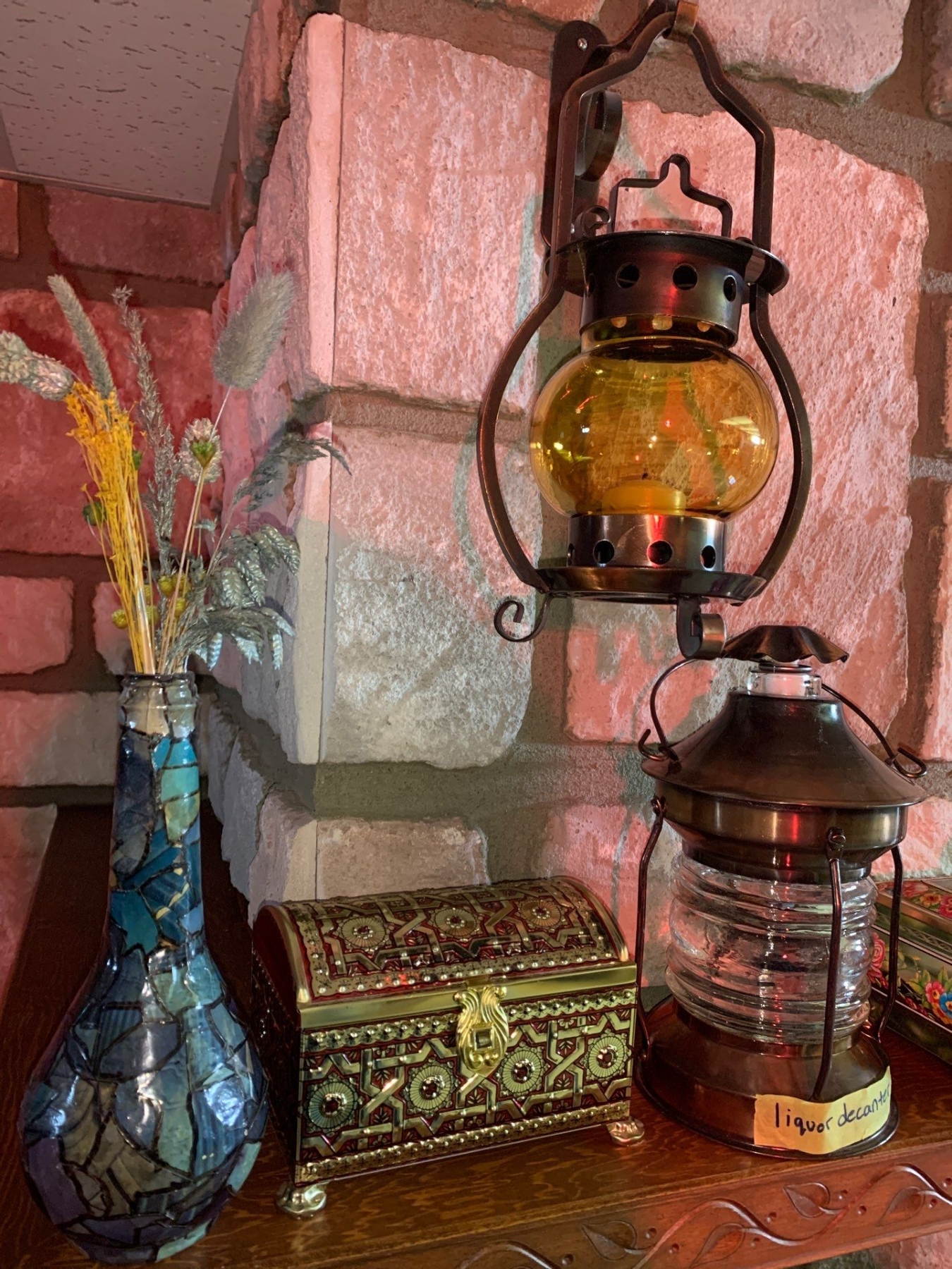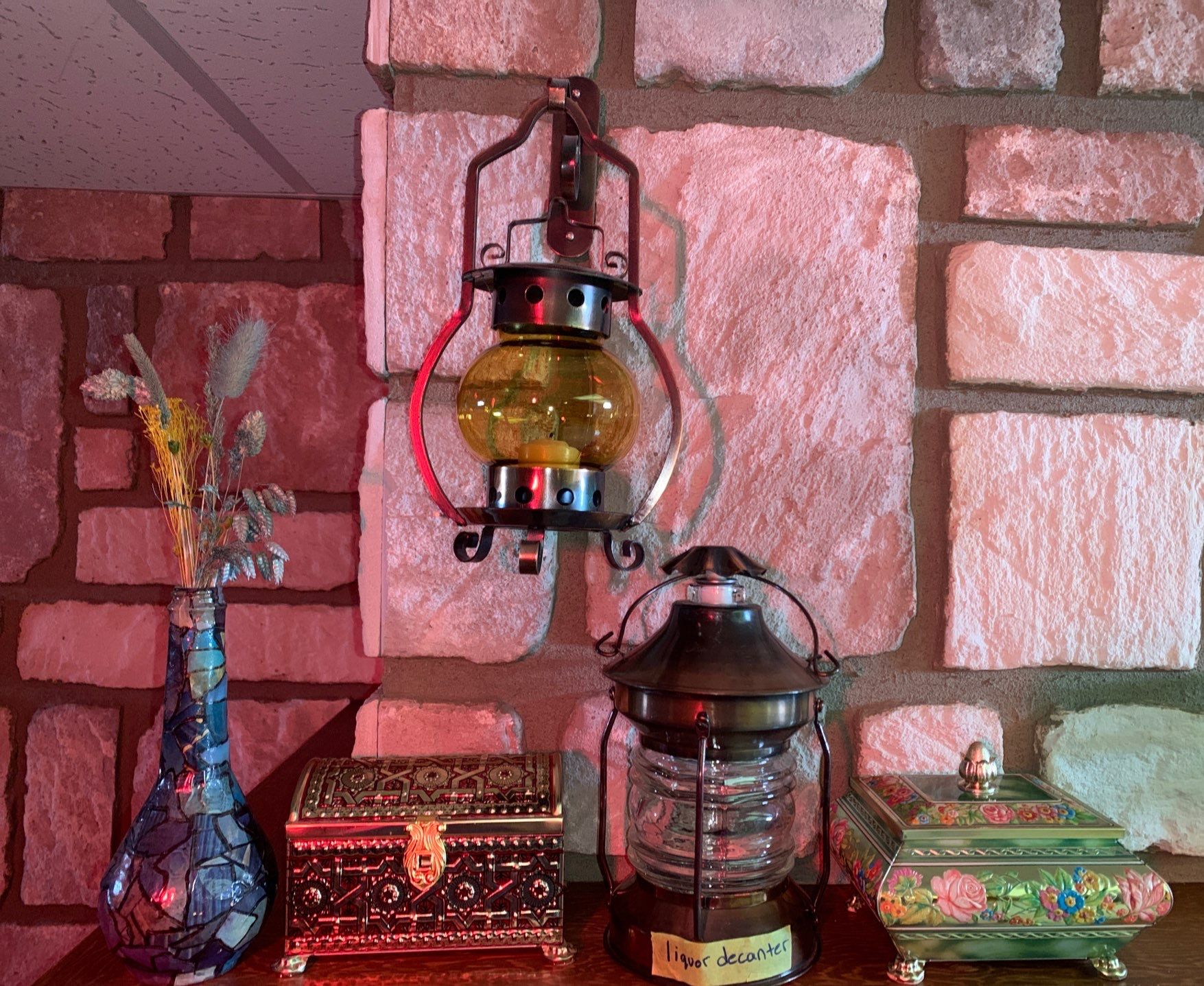 Oil lamp Liquor Decanter w/ Decorative Tins, Hanging Oil Lamp Candle Holder, Decorative Vase