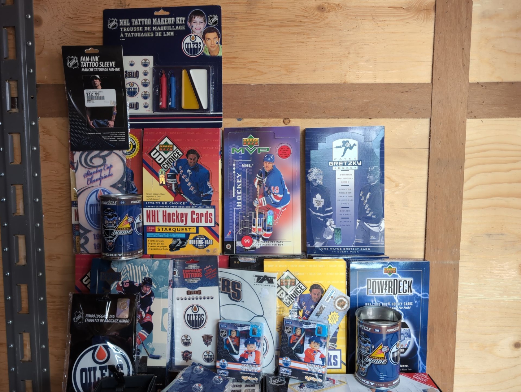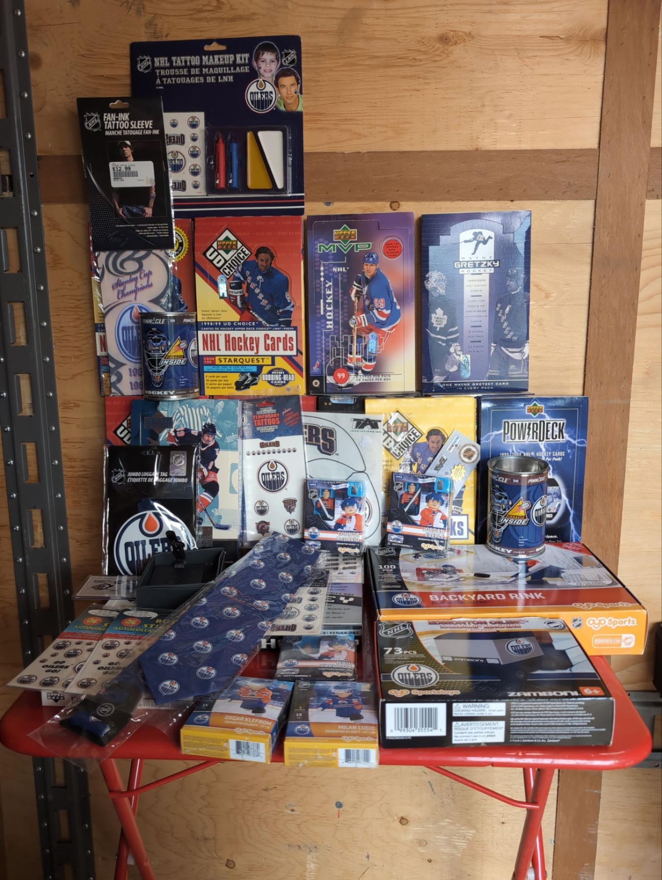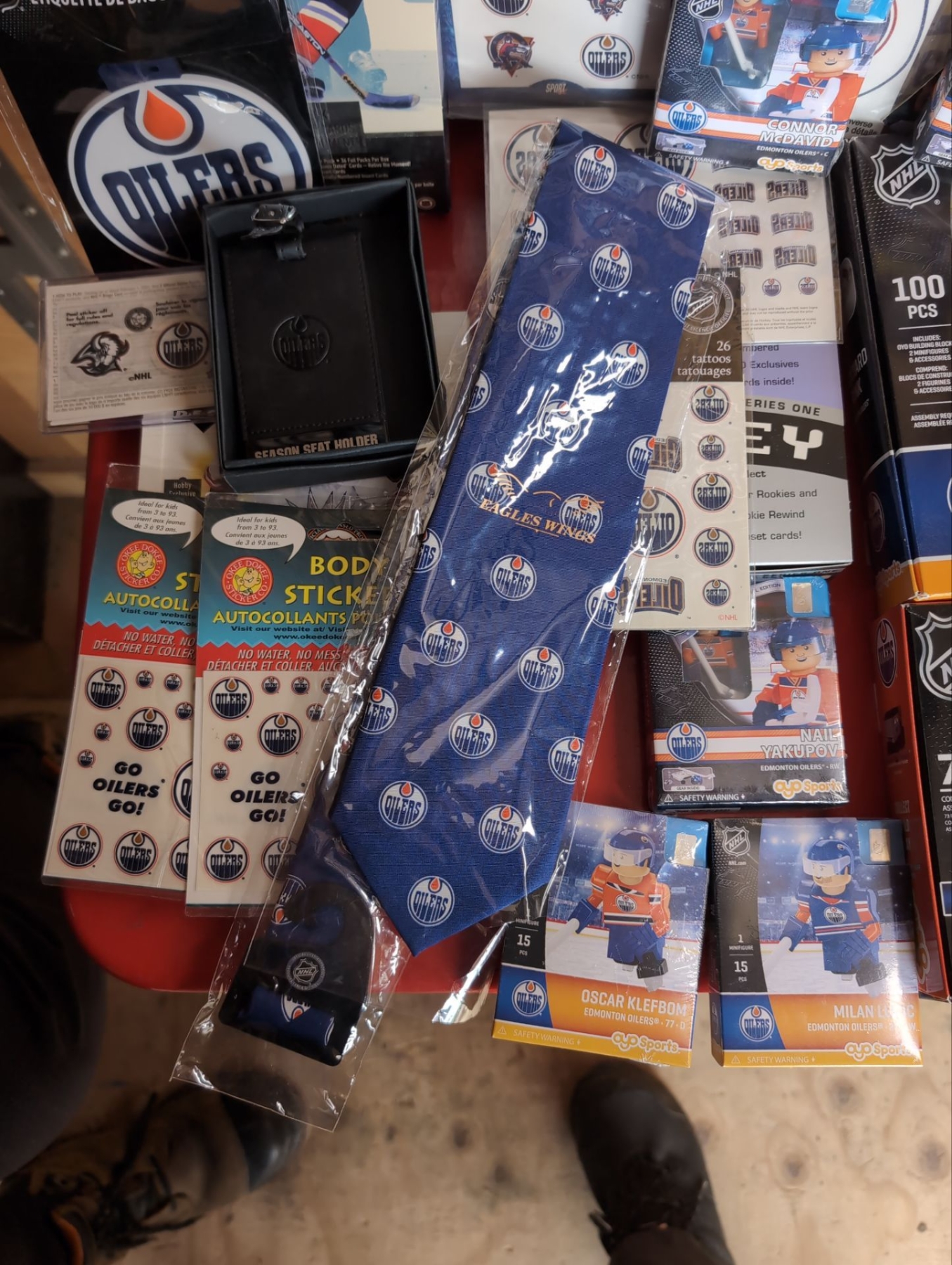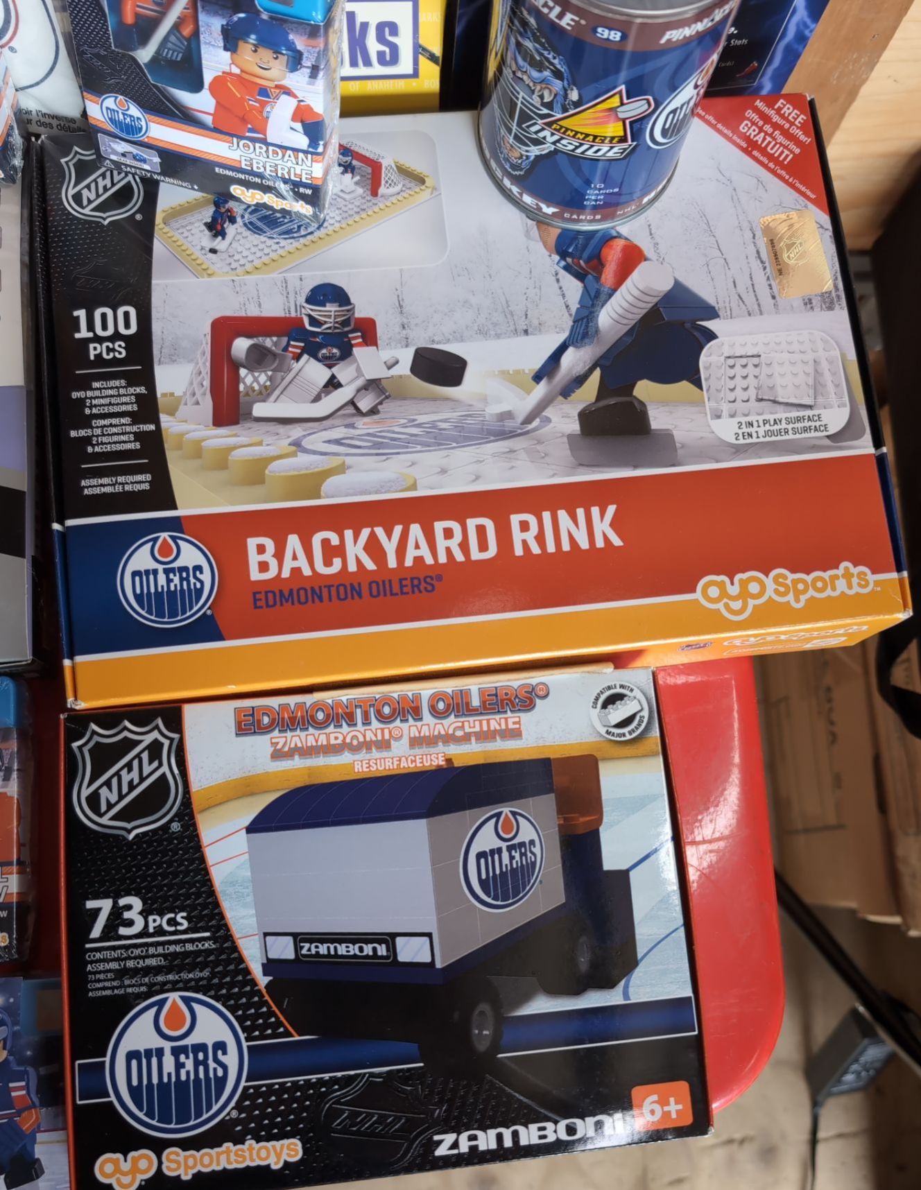Oilers Tie, Oilers Backyard Rink and Zamboni, Luggage Tags,, Lego Figurines, Empty Card Boxes