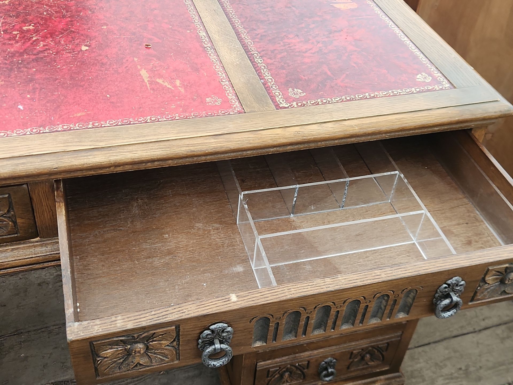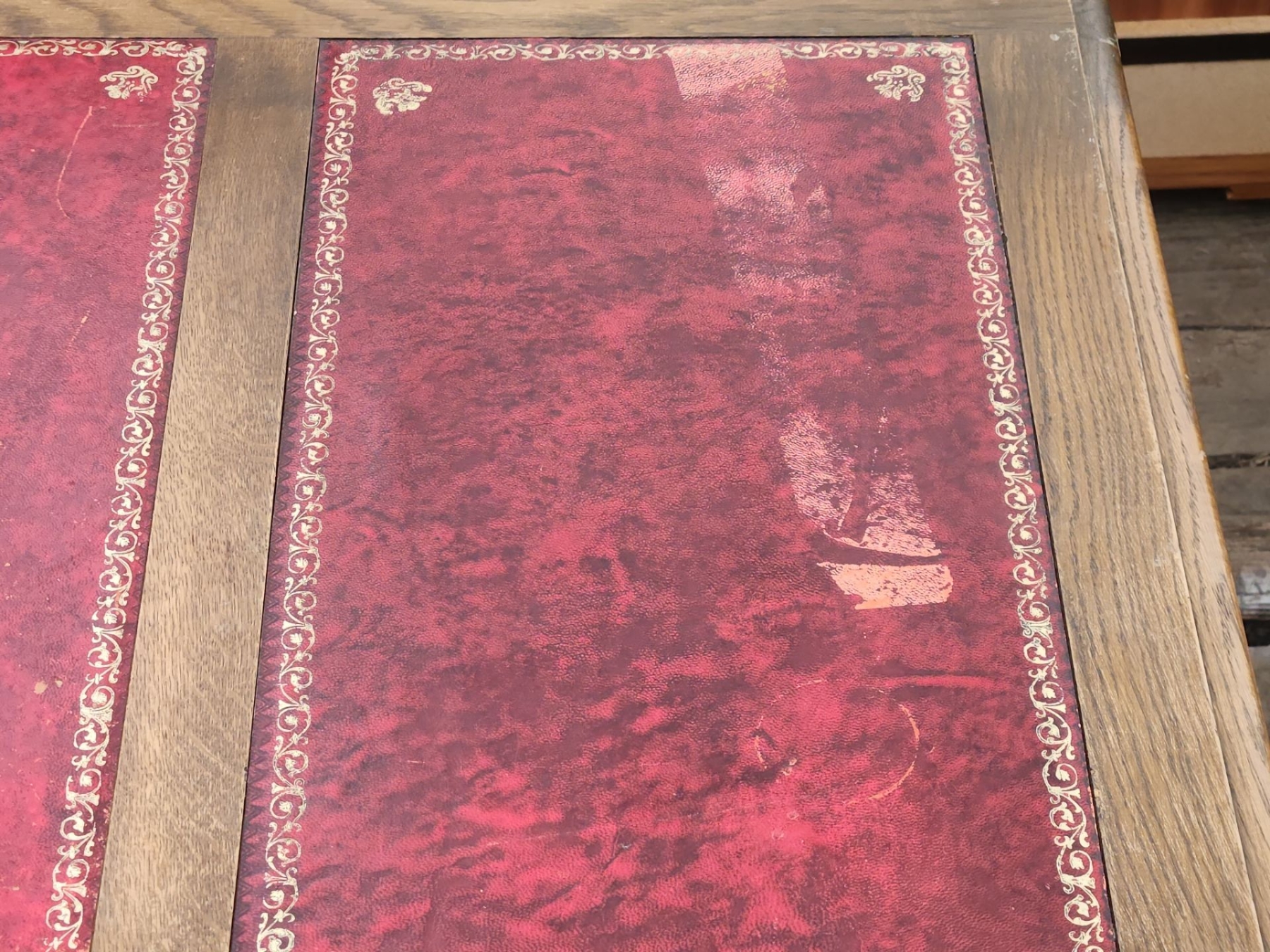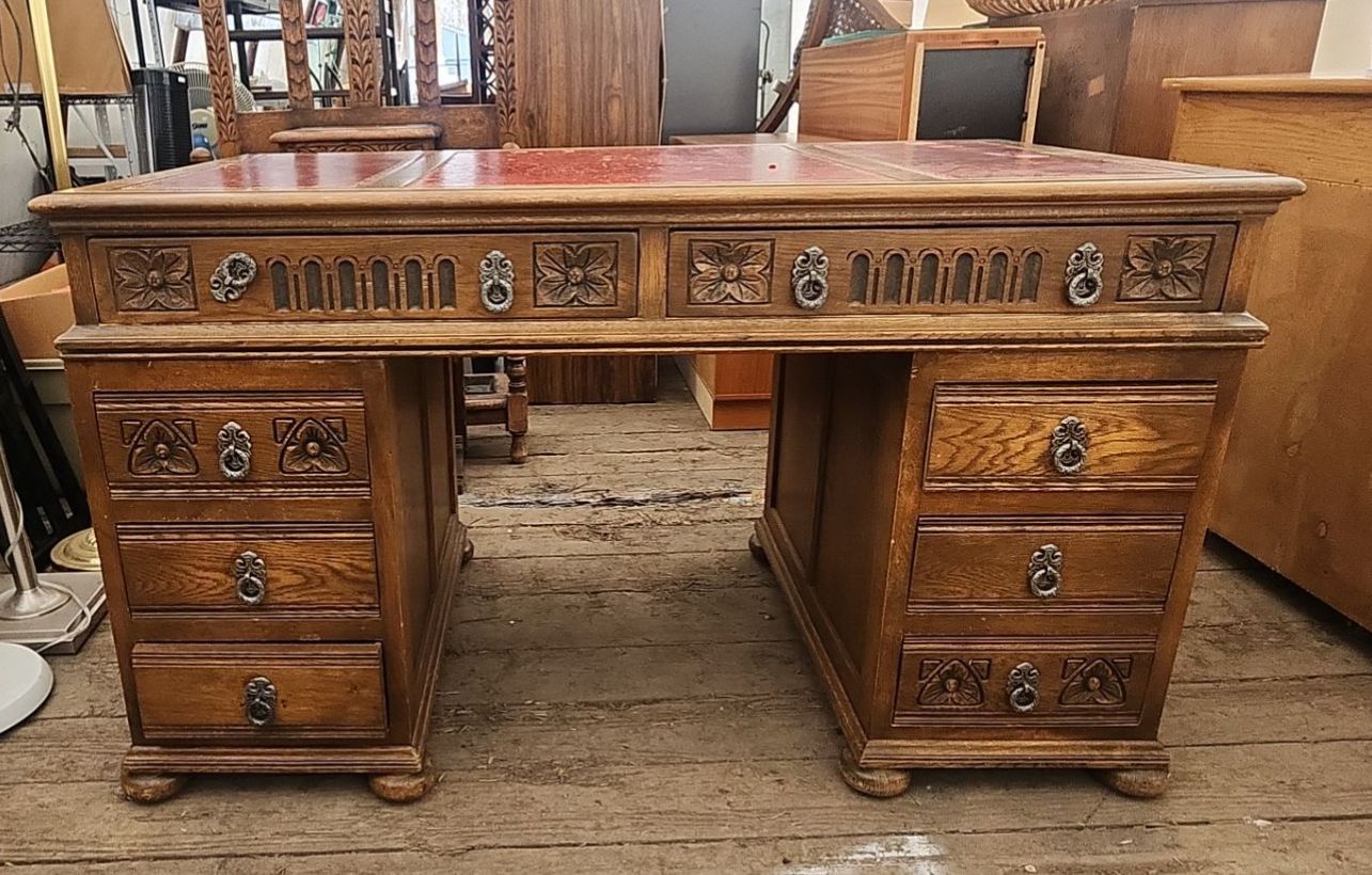 This desk features a striking red and gold top that adds a rich, elegant touch—perfect for both functional use and decorative display.