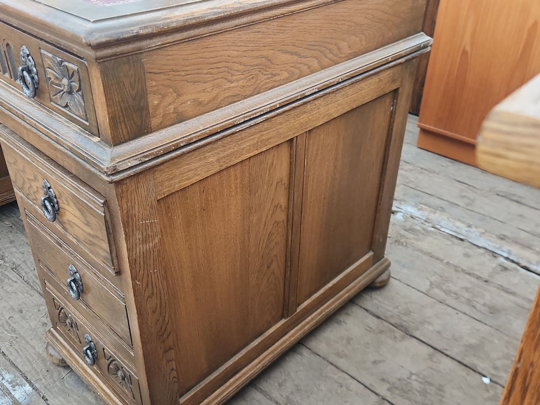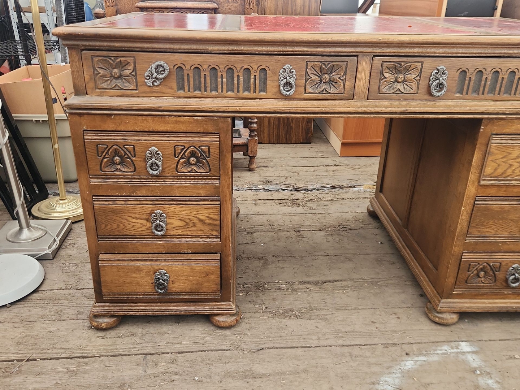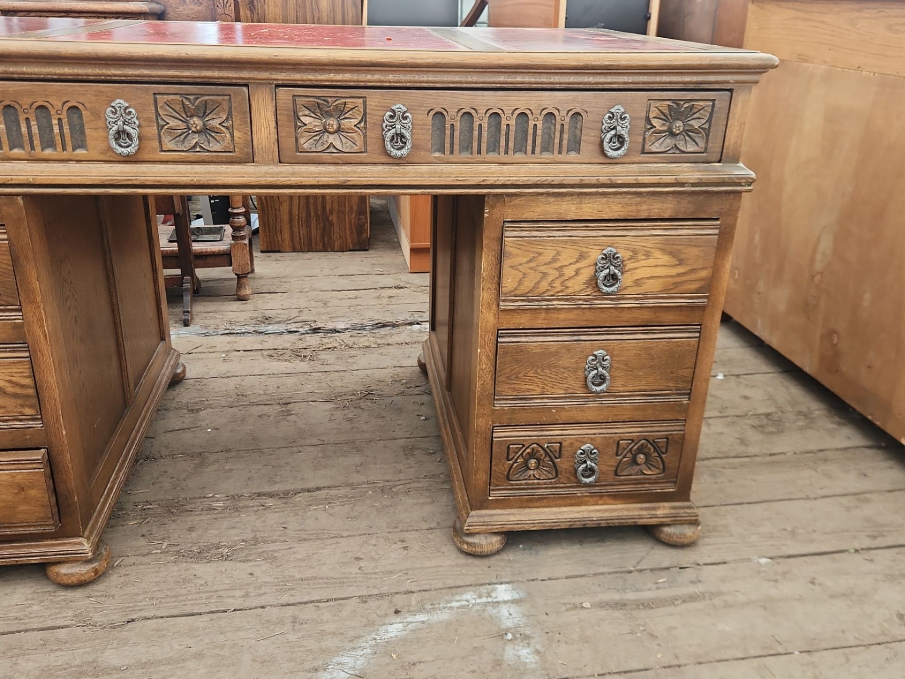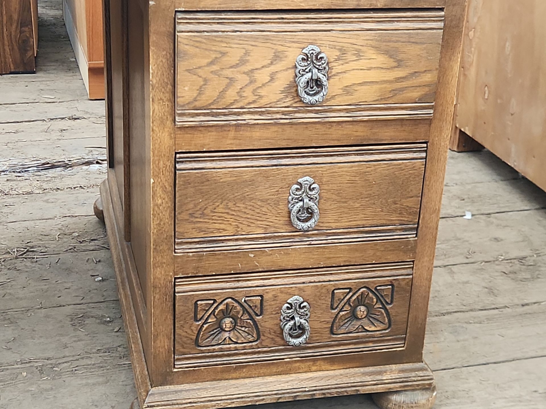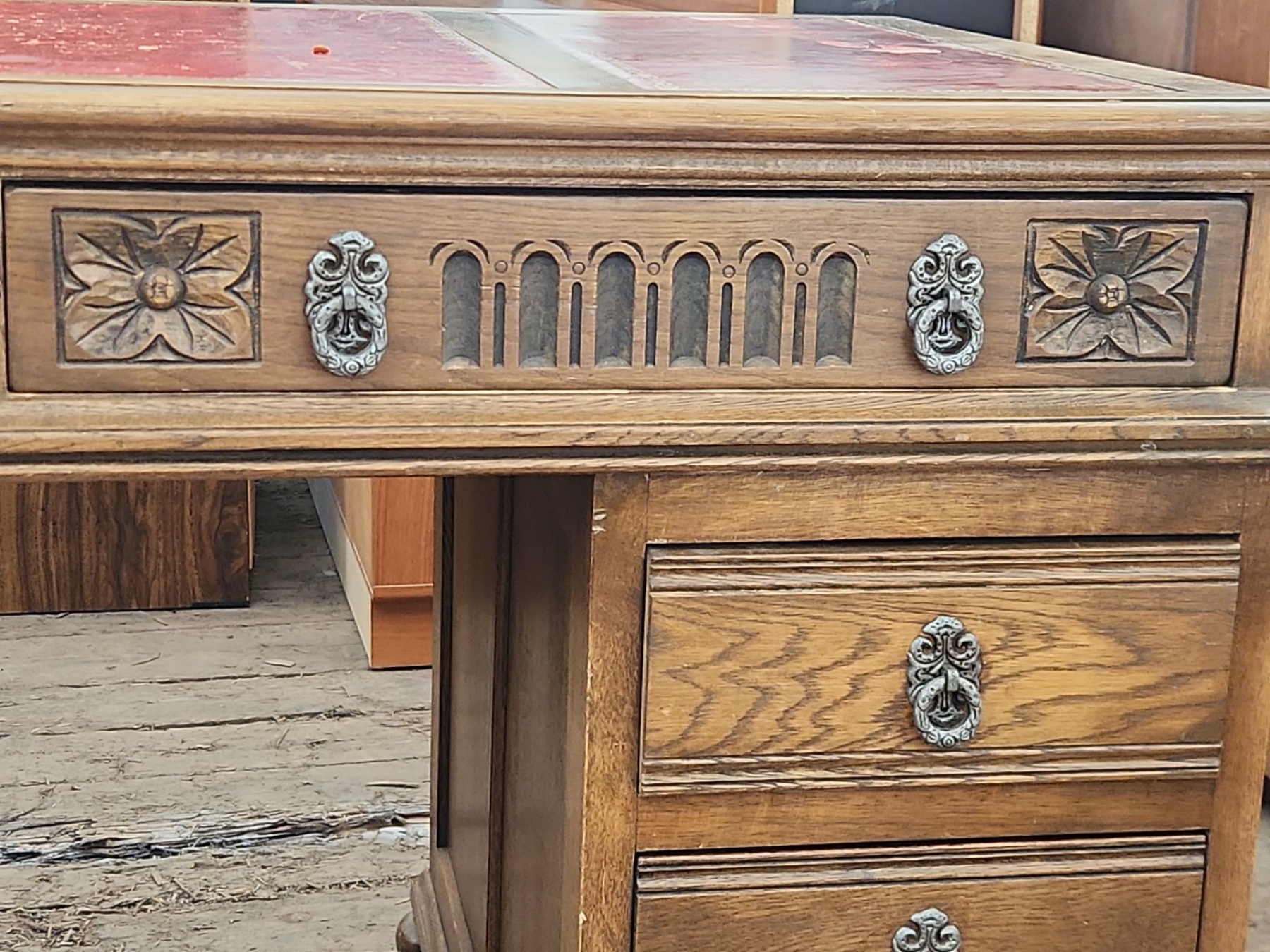Elevate any study, office, or reading nook with this stunning Old Charm Furniture by WoodBros 3-piece desk. Known for their exceptional craftsmanship and traditional English design, WoodBros pieces are cherished for their durability, carved details, and timeless appeal.