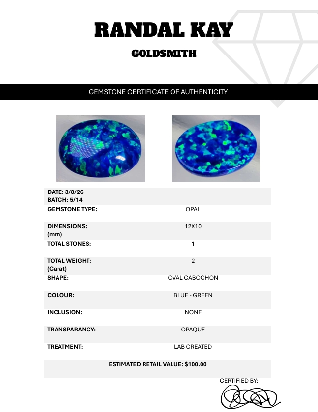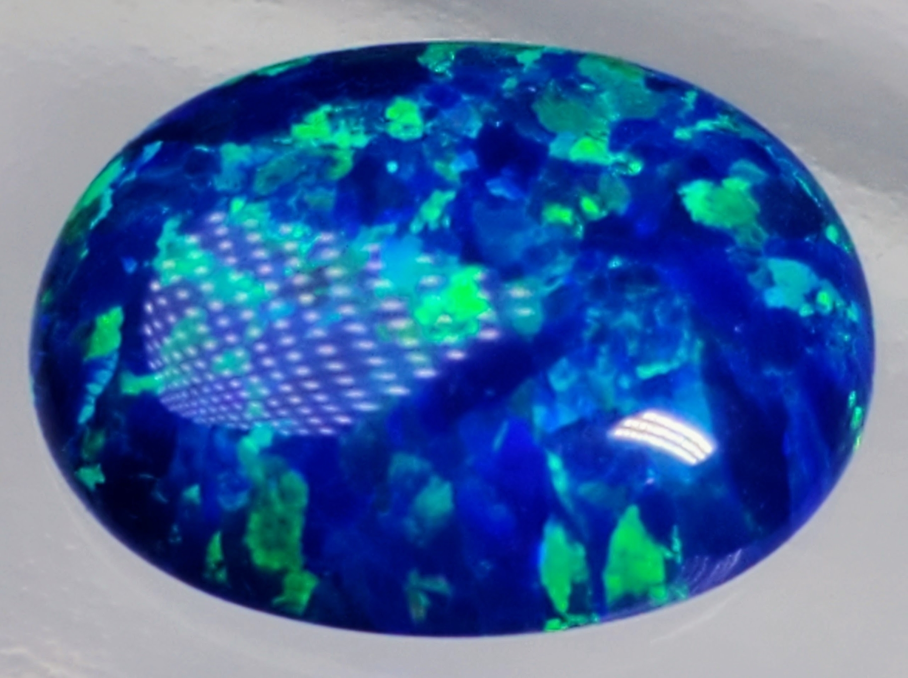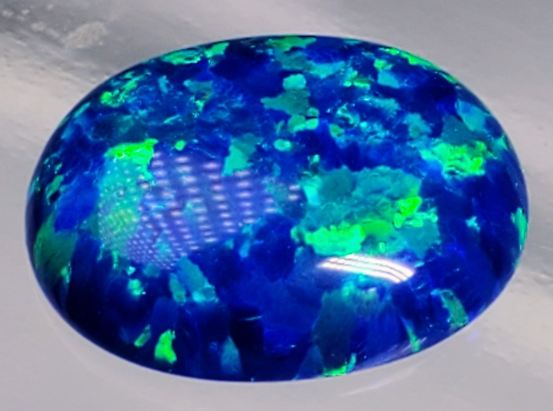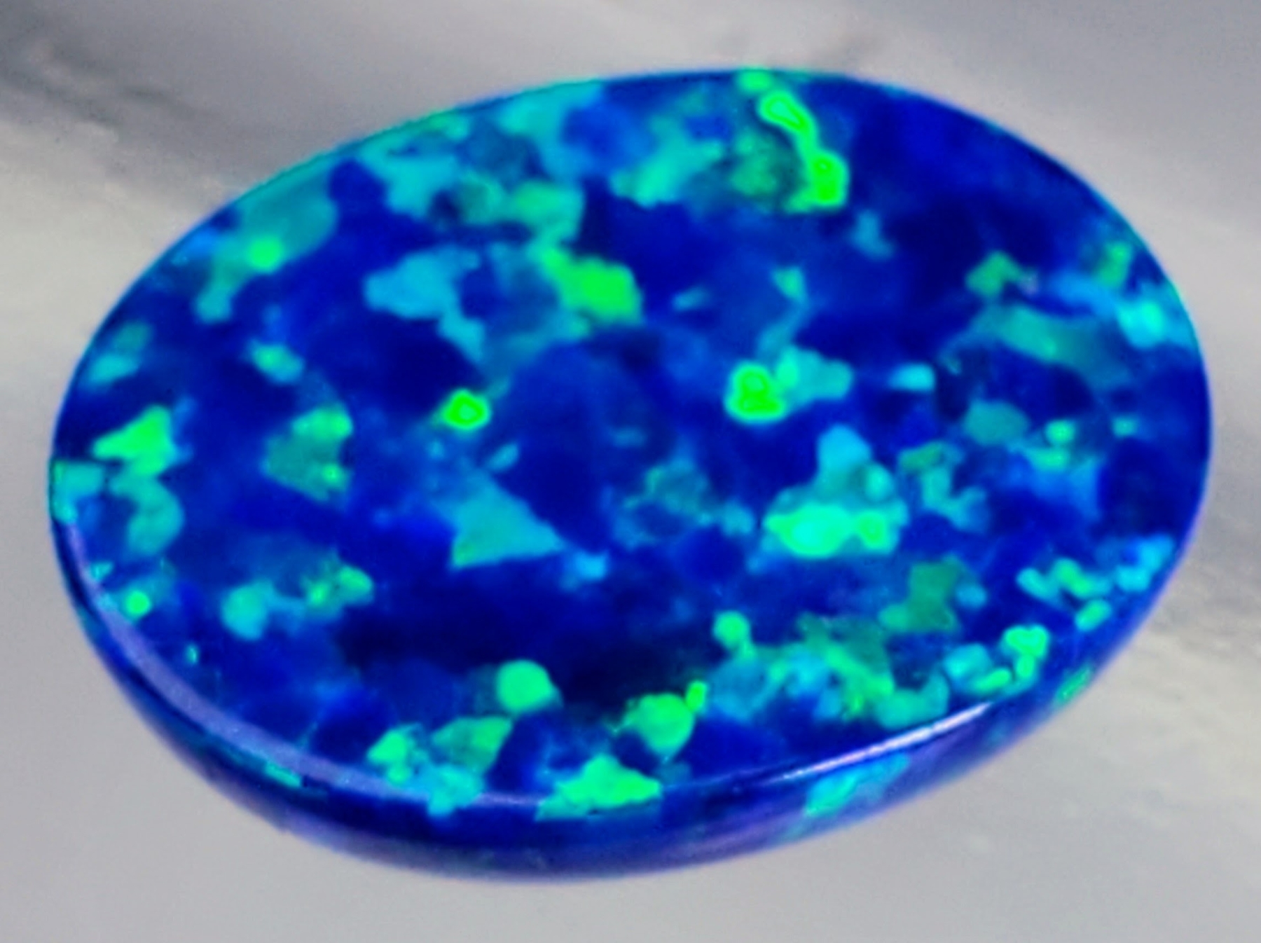 A 2-carat lab-created opal cabochon showing blue-green color, opaque body, and smooth oval dome. Bright and uniform. Estimated retail price is $100.