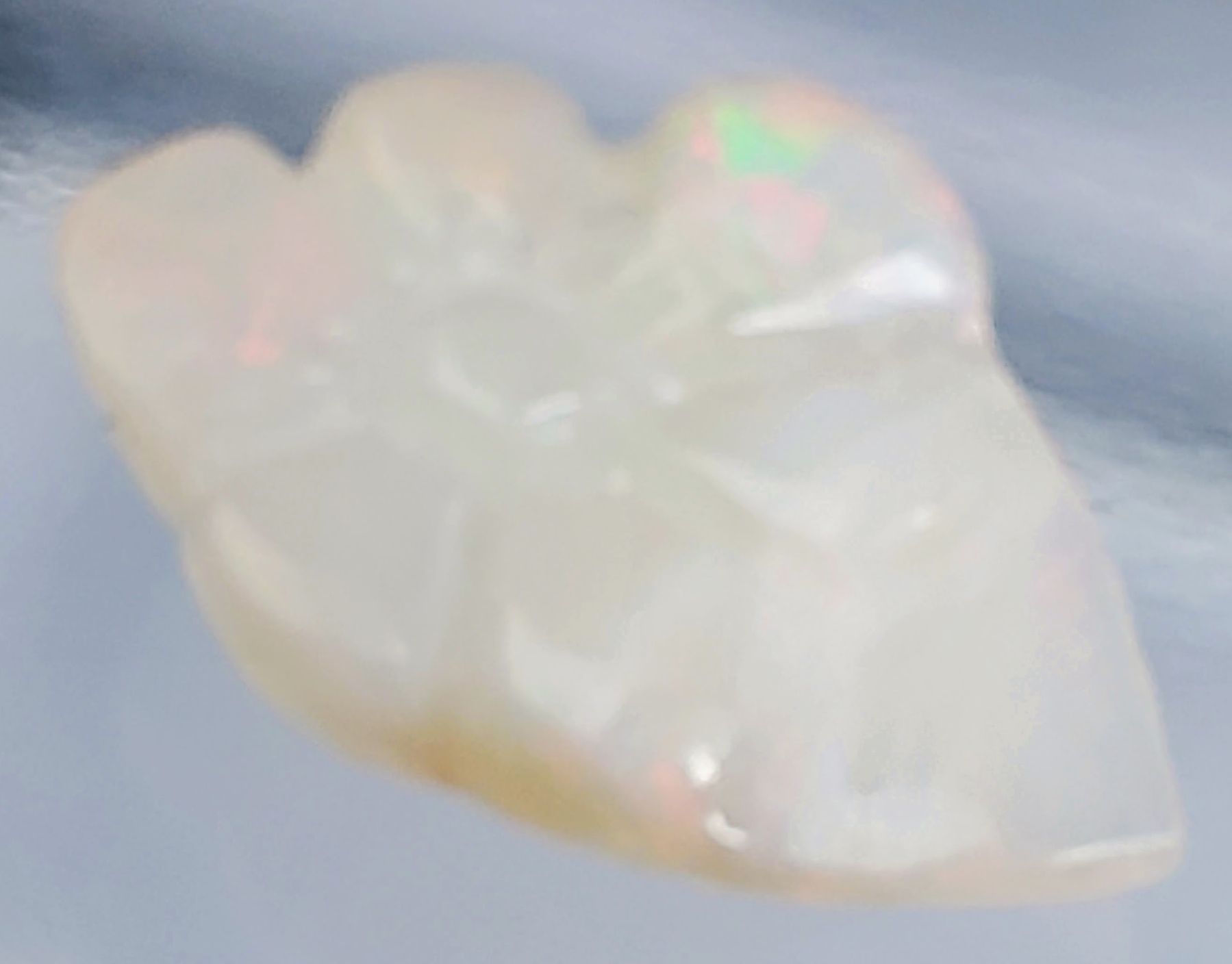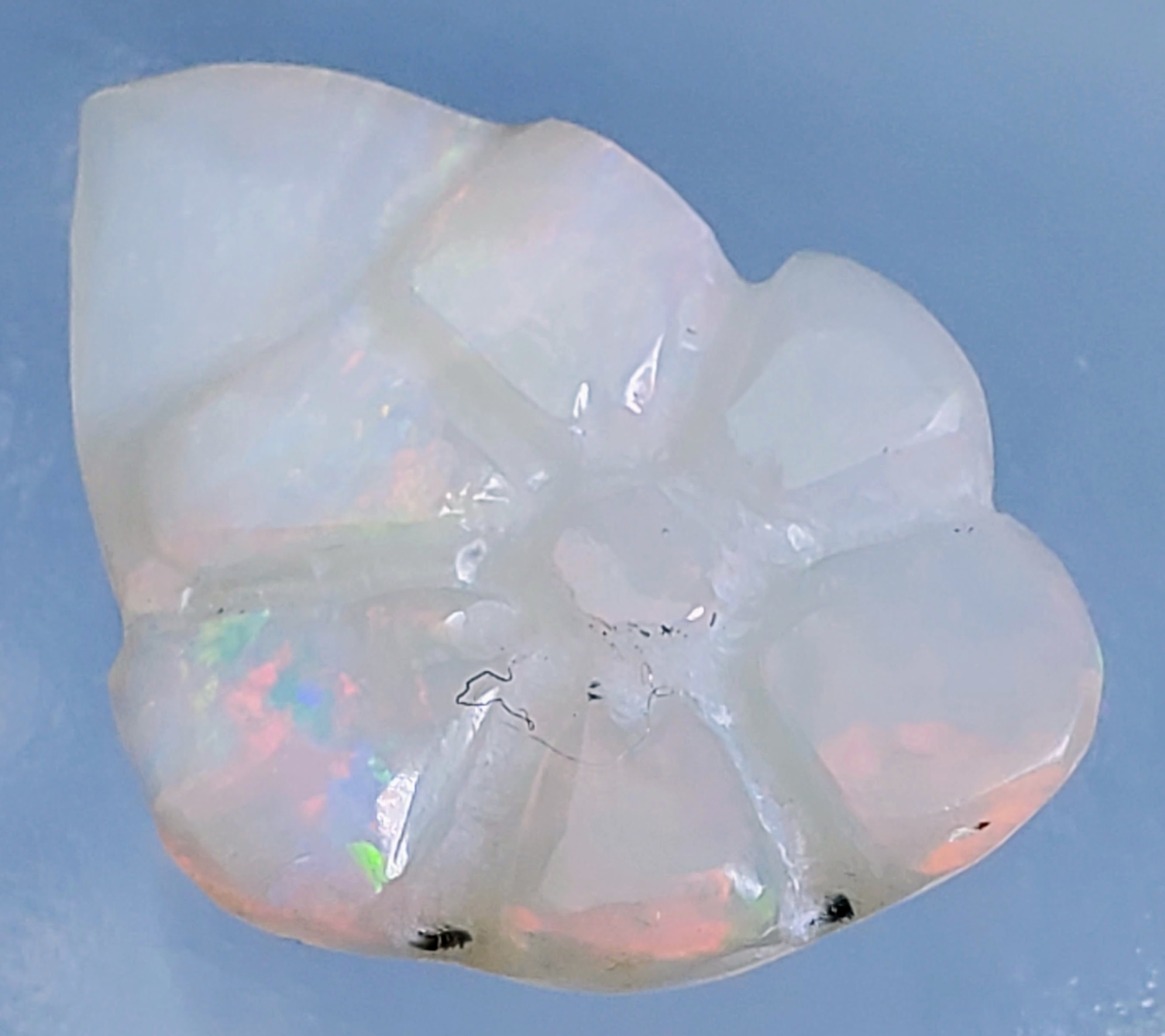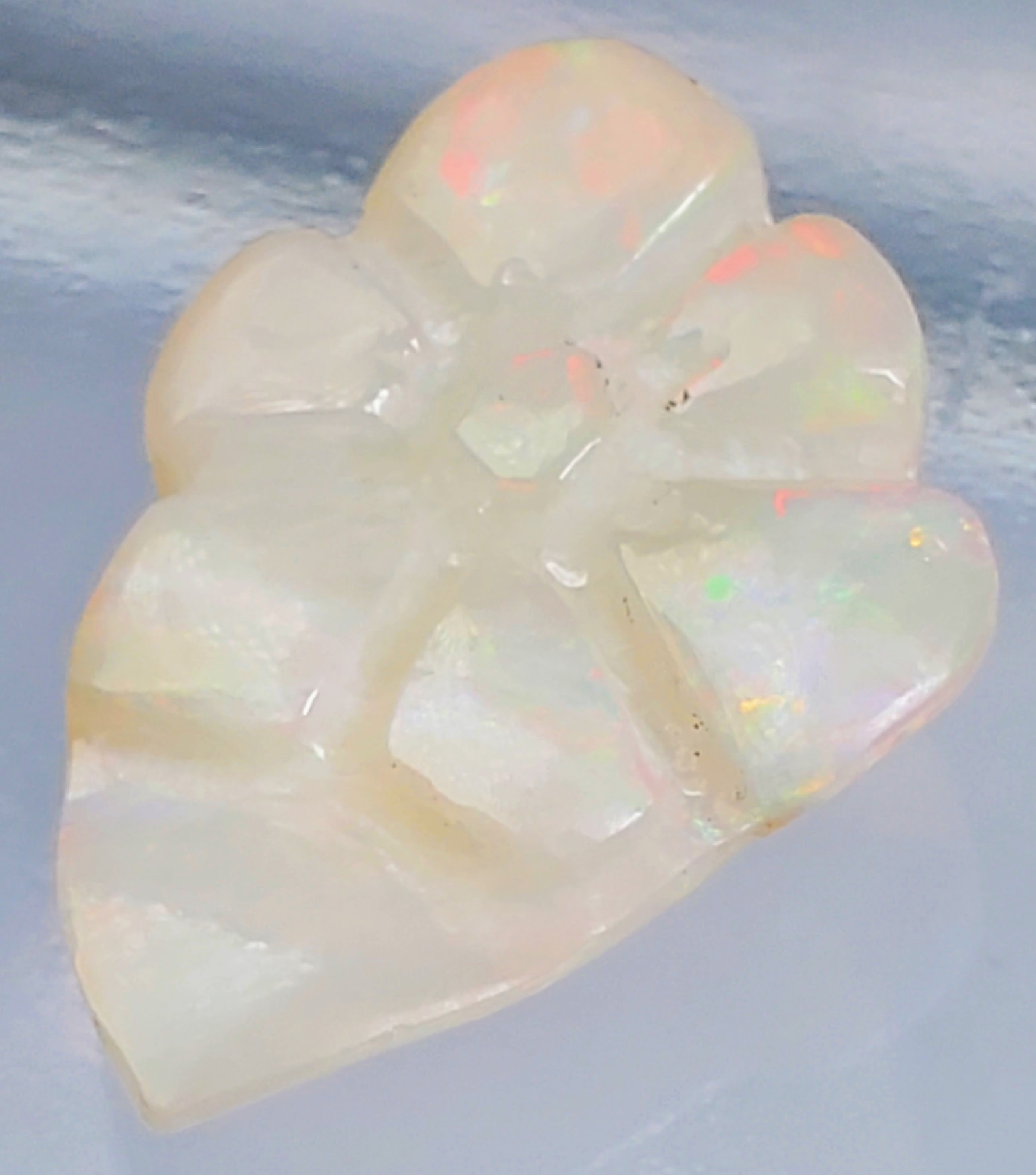 A 6-carat hand-cut opal cabochon featuring white and pink tones, opaque body, and freeform shape. Smooth polish and natural charm. Estimated retail price is $150.