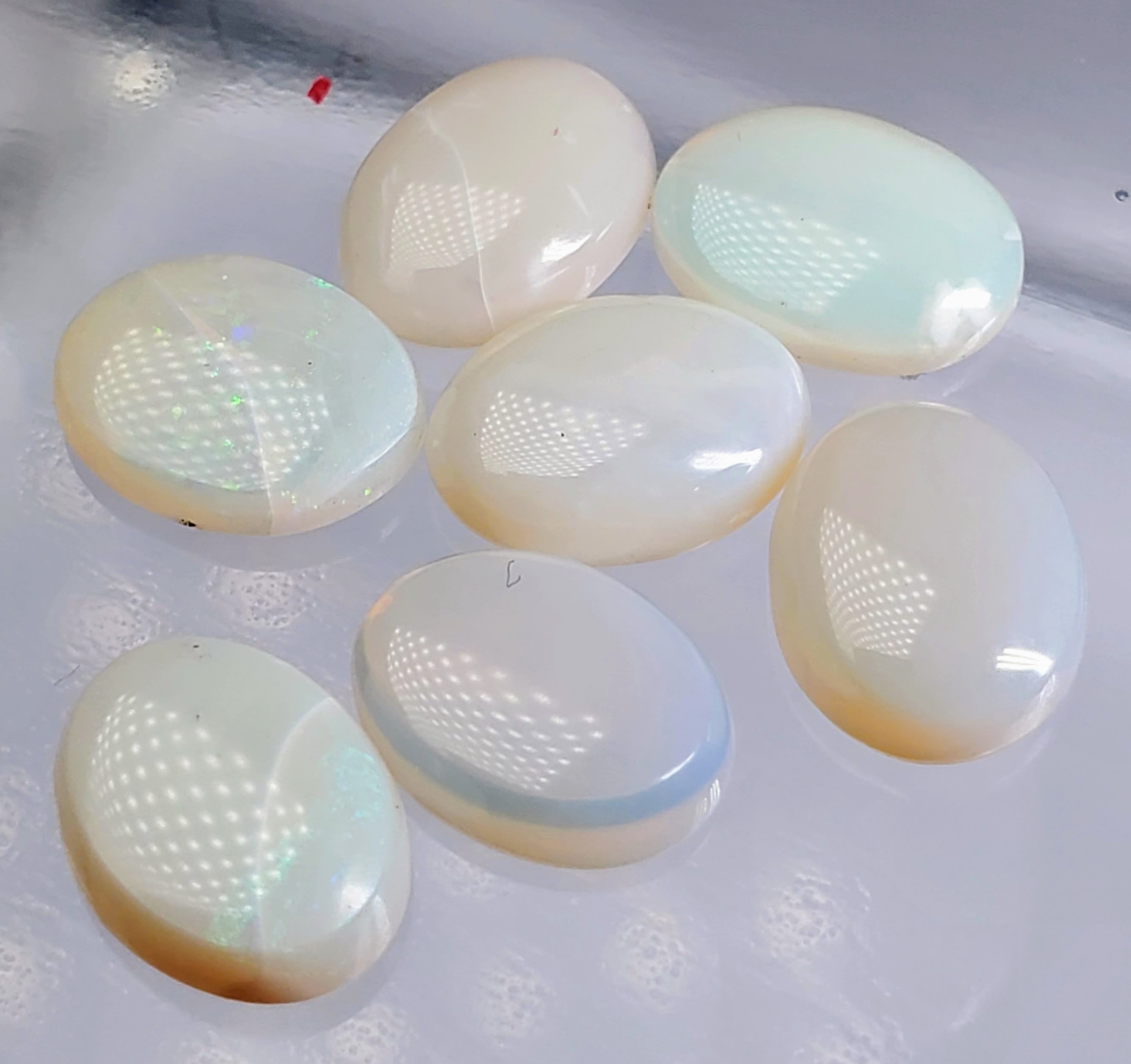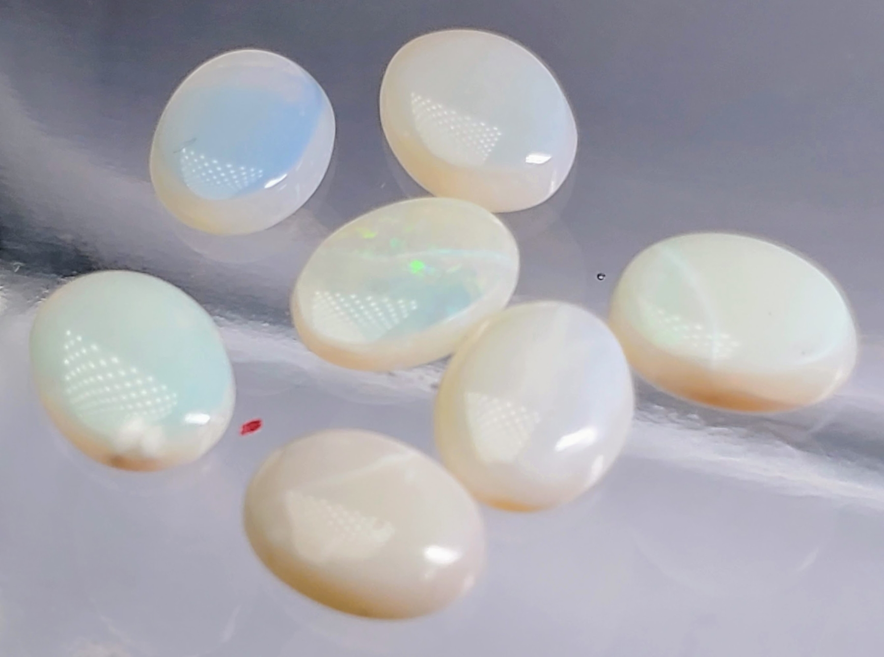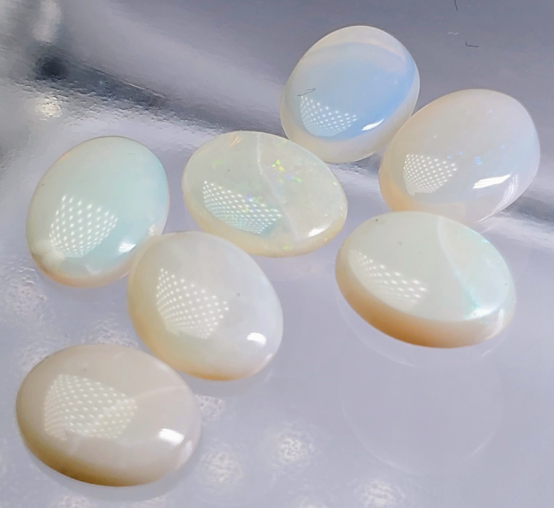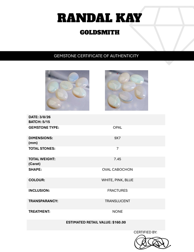 A seven-stone opal set totaling 7.45 carats, featuring white, pink, and blue tones with translucent bodies and natural fractures. Untreated and softly glowing. Estimated retail price is $160.