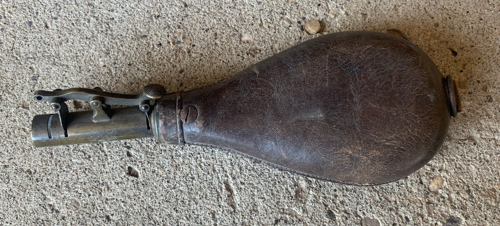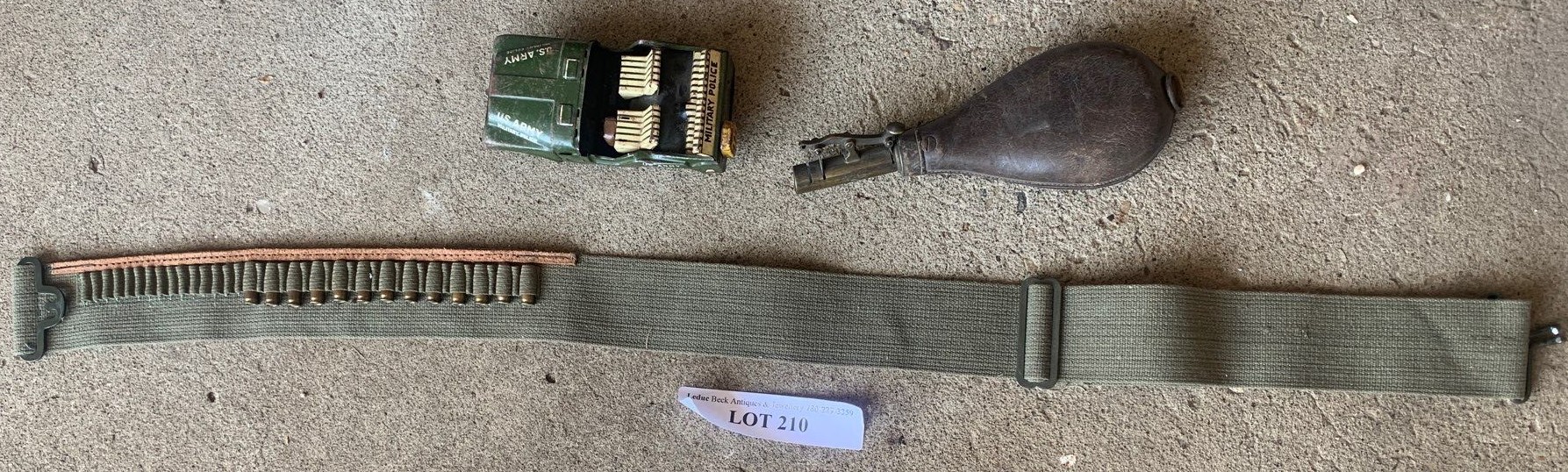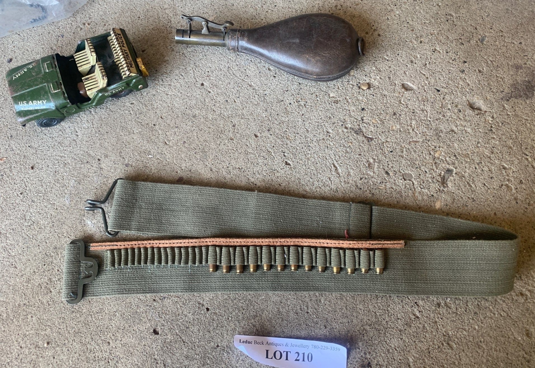 Original Leather Powder Flask, Green Military Belt Belt w Bullets, 1950's US Army Military Truck