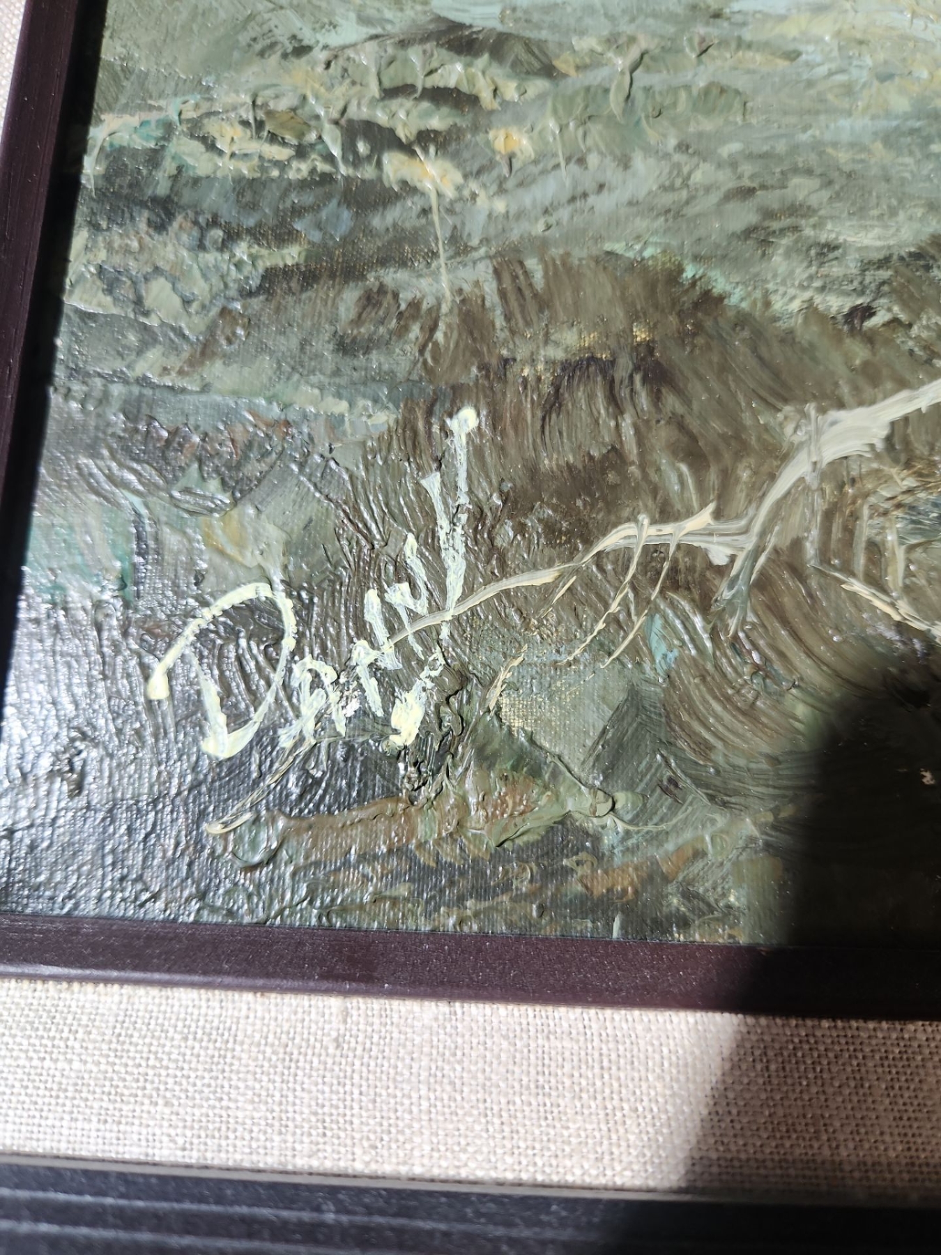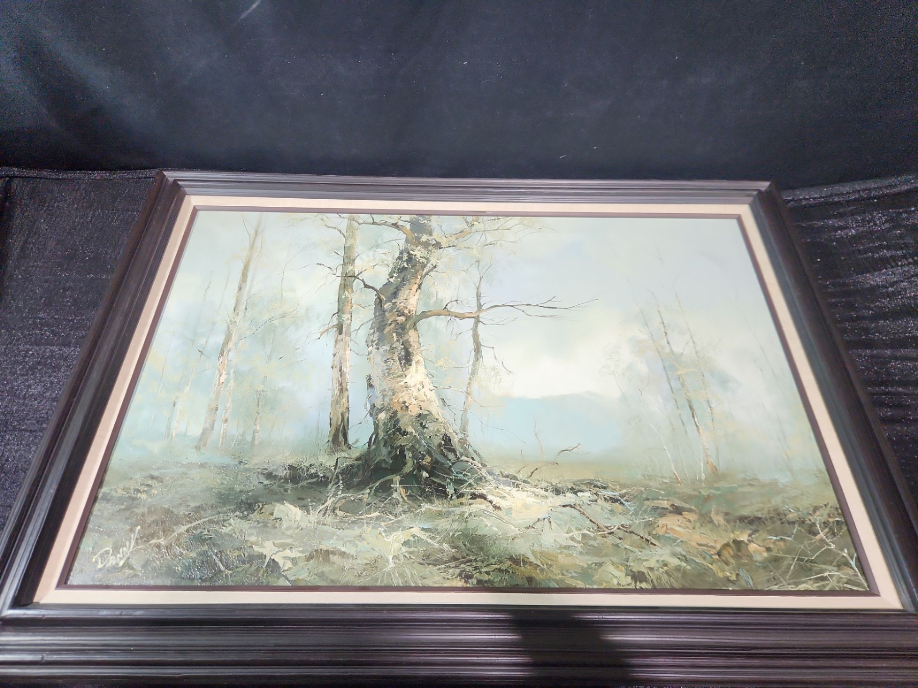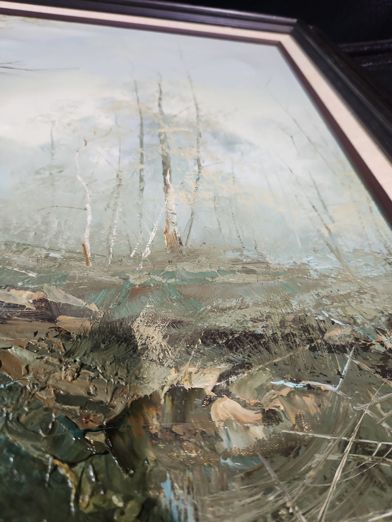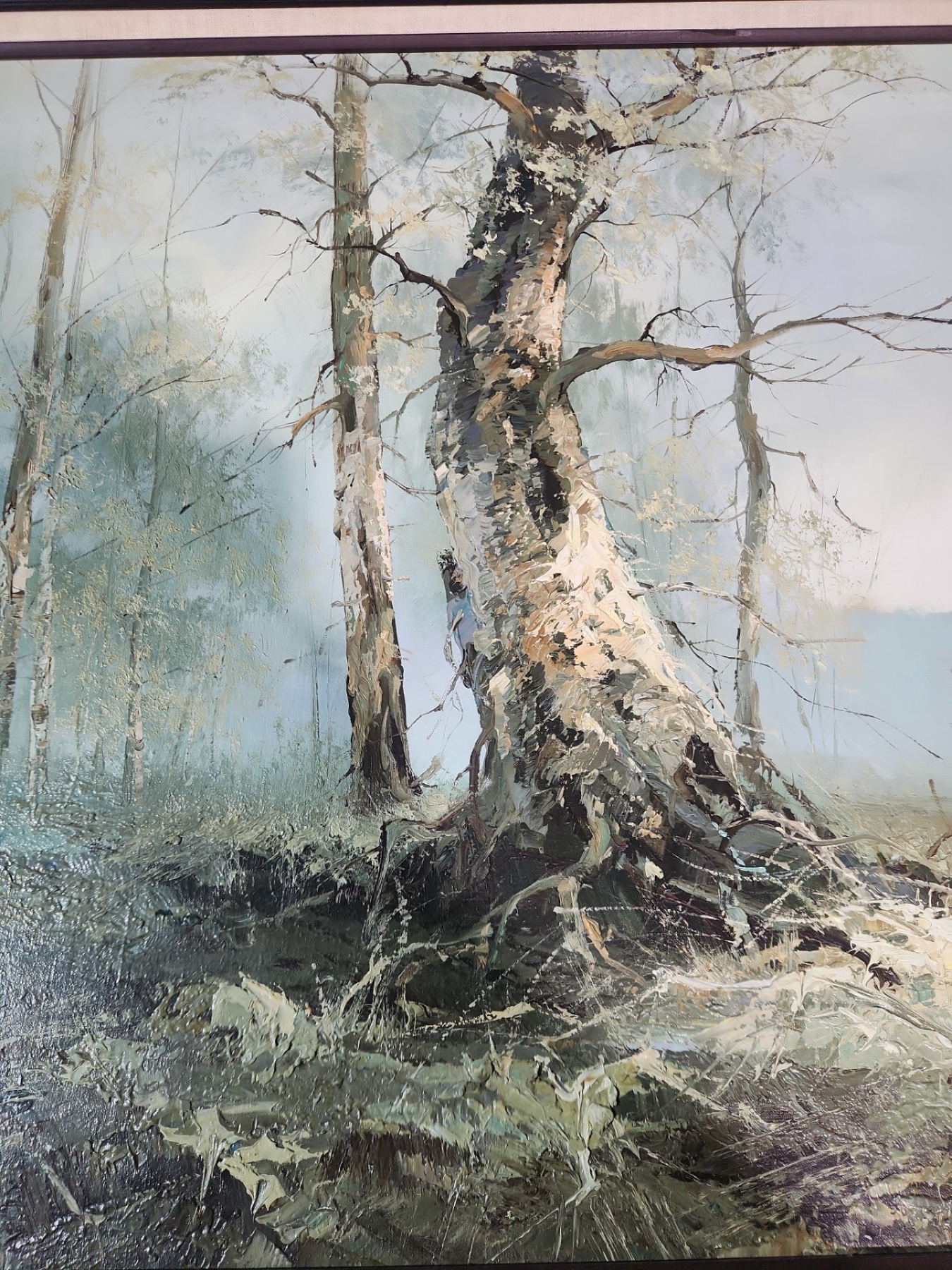 This is a framed painting of a winter landscape. The painting depicts a snowy, misty scene with bare tree branches.