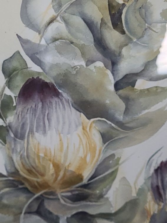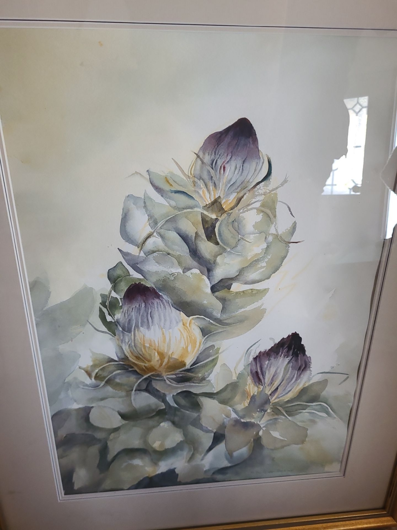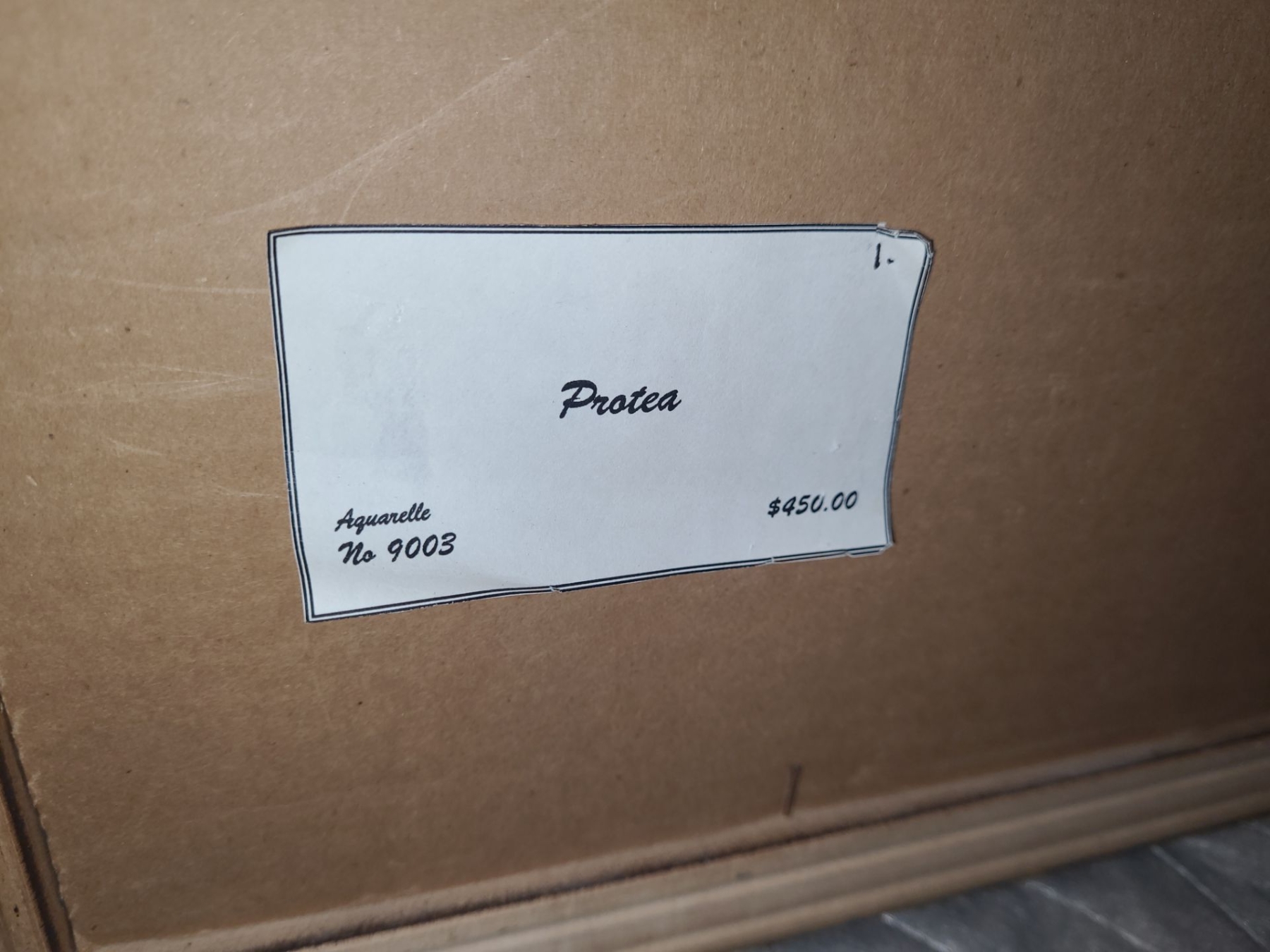 Original Protea Painting Framed Under Glass by Pierrette Dulude-Bohay 23 w 29 h