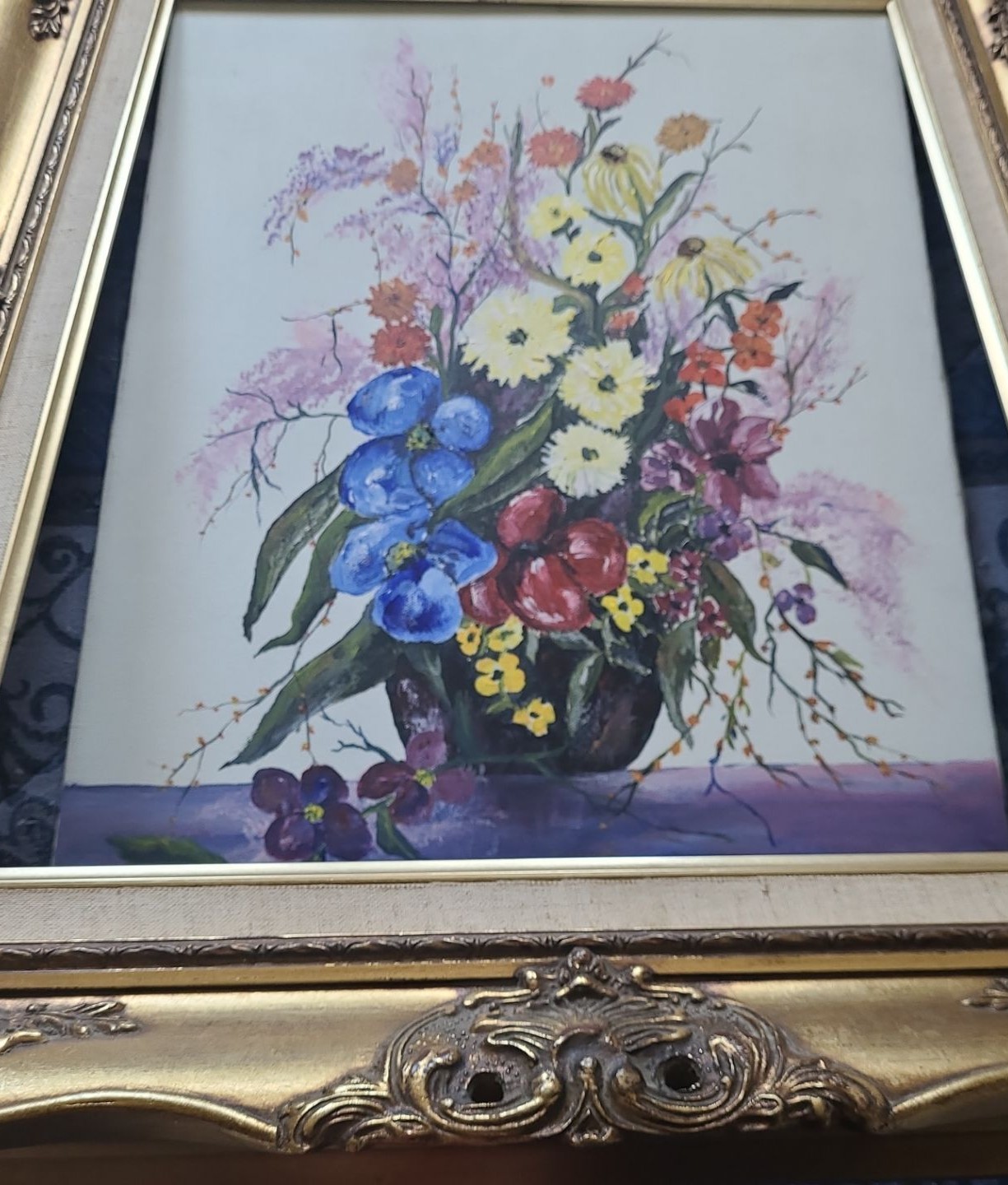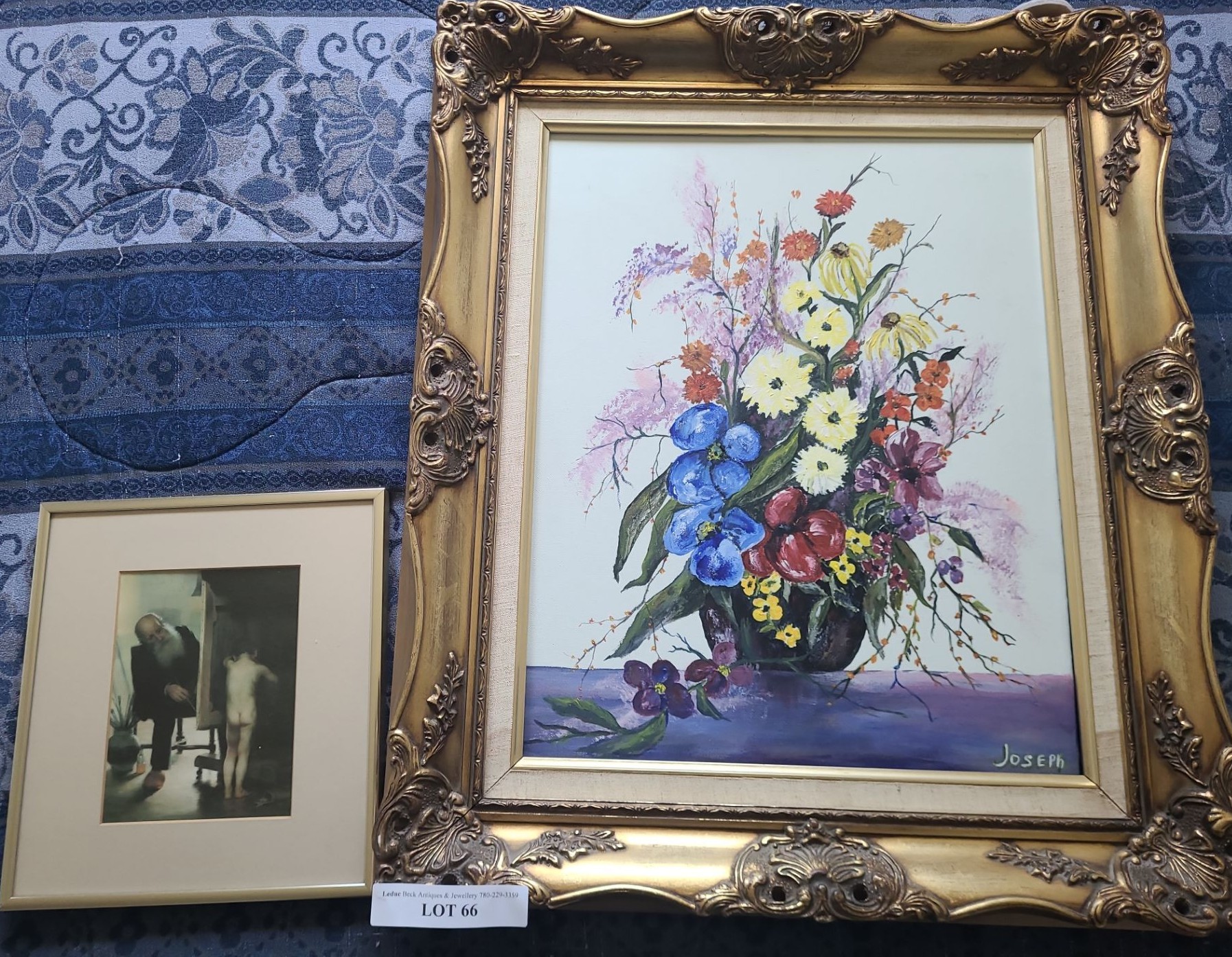Original Ray Joseph Painting of Flowers in Vase w Ornate Gold Frame & Paul Peel Print 10 w, 11 h