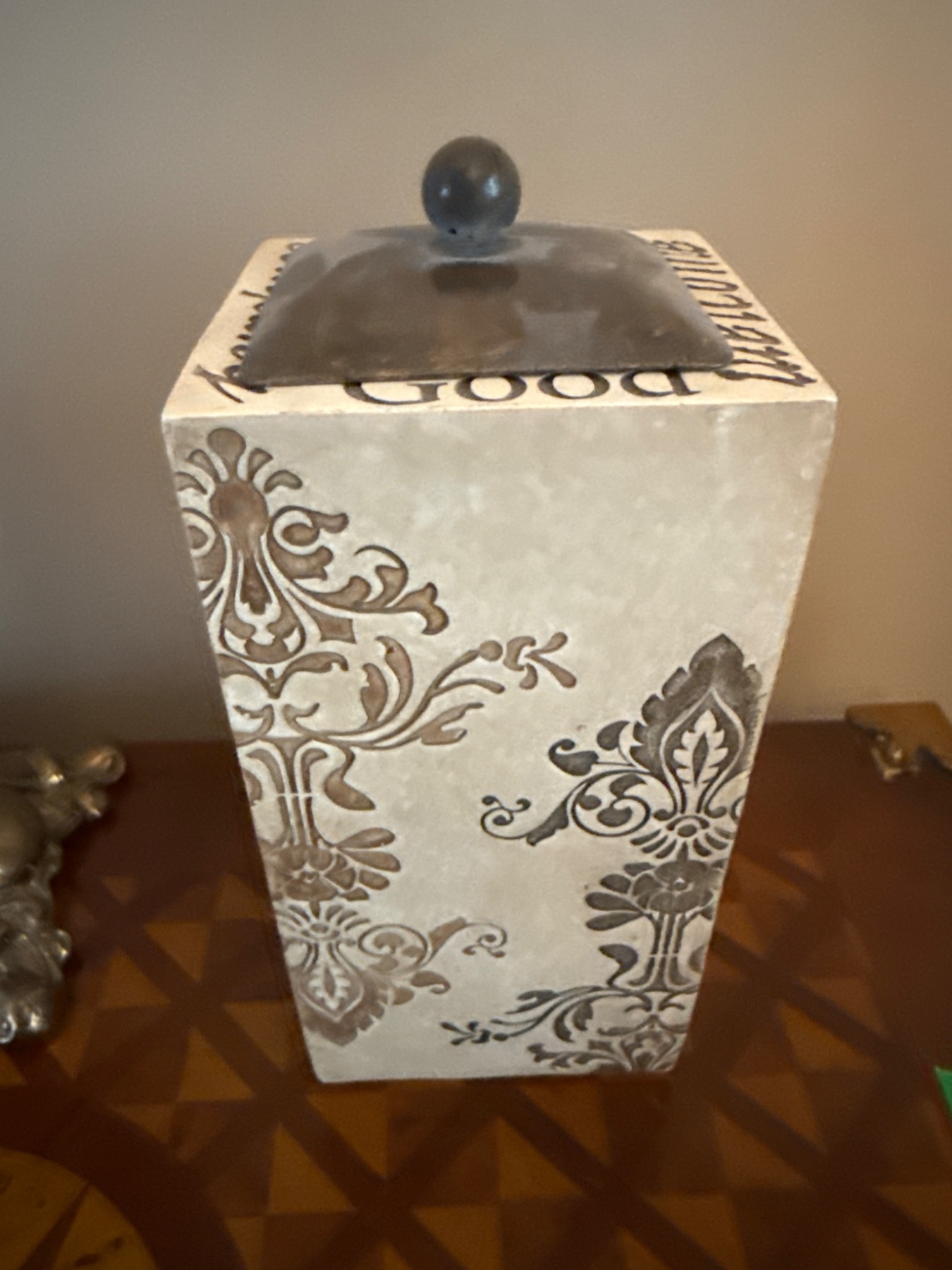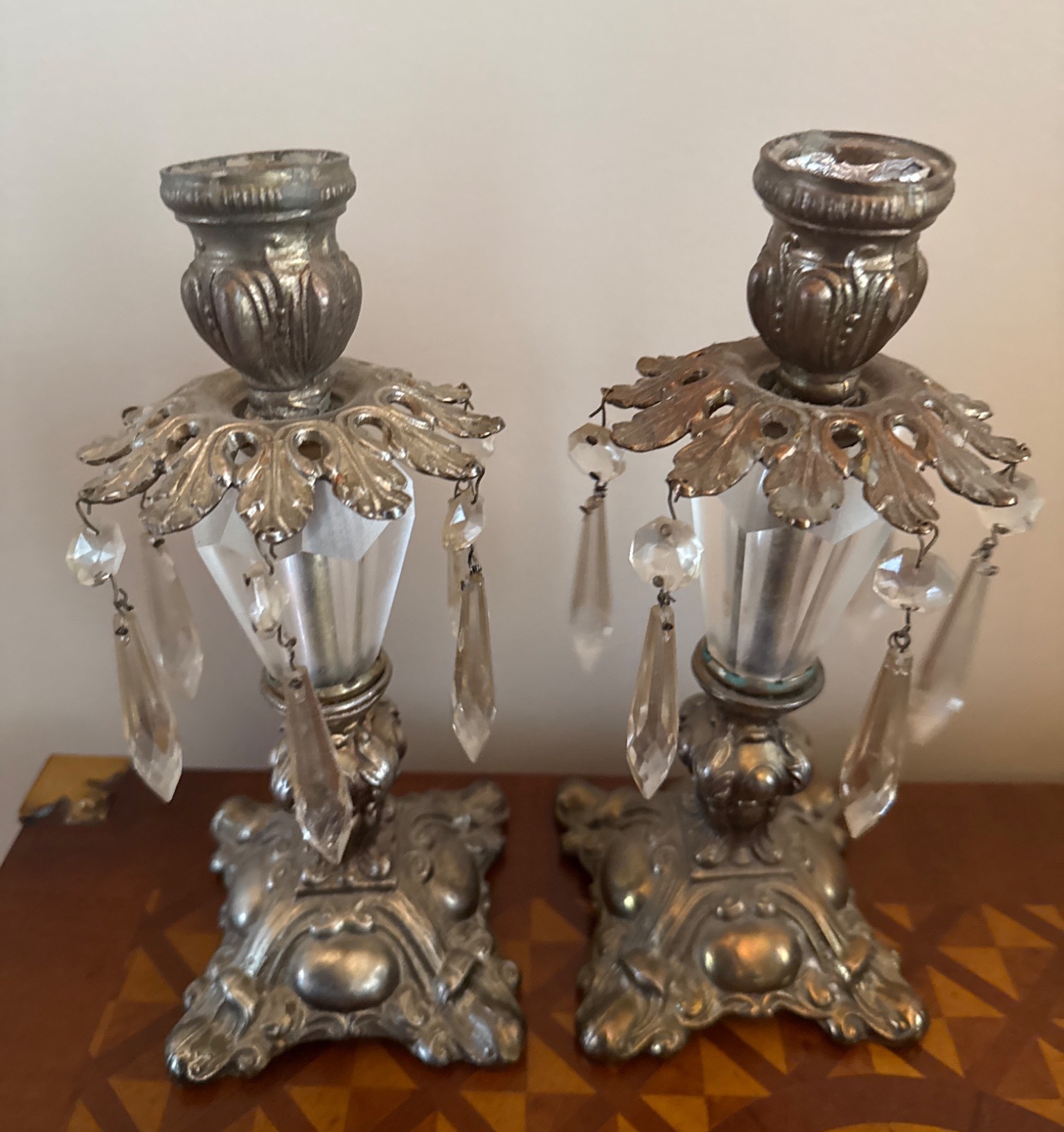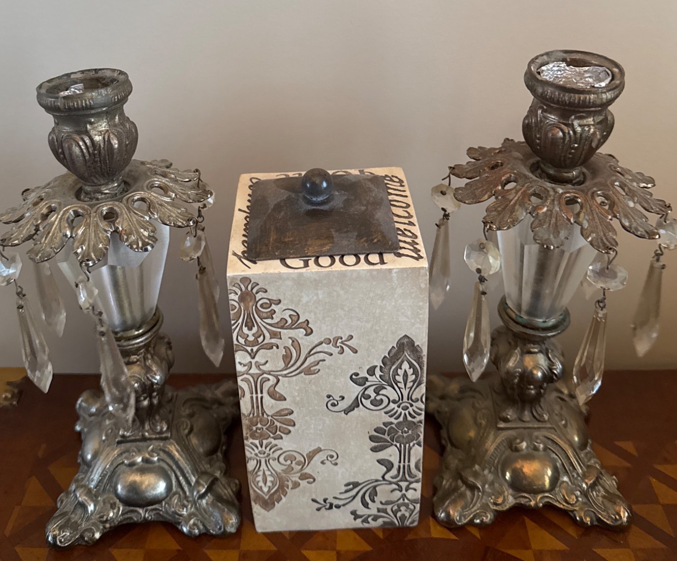 Intricately designed silver-toned metal candleholders featuring hanging crystal accents. Each candleholder sits on an ornate base and includes detailed floral motifs. Accompanied by a decorative rectangular box with an elegant floral pattern and domed lid. Candleholder dimensions approximately 10 inches in height. Box dimensions estimated around 8 inches tall.