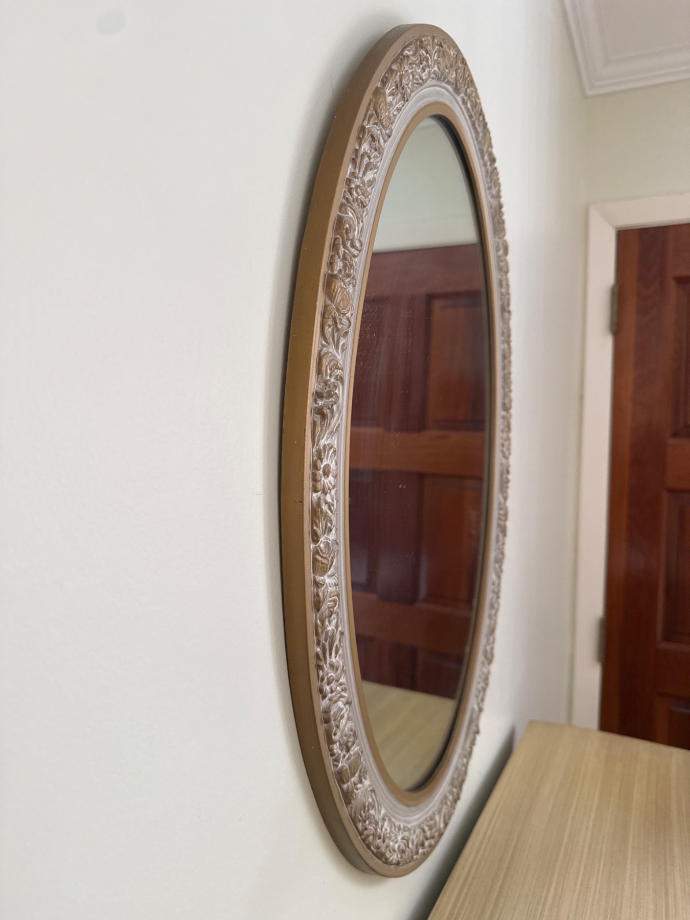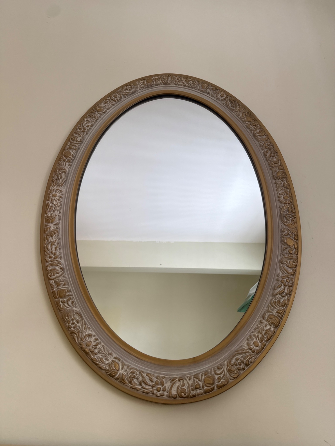 Oval wall mirror featuring an intricately decorated frame with a gold-toned finish and raised floral detailing. The frame's classic oval shape makes it suitable for a variety of wall spaces, while the ornate design adds a touch of elegance. Frame and mirror are in good condition with visible details. Approximate dimensions and additional condition specifics are recommended upon inquiry. 20 x 26“.