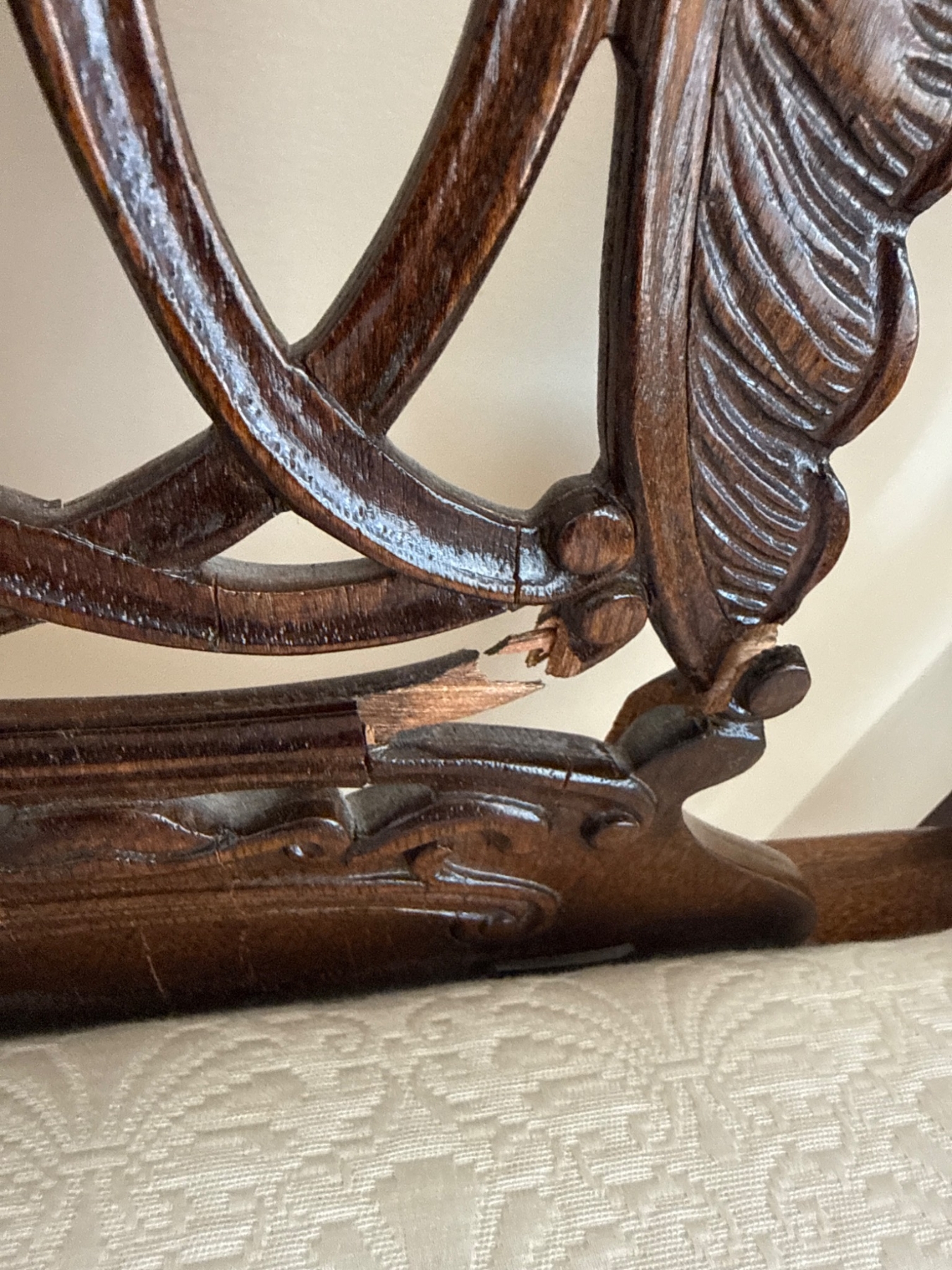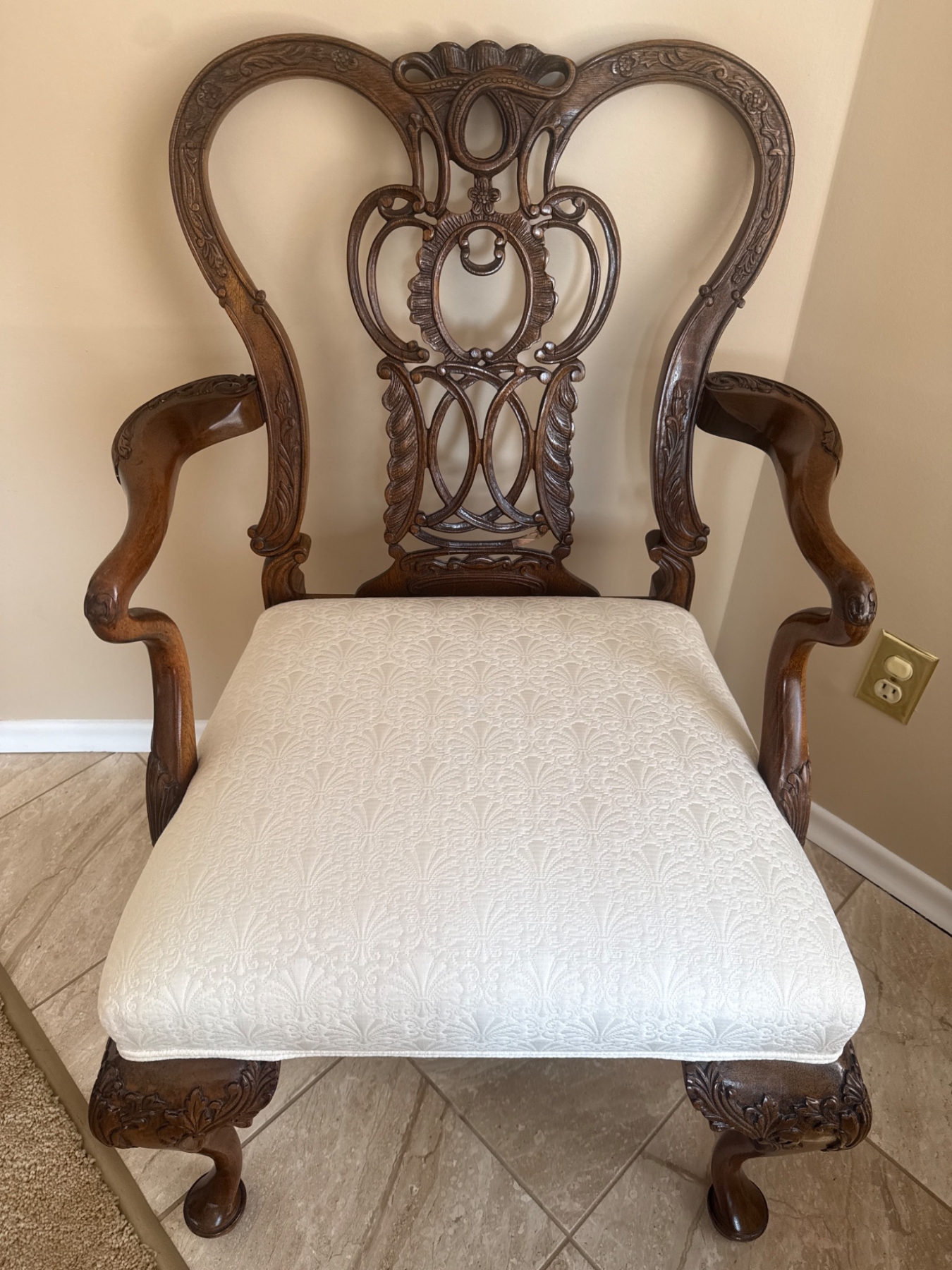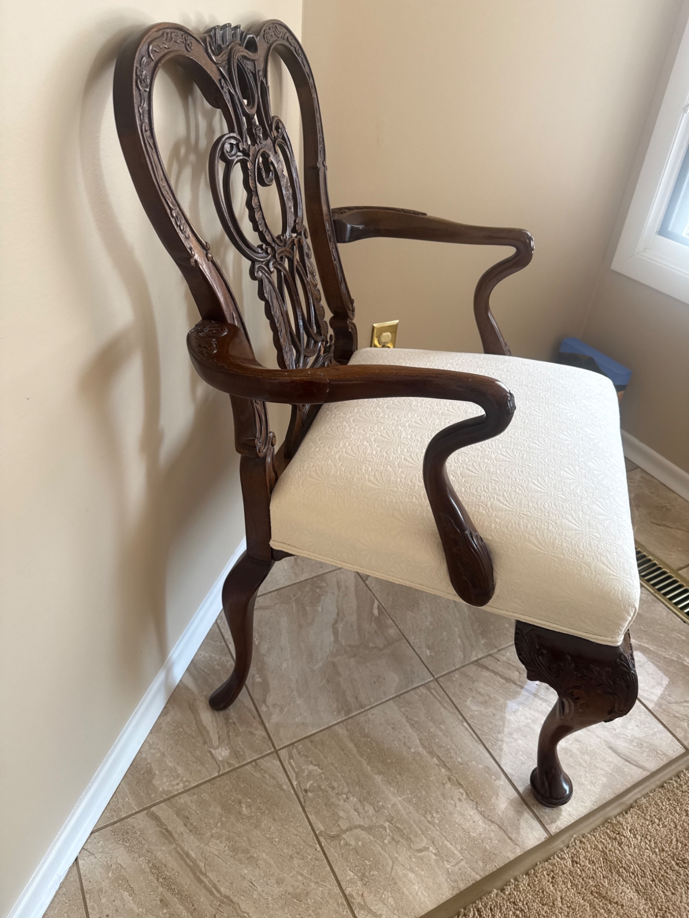 Ornate wooden armchair featuring intricately carved detailing on the backrest and arms, showcasing craftsmanship with floral designs. The chair includes a cushioned seat upholstered in a neutral fabric, providing comfort and style. Supported by cabriole-style legs, this chair is ideal for enhancing any room’s decor. 26 x 24 x 38†tall.  Small damage see picture…