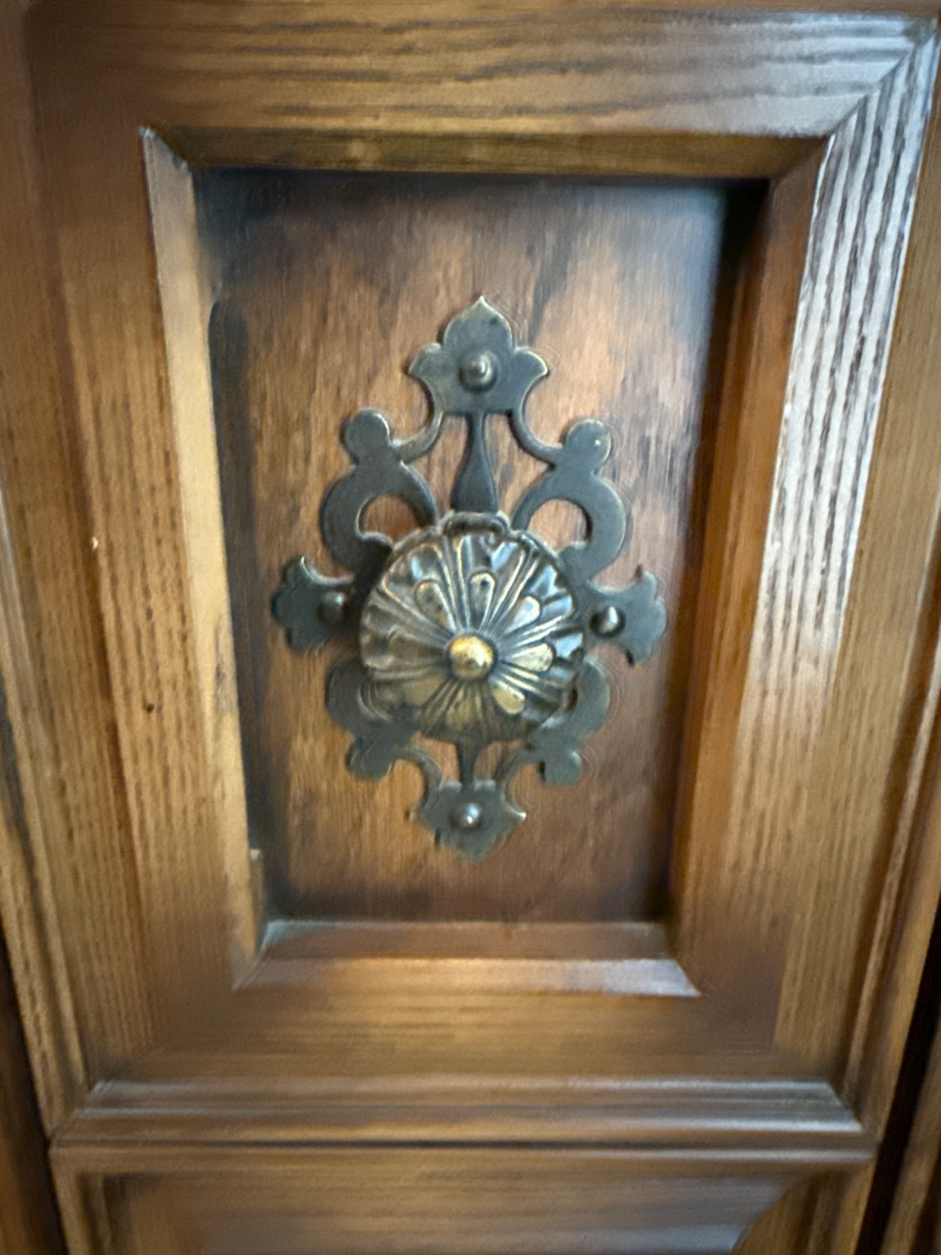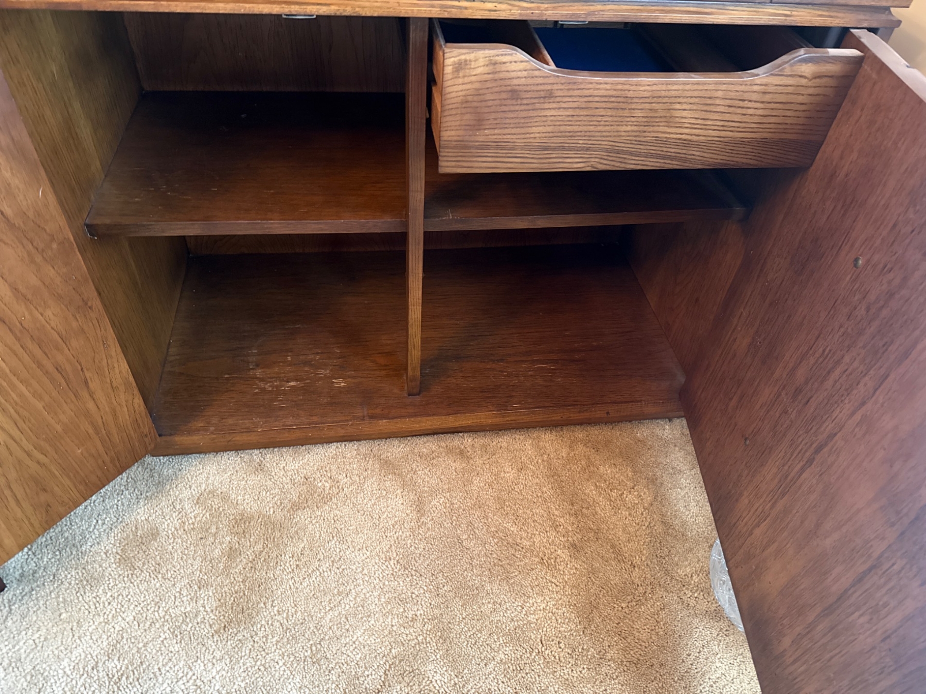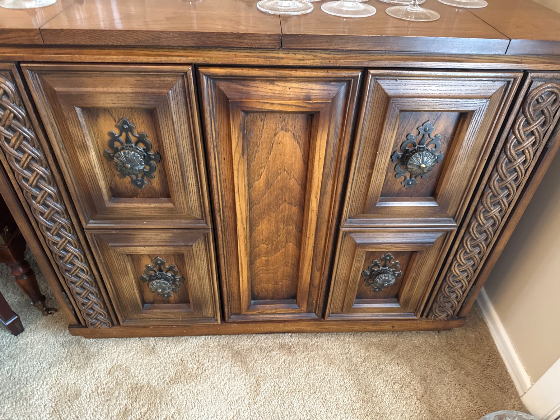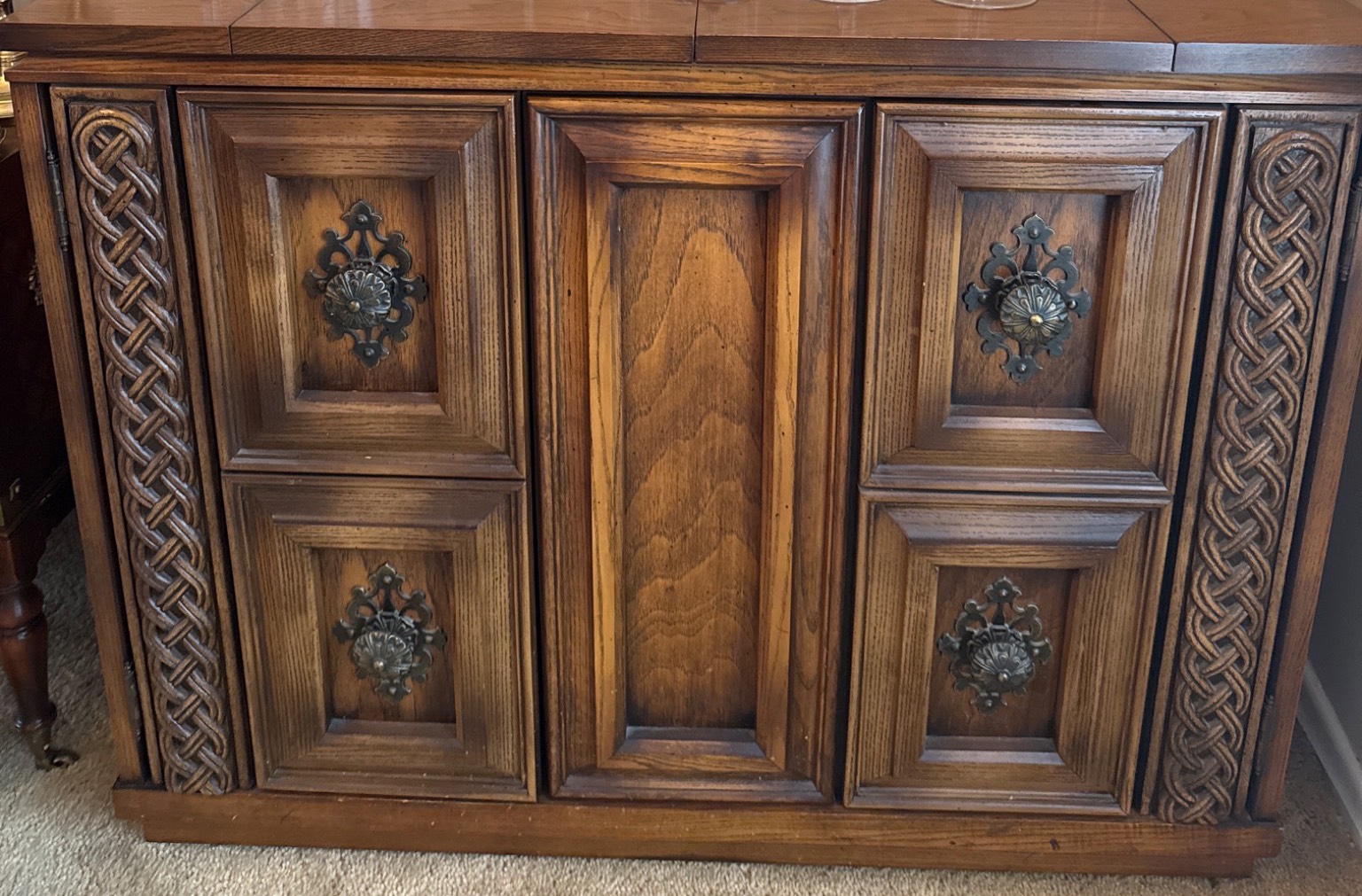 An attractive wooden cabinet featuring intricate braid-carved accents and decorative metal hardware. The piece includes two cabinet doors that open to reveal internal shelving and a drawer for versatile storage. The dimensions of the cabinet are not specified, but this item is a practical and timeless addition to any space. Perfect for storing tableware or other household items.