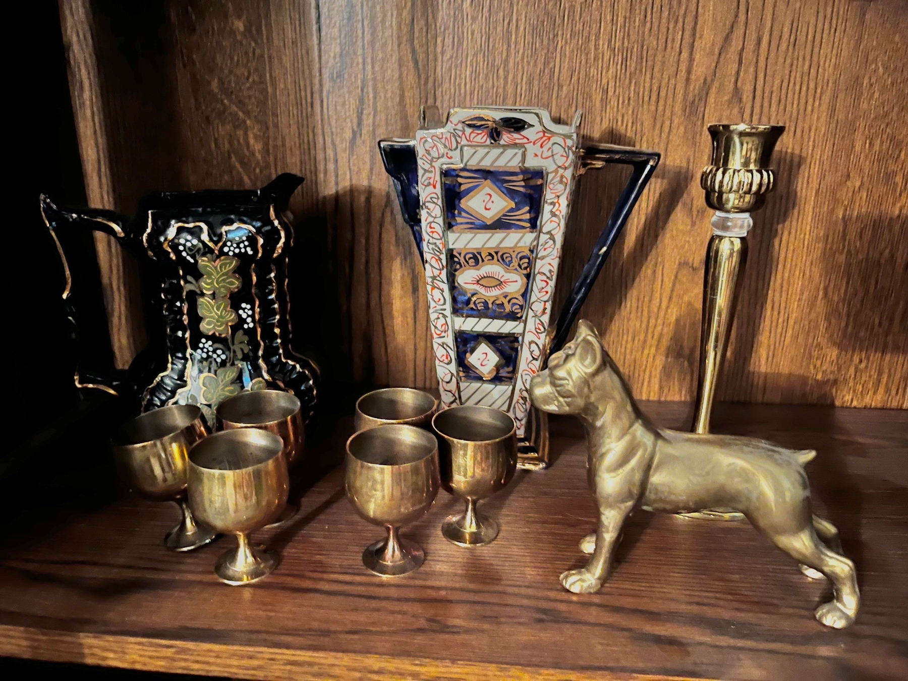 Ornate tea pots, and six small brass cups brass dog and candle holder